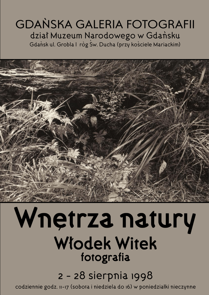 GDANSKA GALERIA FOTOGRAFII ` dzial Muzeum Narodowego w Gdansku ` Gdansk Mariackim) ` ul. Grobla I rog ` ` `Sw. Ducha (przy kosciele Wnetrza natury Wlodek Witek fotografia 2 - 28 sierpnia 1998 codziennie godz. 11-17 (sobota i niedziela do 16) w poniedzialki nieczynne