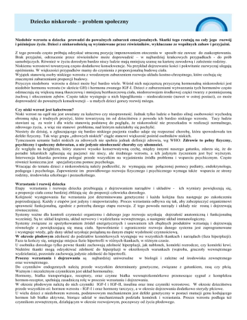 Dziecko niskorosłe – problem społeczny Niedobór wzrostu u dziecka prowadzi do powaŜnych zaburzeń emocjonalnych. Skutki tego rzutują na cały jego rozwój i późniejsze Ŝycie. Dzieci z niskorosłością są wyśmiewane przez rówieśników, wykluczane ze wspólnych zabaw i przyjaźni. Z tego powodu często próbują odzyskać utraconą pozycję imponowaniem otoczeniu w sposób nie zawsze do zaakceptowania. Brak przyjaźni, odrzucenie przez rówieśników moŜe doprowadzić – w najbardziej krańcowych przypadkach - do prób samobójczych. RównieŜ w Ŝyciu dorosłym bardzo niscy ludzie mają mniejszą szansę na karierę zawodową i załoŜenie rodziny. Niskiemu wzrostowi towarzyszą często dodatkowe konsekwencje. Na przykład dojrzewanie kości i pokwitanie zazwyczaj ulegają opóźnieniu. W większości przypadków mamy do czynienia z proporcjonalną budowę ciała. Wyjątek stanowią osoby niskiego wzrostu z wrodzonym zaburzeniem rozwoju układu kostno-chrzęstnego, które cechują się znacznymi zaburzeniami proporcji budowy. Przyczyn niedoboru wzrostu u dzieci moŜe być bardzo wiele. Wśród nich najczęstszą przyczyną hormonalną niskorosłości jest niedobór hormonu wzrostu (w skrócie GH) i hormonu zwanego IGF-I. Dzieci z zaburzeniami wytwarzania tych hormonów często odznaczają się większą masą tłuszczową i mniejszą beztłuszczową ciała, niedorozwojem środkowej części twarzy z pomniejszoną Ŝuchwą i stłoczeniem zębów. Często takŜe występuje u nich hipoglikemia – niedocukrzenie (nawet w ostrej postaci), co moŜe doprowadzić do powaŜnych konsekwencji – u małych dzieci gorszy rozwój mózgu. Czy niski wzrost jest kalectwem? Niski wzrost na ogół nie jest uwaŜany za kalectwo czy niesprawność. Jednak tylko ludzie o bardzo silnej osobowości wychodzą obronną ręką z trudnych przeŜyć, które towarzyszą im od dzieciństwa z powodu ich bardzo niskiego wzrostu. Tacy ludzie stawiani są za wzór i dla wielu stanowią podstawę do poglądu, Ŝe niskorosłość nie przeszkadza w realizacji normalnego, zdrowego Ŝycia, a więc nie stanowi problemu, nad którym naleŜałoby się pochylić. Niestety do dzisiaj, u zgłaszającego się bardzo niskiego pacjenta rzadko udaje się rozpoznać chorobę, która spowodowała ten defekt fizyczny. Tak więc grupa „zdrowych niskich” ciągle stanowi większość pośród osobników niskich. Tymczasem uznanie ludzi niskich za zdrowych nie spełnia jednak definicji zdrowia, wg WHO: Zdrowie to pełny fizyczny, psychiczny i społeczny dobrostan, a nie jedynie nieobecność choroby czy ułomności. Ze względu na heightizm, który stanowi wysoko konserwatywną cechę, między innymi naszego gatunku, zdarza się, Ŝe do poradni lekarskich zgłaszają się pacjenci nie niscy, ale średniego wzrostu, a ich jedynym Ŝyczeniem jest być wyŜszym. Interwencja lekarska powinna polegać przede wszystkim na wyjaśnieniu źródła problemu i wsparciu psychicznym. Często równieŜ konieczna jest specjalistyczna pomoc psychologa. Wracając do tematu dzieci z niskorosłością naleŜy podkreślić, Ŝe wymagają one połączonej pomocy pediatry, endokrynologa, pedagoga i psychologa. Zapewnienie im prawidłowego rozwoju fizycznego i psychicznego wymaga takŜe wsparcia ze strony rodziny, środowiska szkolnego i pozaszkolnego. Wzrastanie i rozwój dziecka Etapy wzrastania i rozwoju dziecka przebiegają z dojrzewaniem narządów i układów - ich wymiary powiększają się, a proporcje ciała coraz bardziej zbliŜają się do proporcji człowieka dorosłego. Kolejność występowania faz wzrastania jest determinowana genetycznie i kaŜda kolejna faza następuje po zakończeniu poprzedzającej. KaŜdy z etapów jest jedyny i niepowtarzalny. Proces wzrastania odbywa się tak, aby zabezpieczyć organizmowi sprawność funkcjonalną, zgodnie z potrzebą danego etapu rozwoju. Z tego powodu narządy i układy nie rosną i dojrzewają równocześnie. Systemy waŜne dla kontroli czynności organizmu i dalszego jego rozwoju uzyskują dojrzałość anatomiczną i funkcjonalną wcześniej. Są to: układ krąŜenia, układ nerwowy i wydzielania wewnętrznego, a następnie układ immunologiczny. Systemy związane ze spoŜytkowaniem źródeł energetycznych i usuwaniem ich zbędnych produktów wzrastają i dojrzewają równolegle z powiększającą się masą ciała. Spowolnienie i ograniczenie rozwoju danego systemu jest zaprogramowane i występuje wtedy, gdy dany układ uzyskuje poŜądaną na danym etapie wydolność czynnościową. W okresie płodowym zdolność do podziałów komórkowych występuje we wszystkich tkankach i narządach (faza hiperplazji). Faza ta kończy się, ustępując miejsca fazie hipertrofii w róŜnych tkankach, w róŜnym czasie. U osobnika dorosłego tylko pewne tkanki zachowują zdolność hiperplazji, jak nabłonek, komórki rozrodcze, czy komórki krwi. Niektóre tkanki mogą odzyskiwać zdolność do hiperplazji w określonych warunkach (wątroba, gruczoły wewnętrznego wydzielania), pozostałe zachowują jedynie zdolność do hipertrofii. Procesy wzrastania i dojrzewania są najbardziej uniwersalne w biologii i zaleŜne od środowiska zewnętrznego oraz wewnętrznego. Do czynników endogennych naleŜą przede wszystkim determinanty genetyczne, związane z gatunkiem, rasą czy płcią. WaŜnym i niezaleŜnym czynnikiem jest układ hormonalny. Hormony, białka transportujące, receptory, oraz czynne białka wewnątrzkomórkowe przenoszące sygnał z kompleksu hormon-receptor, spełniają zasadniczą rolę w procesie wzrastania i dojrzewania. W okresie płodowym naleŜą do nich czynniki IGF-I i IGF-II, insulina oraz inne czynniki wzrostowe. W okresie dzieciństwa przede wszystkim oś: hormon wzrostu - IGF-I i oraz hormony tarczycy, a w okresie dojrzewania dodatkowo sterydy płciowe. U wielu dzieci z niedoborem wzrostu, podstawowym mechanizmem jest defekt genetyczny w postaci mutacji genu kodującego
