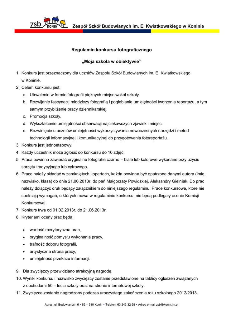 Zespół Szkół Budowlanych im. E. Kwiatkowskiego w Koninie Regulamin konkursu fotograficznego „Moja szkoła w obiektywie” 1. Konkurs jest przeznaczony dla uczniów Zespołu Szkół Budowlanych im. E. Kwiatkowskiego w Koninie. 2. Celem konkursu jest: a. Utrwalenie w formie fotografii pięknych miejsc wokół szkoły. b. Rozwijanie fascynacji młodzieży fotografią i pogłębianie umiejętności tworzenia reportażu, a tym samym przybliżenie pracy dziennikarskiej. c. Promocja szkoły. d. Wykształcenie umiejętności obserwacji najciekawszych zjawisk i miejsc. e. Rozwinięcie u uczniów umiejętności wykorzystywania nowoczesnych narzędzi i metod technologii informacyjnej i komunikacyjnej do przygotowania fotoreportażu. 3. Konkurs jest jednoetapowy. 4. Każdy uczestnik może zgłosić do konkursu do 10 zdjęć. 5. Praca powinna zawierać oryginalne fotografie czarno – białe lub kolorowe wykonane przy użyciu sprzętu tradycyjnego lub cyfrowego. 6. Prace należy składać w zamkniętych kopertach, każda powinna być opatrzona danymi autora (imię, nazwisko, klasa) do dnia 21.06.2013r. do pań Małgorzaty Powidzkiej, Aleksandry Gielniak. Do prac należy dołączyć druk będący załącznikiem do niniejszego regulaminu. Prace konkursowe, które nie spełniają wymagań, o których mowa w regulaminie konkursu, nie będą podlegały ocenie Komisji Konkursowej. 7. Konkurs trwa od 01.02.2013r. do 21.06.2013r. 8. Kryteriami oceny prac będą: wartość merytoryczna prac, oryginalność pomysłu wykonania pracy, trafność doboru fotografii, artystyczna strona pracy, umiejętność przekazu informacji. 9. Dla zwycięzcy przewidziano atrakcyjną nagrodę. 10. Wyniki konkursu i nazwisko zwycięzcy zostanie przedstawione na tablicy ogłoszeń związanych z obchodami 50 – lecia szkoły oraz na stronie internetowej szkoły. 11. Zwycięzca zostanie nagrodzony podczas uroczystego zakończenia roku szkolnego 2012/2013. Adres: ul. Budowlanych 6 62 – 510 Konin Telefon: 63 243 32 68 Adres e-mail [email protected] Zespół Szkół Budowlanych im. E. Kwiatkowskiego w Koninie 12. Od decyzji Komisji Konkursowej nie przysługuje odwołanie. 13. Organizator przewiduje prezentację wybranych prac na wystawie. 14. Prace niezgodne z Regulaminem lub oddane po terminie nie będą oceniane. 15. Biorąc udział w Konkursie uczestnik wyraża zgodę na zastosowanie się do niniejszego Regulaminu. 16. Dostarczone na Konkurs prace przechodzą na własność Organizatora. 17. Akceptacja powyższego regulaminu wiąże ze sobą prawo do późniejszego wykorzystania prac w celu promocji szkoły. 18. Regulamin konkursu można znaleźć na stronie internetowej szkoły. 19. W razie pytań i wątpliwości wszelkich informacji udzielą: Pani Małgorzata Powidzka, pani Aleksandra Gielnika. Adres: ul. Budowlanych 6 62 – 510 Konin Telefon: 63 243 32 68 Adres e-mail [email protected]