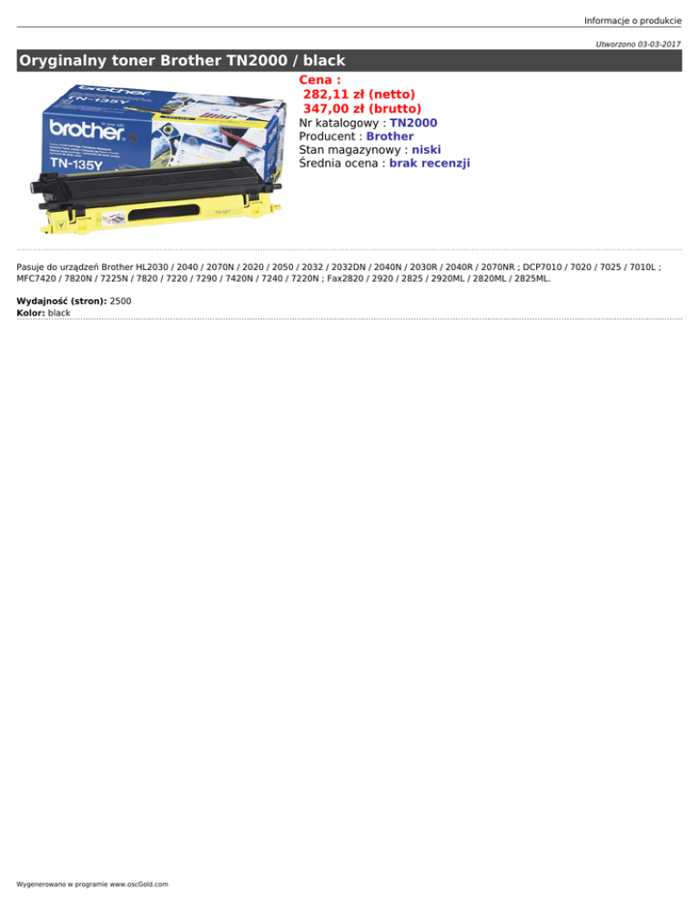 Informacje o produkcie Utworzono 03-03-2017 Oryginalny toner Brother TN2000 / black Cena : 282,11 zł (netto) 347,00 zł (brutto) Nr katalogowy : TN2000 Producent : Brother Stan magazynowy : niski Średnia ocena : brak recenzji Pasuje do urządzeń Brother HL2030 / 2040 / 2070N / 2020 / 2050 / 2032 / 2032DN / 2040N / 2030R / 2040R / 2070NR ; DCP7010 / 7020 / 7025 / 7010L ; MFC7420 / 7820N / 7225N / 7820 / 7220 / 7290 / 7420N / 7240 / 7220N ; Fax2820 / 2920 / 2825 / 2920ML / 2820ML / 2825ML. Wydajność (stron): 2500 Kolor: black Wygenerowano w programie www.oscGold.com