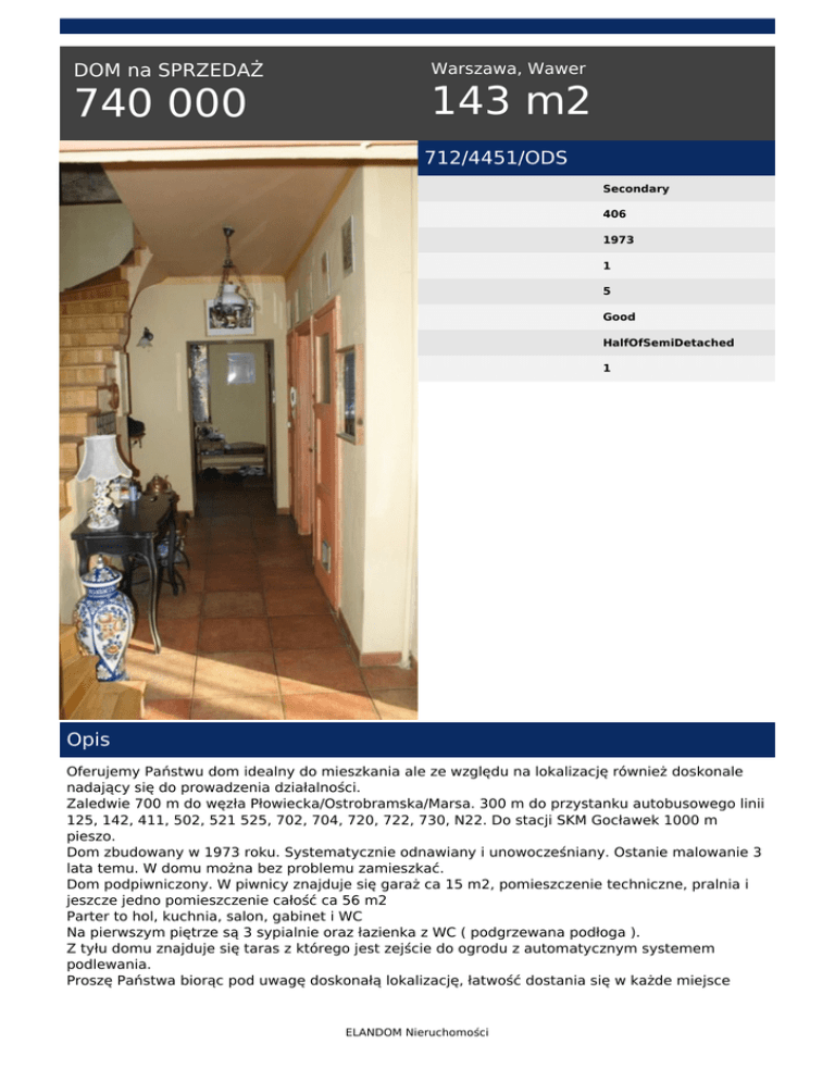 DOM na SPRZEDAŻ 740 000 Warszawa, Wawer 143 m2 712/4451/ODS Secondary 406 1973 1 5 Good HalfOfSemiDetached 1 Opis Oferujemy Państwu dom idealny do mieszkania ale ze względu na lokalizację również doskonale nadający się do prowadzenia działalności. Zaledwie 700 m do węzła Płowiecka/Ostrobramska/Marsa. 300 m do przystanku autobusowego linii 125, 142, 411, 502, 521 525, 702, 704, 720, 722, 730, N22. Do stacji SKM Gocławek 1000 m pieszo. Dom zbudowany w 1973 roku. Systematycznie odnawiany i unowocześniany. Ostanie malowanie 3 lata temu. W domu można bez problemu zamieszkać. Dom podpiwniczony. W piwnicy znajduje się garaż ca 15 m2, pomieszczenie techniczne, pralnia i jeszcze jedno pomieszczenie całość ca 56 m2 Parter to hol, kuchnia, salon, gabinet i WC Na pierwszym piętrze są 3 sypialnie oraz łazienka z WC ( podgrzewana podłoga ). Z tyłu domu znajduje się taras z którego jest zejście do ogrodu z automatycznym systemem podlewania. Proszę Państwa biorąc pod uwagę doskonałą lokalizację, łatwość dostania się w każde miejsce ELANDOM Nieruchomości Warszawy a jednocześnie ciche, pełne zieleni otoczenie, bardzo zachęcam do kupna tej nieruchomości. Jeszcze raz pragnę podkreślić fakt, ze ta nieruchomość doskonale nadaje się zarówno do zamieszkania przez rodzinę jak i do wykorzystania pod działalność gospodarczą. Zainteresowanych zapraszam do oglądania. Dla klientów poważnie zainteresowanych kupnem, poważne negocjacje cenowe. Jolanta Szopa 660 280 311 [email protected] Jolanta Szopa tel. 660 280 311 email: [email protected] ELANDOM Nieruchomości Powered by TCPDF (www.tcpdf.org)