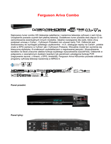 Ferguson Ariva Combo Najnowszy tuner combo HD (telewizja satelitarna i naziemna telewizja cyfrowa) z serii Ariva. Urządzenie posiada czytnik kart płatnej telewizji. Dodatkowo tuner posiada dwa złącza CI do zamontowania ewentualnych innych modułów. Idealne rozwiązanie dla osób, które chcą podpisać umowę z Cyfrą+., Cyfrowym Polsatem lub używać karty TnK. Odbiornik jest dostosowany do wymagań polskiego użytkownika - m.in. obsługuje napisy na Canal+, polskie znaki w EPG zarówno w Cyfrze+ jak i Cyfrowym Polsacie. Wizualnie model ten wyróżnia się klasyczną stylistyką i 8-znakowym wyświetlaczem o regulowanej jasności. Wyszukiwanie kanałów na liście znacznie ułatwia funkcja szybkiego wyszukiwania (QuickFind). Odbiornik w połączeniu z zewnętrznym dyskiem twardym lub pendrivem udostępnia funkcję PVR (nagrywanie ręczne, z timera, z EPG, timeshift). Ferguson Ariva HDcombo pozwala odbierać programy cyfrowej telewizji naziemnej w MPEG-4. Panel przedni: Panel tylny: Pilot: • • • • • • • • • • • • • • • • • • • • • • Odbiór kanałów satelitarnych i naziemnych wysokiej rozdzielczości (High Definition) Funkcja USB PVR wraz z TimeShift Skalowanie sygnału PAL do rozdzielczości 720p lub 1080i Przestrzenny dźwięk Dolby Digital Czytnik kart płatnej telewizji oraz 2 gniazda CI Pamięć do 8000 kanałów TV i RADIO Obsługa programowalnych timerów Oddzielne listy kanałów ulubionych, TV i Radio Elektroniczny przewodnik po programach – EPG Funkcja szybkiego wyszukiwania kanałów (QuickFind) Obsługa teletekstu i napisów ekranowych Proste, intuicyjne, wielojęzykowe menu (OSD) Szybka instalacja - zaprogramowana fabrycznie lista kanałów Obsługa DiSEqC 1.0 oraz USALS Obsługa standardów MPEG-2, MPEG-4, MPEG-4 AVC/H.264 Kompatybilny z systemami DVB-T, DVB-S i DVB-S2 8-znakowy alfanumeryczny wyświetlacz VFD Programowanie odbiornika przy pomocy portu USB Menu ekranowe w wysokiej rozdzielczości (HD OSD) Odtwarzacz plików audio Przeglądarka zdjęć Sterowanie standardowym lub uniwersalnym pilotem RCU-600 Złącza: • • • • HDMI z HDCP USB 2.0 Component (Y, Pb, Pr) 2x SCART • • • CVBS - RCA (Cinch) video 2x RCA (Cinch) analogowe audio Optyczne cyfrowe wyjście audio TOSLINK Wymiary (szerokość x głębokość x wysokość): 358x257x63mm Waga: około 3kg W opakowaniu: • • • • • odbiornik pilot RCU640 baterie 2 x AAA przewód HDMI wielojęzykowa instrukcja obsługi