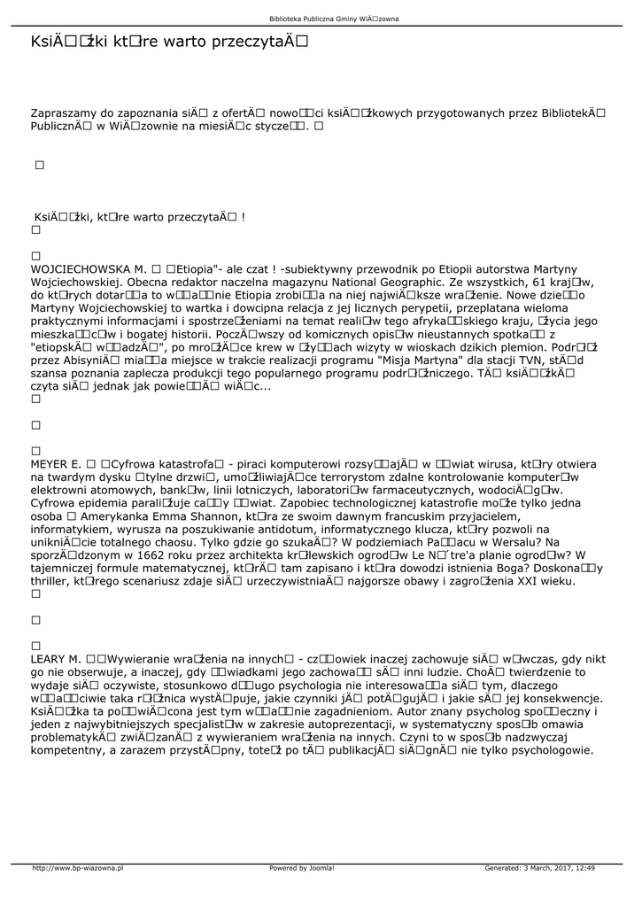 Biblioteka Publiczna Gminy WiÄ…zowna KsiÄ…Åźki ktÃłre warto przeczytać Zapraszamy do zapoznania siÄ™ z ofertÄ… nowoÅ›ci ksiÄ…Åźkowych przygotowanych przez BibliotekÄ™ PublicznÄ… w WiÄ…zownie na miesiÄ…c styczeÅ„. KsiÄ…Åźki, ktÃłre warto przeczytać ! WOJCIECHOWSKA M. Etiopia"- ale czat ! -subiektywny przewodnik po Etiopii autorstwa Martyny Wojciechowskiej. Obecna redaktor naczelna magazynu National Geographic. Ze wszystkich, 61 krajÃłw, do ktÃłrych dotarÅ‚a to wÅ‚aÅ›nie Etiopia zrobiÅ‚a na niej najwiÄ™ksze wraÅźenie. Nowe dzieÅ‚o Martyny Wojciechowskiej to wartka i dowcipna relacja z jej licznych perypetii, przeplatana wieloma praktycznymi informacjami i spostrzeÅźeniami na temat realiÃłw tego afrykaÅ„skiego kraju, Åźycia jego mieszkaÅ„cÃłw i bogatej historii. PoczÄ…wszy od komicznych opisÃłw nieustannych spotkaÅ„ z "etiopskÄ… wÅ‚adzÄ…", po mroÅźÄ…ce krew w ÅźyÅ‚ach wizyty w wioskach dzikich plemion. PodrÃłÅź przez AbisyniÄ™ miaÅ‚a miejsce w trakcie realizacji programu "Misja Martyna" dla stacji TVN, stÄ…d szansa poznania zaplecza produkcji tego popularnego programu podrÃłÅźniczego. TÄ™ ksiÄ…ÅźkÄ™ czyta siÄ™ jednak jak powieść wiÄ™c... MEYER E. Cyfrowa katastrofa - piraci komputerowi rozsyÅ‚ajÄ… w Å›wiat wirusa, ktÃłry otwiera na twardym dysku tylne drzwi, umoÅźliwiajÄ…ce terrorystom zdalne kontrolowanie komputerÃłw elektrowni atomowych, bankÃłw, linii lotniczych, laboratoriÃłw farmaceutycznych, wodociÄ…gÃłw. Cyfrowa epidemia paraliÅźuje caÅ‚y Å›wiat. Zapobiec technologicznej katastrofie moÅźe tylko jedna osoba Amerykanka Emma Shannon, ktÃłra ze swoim dawnym francuskim przyjacielem, informatykiem, wyrusza na poszukiwanie antidotum, informatycznego klucza, ktÃłry pozwoli na unikniÄ™cie totalnego chaosu. Tylko gdzie go szukać? W podziemiach PaÅ‚acu w Wersalu? Na sporzÄ…dzonym w 1662 roku przez architekta krÃłlewskich ogrodÃłw Le Nôtre'a planie ogrodÃłw? W tajemniczej formule matematycznej, ktÃłrÄ… tam zapisano i ktÃłra dowodzi istnienia Boga? DoskonaÅ‚y thriller, ktÃłrego scenariusz zdaje siÄ™ urzeczywistniać najgorsze obawy i zagroÅźenia XXI wieku. LEARY M. Wywieranie wraÅźenia na innych - czÅ‚owiek inaczej zachowuje siÄ™ wÃłwczas, gdy nikt go nie obserwuje, a inaczej, gdy Å›wiadkami jego zachowaÅ„ sÄ… inni ludzie. Choć twierdzenie to wydaje siÄ™ oczywiste, stosunkowo dÅ‚ugo psychologia nie interesowaÅ‚a siÄ™ tym, dlaczego wÅ‚aÅ›ciwie taka rÃłÅźnica wystÄ™puje, jakie czynniki jÄ… potÄ™gujÄ… i jakie sÄ… jej konsekwencje. KsiÄ…Åźka ta poÅ›wiÄ™cona jest tym wÅ‚aÅ›nie zagadnieniom. Autor znany psycholog spoÅ‚eczny i jeden z najwybitniejszych specjalistÃłw w zakresie autoprezentacji, w systematyczny sposÃłb omawia problematykÄ™ zwiÄ…zanÄ… z wywieraniem wraÅźenia na innych. Czyni to w sposÃłb nadzwyczaj kompetentny, a zarazem przystÄ™pny, toteÅź po tÄ™ publikacjÄ™ siÄ™gnÄ… nie tylko psychologowie. http://www.bp-wiazowna.pl Powered by Joomla! Generated: 3 March, 2017, 12:49