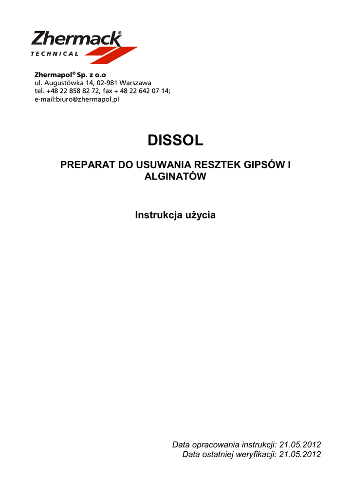 Zhermapol® Sp. z o.o ul. Augustówka 14, 02-981 Warszawa tel. +48 22 858 82 72, fax + 48 22 642 07 14; e-mail:[email protected] DISSOL PREPARAT DO USUWANIA RESZTEK GIPSÓW I ALGINATÓW Instrukcja użycia Data opracowania instrukcji: 21.05.2012 Data ostatniej weryfikacji: 21.05.2012 DISSOL Materiał do usuwania resztek gipsu i alginatów. Charakterystyka produktu: Chromatyczny materiał do usuwania resztek gipsów z protez dentystycznych lub alginatów z łyżek wyciskowych. Eliminuje potrzebę uciążliwego i pracochłonnego mechanicznego usuwania resztek gipsu i alginatu. W czasie rozpuszczania gipsów lub alginatów roztwór roboczy ulega stopniowemu odbarwieniu. Preparat można używać wielokrotnie aż do czasu utraty barwy. Przeznaczenie: Usuwanie resztek gipsów z protez dentystycznych lub ich elementów po polimeryzacji Usuwanie resztek masy alginatowej z łyżki wyciskowej po pobraniu wycisku. Przeciwwskazania: Preparatu nie powinny używać osoby uczulone na którykolwiek z jego składników. Opakowanie: 1000 g proszku, instrukcja użycia. Skład chemiczny: Cytrynian sodu z dodatkiem substancji stabilizujących oraz chromatycznych. Proporcje mieszania: Gipsy: 1 część proszku na 2 części wody Alginaty: 1 część proszku na 10 części wody Sposób użycia: Przygotowanie roztworu roboczego: Przygotować w zależności od potrzeb i przeznaczenia roztworu roboczego odpowiednie naczynie do jego sporządzenia. Do ciepłej wody w naczyniu dodać wynikającą z proporcji wg przeznaczenia roztworu ilość proszku i dokładnie wymieszać do jego rozpuszczenia. Wyższa temperatura wody ułatwia rozpuszczanie proszku. Uzyskany po rozpuszczeniu proszku w wodzie roztwór jest gotowy do użytku. UWAGA: w przypadku zbyt twardej wody przy wyższym stężeniu proszku może wytrącać się osad kamienia wodnego. W takim przypadku zaleca się najpierw zagotować wodę w celu zmniejszenia ilości kamienia a jeżeli to nie pomoże wskazane jest używanie wody odmineralizowanej lub destylowanej. Usuwanie resztek gipsów Protezę lub inny czyszczony przedmiot umieścić w roztworze roboczym i pozostawić na około 24 godziny. W przypadku grubej warstwy gipsu, w celu przyspieszenia reakcji należy od czasu do czasu zamieszać płyn. Oczyszczony przedmiot dokładnie wypłukać pod bieżącą wodą. Usuwanie resztek alginatów Łyżkę wyciskową lub inny czyszczony przedmiot zanurzyć w roztworze roboczym i pozostawić na około 2 godziny, a następnie spłukać pod bieżącą wodą. Zagrożenia i przeciwdziałanie - Preparat oraz sporządzony z niego roztwór roboczy z reguły nie powoduje skutków ubocznych przy kontakcie ze skórą, niemniej jednak u osób wrażliwych na składniki wyrobu może powodować reakcje alergiczne. Może powodować podrażnienia przy kontakcie z oczyma oraz oddziaływać szkodliwie w przypadku spożycia. - Stosować zasady dobrych praktyk laboratoryjnych w laboratoriach dentystycznych i pracowniach protetycznych. - Unikać kontaktu proszku oraz roztworu roboczego ze skórą oraz oczami. - Nie wdychać oparów roztworu roboczego. - Stosować rękawice lateksowe oraz okulary ochronne. - Miejsce kontaktu preparatu lub roztworu roboczego ze skórą zmyć dokładnie wodą i mydłem. Przy wystąpieniu reakcji alergicznej lub podrażnień skontaktować się z lekarzem. - W razie kontaktu preparatu z oczami przemyć je wodą. Kontakt z lekarzem jest wskazany w przypadku wystąpienia podrażnień. - W razie przypadkowego spożycia skontaktować się z lekarzem. - W przypadku osób nadwrażliwych na składniki wyrobu należy zachować ostrożność, a w szczególnych przypadkach zastosować inny materiał. Przechowywanie i postępowania z wyrobem - Proszek przechowywać w oryginalnych, szczelnie zamkniętych opakowaniach, w suchym i przewiewnym pomieszczeniu w temperaturze 5o 25 C w miejscu niedostępnym dla dzieci. - Nie używać produktu po terminie ważności. - Roztwór roboczy przechowywać w specjalnych przeznaczonych do tego celu i oznakowanych naczyniach, w miejscu niedostępnym dla osób postronnych i dzieci. Postępowanie z odpadami Usuwać zgodnie z obowiązującymi przepisami o odpadach. Opakowanie kartonowe, tuba, instrukcja – możliwość recyklingu, usuwać jako odpad komunalny nie stanowiący zagrożenia. Preparat nie jest odpadem niebezpiecznym. Usuwać jako odpad komunalny nie stanowiący zagrożenia. Zużyty roztwór roboczy nie stanowi zagrożenia dla środowiska naturalnego i po wielokrotnym silnym rozcieńczeniu może być wylany do kanalizacji. Uwaga! Materiał do stosowania wyłącznie w pracach pomocniczych w gabinetach dentystycznych i pracowniach techniczno - dentystycznych. Instrukcje pisemne, słowne oraz informacje przekazywane w czasie prezentacji przez producenta wynikają z aktualnego poziomu techniki dentystycznej i technologii. Należy traktować je jako informacje obowiązujące. Informacje uzyskane od osób trzecich (ze względu na różny poziom ich uprawnień) nie zwalniają użytkownika od osobistego sprawdzenia czy preparat nadaje się do określonego przeznaczenia. Ponieważ jego stosowanie odbywa się bez możliwości kontroli ze strony producenta ogranicza to odpowiedzialność wytwórcy do wartości dostarczonego materiału. Szczegółowe informacje na temat wszystkich materiałów firmy Zhermapol można uzyskać pod numerem tel.: 0 602 701 001. Wszelkie uwagi dotyczące naszych wyrobów prosimy kierować na nasz adres. Zhermapol Sp. z o.o posiada System Zarządzania Jakością zgodny z wymaganiami ISO 9001/ISO 13485 certyfikowany przez jednostkę notyfikowaną 0120, SGS United Kingdom Ltd, Systems and Services Certification.