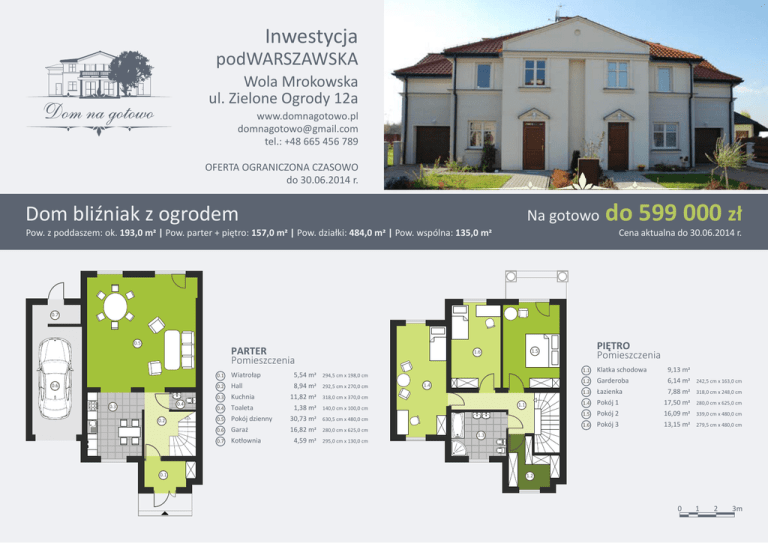 Inwestycja podWARSZAWSKA Wola Mrokowska ul. Zielone Ogrody 12a www.domnagotowo.pl [email protected] tel.: +48 665 456 789 OFERTA OGRANICZONA CZASOWO do 30.06.2014 r. Dom bliźniak z ogrodem Na gotowo Pow. z poddaszem: ok. 193,0 m2 | Pow. parter + piętro: 157,0 m2 | Pow. działki: 484,0 m2 | Pow. wspólna: 135,0 m2 do 599 000 zł Cena aktualna do 30.06.2014 r. 0.7 0.5 PARTER Pomieszczenia 0.1 0.6 0.2 0.4 0.3 0.2 0.3 0.4 0.5 0.6 0.7 0.1 Wiatrołap Hall Kuchnia Toaleta Pokój dzienny Garaż Kotłownia 5,54 m2 8,94 m2 11,82 m2 1,38 m2 30,73 m2 16,82 m2 4,59 m2 1.1 294,5 cm x 198,0 cm 292,5 cm x 270,0 cm 1.2 1.4 1.3 318,0 cm x 370,0 cm 1.4 1.1 140,0 cm x 100,0 cm 1.5 630,5 cm x 480,0 cm 280,0 cm x 625,0 cm 295,0 cm x 130,0 cm PIĘTRO Pomieszczenia 1.5 1.6 1.6 Klatka schodowa Garderoba Łazienka Pokój 1 Pokój 2 Pokój 3 9,13 m2 6,14 m2 7,88 m2 17,50 m2 16,09 m2 13,15 m2 242,5 cm x 163,0 cm 318,0 cm x 248,0 cm 280,0 cm x 625,0 cm 339,0 cm x 480,0 cm 279,5 cm x 480,0 cm 1.3 1.2 0 1 2 3m Wnetrza budynku /Budynek gotowy do odbioru/: ● Stolarka wewnętrzna drzwiowa firmy PORTA do 7 szt., ● Panele podłogowe wraz z listwami do sypialni, holl góra oraz garderoba, ● Parapety wewnętrzne z konglomeratu, ● Ściany zagruntowane na biało lub wg. Ustaleń z nabywcą, ● Brama garażowa sterowana pilotem wraz siłownikiem, ● Biały montaż WC, toaleta, ● Brodzik, wanna firmy Koło, ● Płytki gresowe podłogowe w hall, korytarzu, WC, ● Płytki na balkonie, w garażu, ● Ogrzewanie podłogowe w łazience, korytarzu, kuchni i wiatrołapie Konstrukcja oraz infrastruktura: ● Media miejskie woda, kanalizacja, gaz i prąd, ● Okna drewniane, ● Dachówka ceramiczna, ● Tynki wewnętrzne gipsowe, ● Instalacja domofonowa, ● Instalacja alarmowa bez urządzeń, ● Instalacja telefoniczna i RTV-SAT, ● Instalacja elektryczna wraz z osprzętem typu.: gniazda, włączniki, wypusty do podłączenia płyty elektrycznej, wypusty do podłączenia gniazda 400 V w garażu, wypust do oświetlenia ogródka i tarasu, ● Instalacja wodno kanalizacyjna bez osprzętu i białego montażu, ● Centralne ogrzewanie wraz z piecem kondensacyjnym dwu funkcyjnym IMMERGAS, ● Grzejniki PURMO wraz z głowicami termostatycznymi, ● Taras wykończony kostką brukową do 30 m/kw .