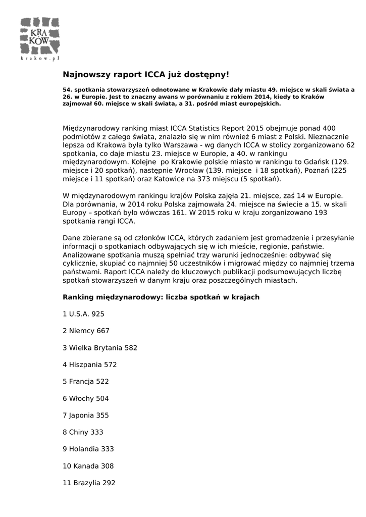 Najnowszy raport ICCA już dostępny! 54. spotkania stowarzyszeń odnotowane w Krakowie dały miastu 49. miejsce w skali świata a 26. w Europie. Jest to znaczny awans w porównaniu z rokiem 2014, kiedy to Kraków zajmował 60. miejsce w skali świata, a 31. pośród miast europejskich. Międzynarodowy ranking miast ICCA Statistics Report 2015 obejmuje ponad 400 podmiotów z całego świata, znalazło się w nim również 6 miast z Polski. Nieznacznie lepsza od Krakowa była tylko Warszawa - wg danych ICCA w stolicy zorganizowano 62 spotkania, co daje miastu 23. miejsce w Europie, a 40. w rankingu międzynarodowym. Kolejne po Krakowie polskie miasto w rankingu to Gdańsk (129. miejsce i 20 spotkań), następnie Wrocław (139. miejsce i 18 spotkań), Poznań (225 miejsce i 11 spotkań) oraz Katowice na 373 miejscu (5 spotkań). W międzynarodowym rankingu krajów Polska zajęła 21. miejsce, zaś 14 w Europie. Dla porównania, w 2014 roku Polska zajmowała 24. miejsce na świecie a 15. w skali Europy – spotkań było wówczas 161. W 2015 roku w kraju zorganizowano 193 spotkania rangi ICCA. Dane zbierane są od członków ICCA, których zadaniem jest gromadzenie i przesyłanie informacji o spotkaniach odbywających się w ich mieście, regionie, państwie. Analizowane spotkania muszą spełniać trzy warunki jednocześnie: odbywać się cyklicznie, skupiać co najmniej 50 uczestników i migrować między co najmniej trzema państwami. Raport ICCA należy do kluczowych publikacji podsumowujących liczbę spotkań stowarzyszeń w danym kraju oraz poszczególnych miastach. Ranking międzynarodowy: liczba spotkań w krajach 1 U.S.A. 925 2 Niemcy 667 3 Wielka Brytania 582 4 Hiszpania 572 5 Francja 522 6 Włochy 504 7 Japonia 355 8 Chiny 333 9 Holandia 333 10 Kanada 308 11 Brazylia 292 12 Portugalia 278 13 Korea Południowa 267 14 Austria 258 15 Australia 247 16 Belgia 216 17 Szwecja 216 18 Turcja 211 19 Dania 204 20 Szwajcaria 194 Ranking międzynarodowy: liczba spotkań w miastach 1 Berlin 195 2 Paryż 186 3 Barcelona 180 4 Wiedeń 178 5 Londyn 171 6 Madryt 171 7 Singapur 156 8 Istambuł 148 9 Lizbona 145 10 Kopenhaga 138 11 Praga 123 12 Amsterdam 120 13 Bruksela 117 14 Seul 117 15 Hong Kong 112 16 Bangkok 103 17 Rzym 99 18 Dublin 97 19 Pekin 95 20 Budapeszt 95 Ranking krajów europejskich: liczba spotkań w krajach 1 Niemcy667 2 Wielka Brytania 582 3 Hiszpania 572 4 Francja 522 5 Włochy 504 6 Holandia 333 7 Portugalia 278 8 Austria 258 9 Belgia 216 10 Szwecja 216 11 Turcja 211 12 Dania 204 13 Szwajcaria 194 14 Polska 193 15 Czechy 154 16 Grecja 152 17 Norwegia 144 18 Finlandia 141 19 Irlandia 125 20 Węgry 112 Ranking krajów europejskich: liczba spotkań w miastach 1 Berlin 195 2 Paryż 186 3 Barcelona 180 4 Wiedeń 178 5 London 171 6 Madryt 171 7 Istambuł 148 8 Lizbona 145 9 Kopenhaga 138 10 Praga 123 11 Amsterdam 120 12 Bruksela 117 13 Rzym 99 14 Dublin 97 15 Budapeszt 95 16 Mediolan 93 17 Sztokholm 89 18 Ateny 87 19 Helsinki 71 20 Edynburg 67 Raport dostępny na http://www.iccaworld.com/npps/story.cfm?id=5756&utm_content=buffer466e8&utm_ medium=social&utm_source=twitter.com&utm_campaign=buffer Powered by TCPDF (www.tcpdf.org)