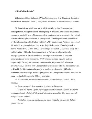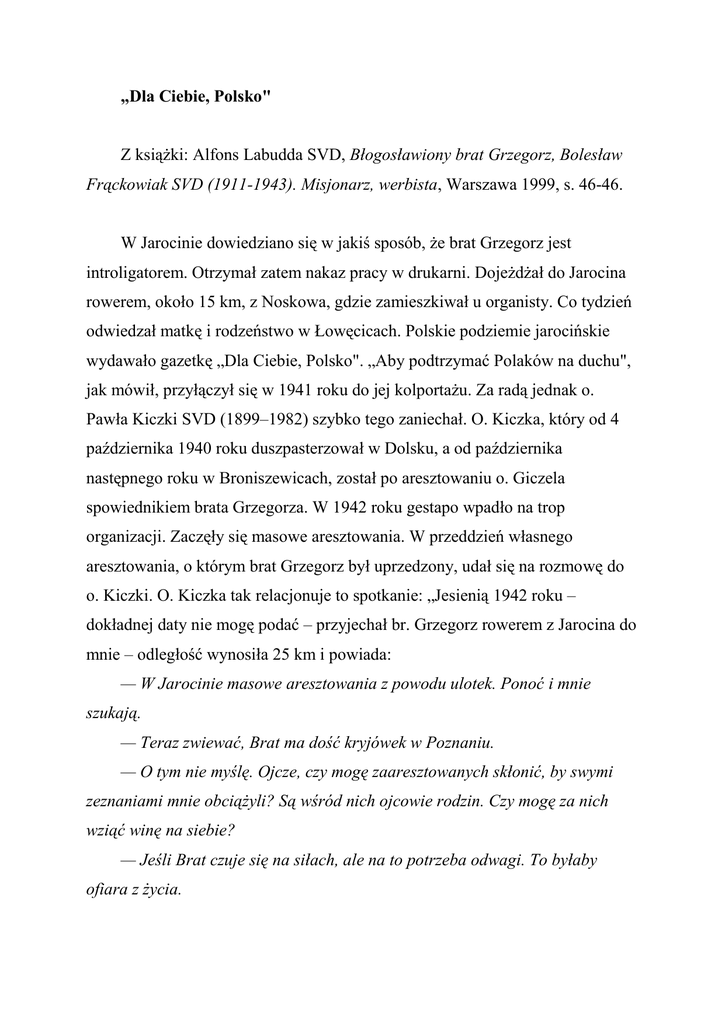 „Dla Ciebie, Polsko" Z książki: Alfons Labudda SVD, Błogosławiony brat Grzegorz, Bolesław Frąckowiak SVD (1911-1943). Misjonarz, werbista, Warszawa 1999, s. 46-46. W Jarocinie dowiedziano się w jakiś sposób, że brat Grzegorz jest introligatorem. Otrzymał zatem nakaz pracy w drukarni. Dojeżdżał do Jarocina rowerem, około 15 km, z Noskowa, gdzie zamieszkiwał u organisty. Co tydzień odwiedzał matkę i rodzeństwo w Łowęcicach. Polskie podziemie jarocińskie wydawało gazetkę „Dla Ciebie, Polsko". „Aby podtrzymać Polaków na duchu", jak mówił, przyłączył się w 1941 roku do jej kolportażu. Za radą jednak o. Pawła Kiczki SVD (1899–1982) szybko tego zaniechał. O. Kiczka, który od 4 października 1940 roku duszpasterzował w Dolsku, a od października następnego roku w Broniszewicach, został po aresztowaniu o. Giczela spowiednikiem brata Grzegorza. W 1942 roku gestapo wpadło na trop organizacji. Zaczęły się masowe aresztowania. W przeddzień własnego aresztowania, o którym brat Grzegorz był uprzedzony, udał się na rozmowę do o. Kiczki. O. Kiczka tak relacjonuje to spotkanie: „Jesienią 1942 roku – dokładnej daty nie mogę podać – przyjechał br. Grzegorz rowerem z Jarocina do mnie – odległość wynosiła 25 km i powiada: — W Jarocinie masowe aresztowania z powodu ulotek. Ponoć i mnie szukają. — Teraz zwiewać, Brat ma dość kryjówek w Poznaniu. — O tym nie myślę. Ojcze, czy mogę zaaresztowanych skłonić, by swymi zeznaniami mnie obciążyli? Są wśród nich ojcowie rodzin. Czy mogę za nich wziąć winę na siebie? — Jeśli Brat czuje się na siłach, ale na to potrzeba odwagi. To byłaby ofiara z życia. Potem się wyspowiadał i w kościele przyjął Komunię św. Po dziękczynieniu podał mi rękę. Do zobaczenia, ale już nie tu. Odjechał. Na drugi dzień został aresztowany, wielki winowajca. Inni, którzy z jego polecenia składali winę na niego, wrócili znowu do swych rodzin”. (P. Kiczka SVD, Brat Grzegorz, Bolesław Frąckowiak. Wspominamy, s. 171–173). W liście z 20 października 1965 roku o. Kiczka pisze między innymi: Warto byłoby wspomnieć o Br. Grzegorzu... jest co do ofiarności chlubnie do porównania z O. Kolbe, On w Jarocinie zostaje uwięziony za „gazetki” z różnymi innymi (na 100) osób i przyjął całą „winę” za to na siebie, mimo że od roku w tej sprawie nie był zawikłany. Gestapo brało go za głównego winowajcę i został za nich ujęty i zgładzony. Brat Grzegorz miał pełną świadomość grożących mu niebezpieczeństw i konsekwencji na wypadek ujęcia go przez gestapo. Wiedział przecież wszystko o pomordowanych współbraciach. W jednym ze swoich notatników (G IV) z czasów okupacji zanotował: Spis zmarłych członków S.V.D. (ofiary wojny): Ojciec Marjański we wielką sobotę 1940; Ojciec Mzyk w styczniu 1940; O. Sąsala 1940; O. Kubista 1940; O. Kozubek 1940; Frater Jan Włoch wrzesień 1940; Frater Kurjański listopad 1940/ Brat Joachim 11.Xl.1940; Brat Ewangelista we wrześniu 1939; Frater Florjan Białka listopad 1940; Fr. Stanisław Kolka Grudzień 1940; Ojciec Huwer Józef styczeń 1941; Fr. N. Garczyński luty 1941; Fr. N. Wojtkowiak Grudzień 1940; Fr. N. Hirsz styczeń 1941. Oprócz o. Mariańskiego i braci Joachima (B. Jagła) i Ewangelisty (F. Młyński), którzy zmarli śmiercią naturalną, wszyscy pozostali zginęli w obozach, (o. Ludwik Mzyk i o. Stanisław Kubista zostali razem z bratem Grzegorzem beatyfikowani 13 czerwca 1999 przez Jana Pawła II w Warszawie).