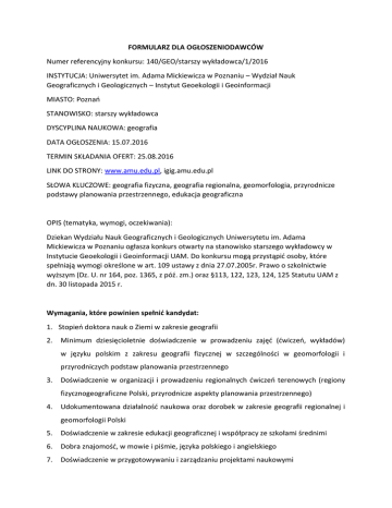 FORMULARZ DLA OGŁOSZENIODAWCÓW Numer referencyjny konkursu: 140/GEO/starszy wykładowca/1/2016 INSTYTUCJA: Uniwersytet im. Adama Mickiewicza w Poznaniu – Wydział Nauk Geograficznych i Geologicznych – Instytut Geoekologii i Geoinformacji MIASTO: Poznań STANOWISKO: starszy wykładowca DYSCYPLINA NAUKOWA: geografia DATA OGŁOSZENIA: 15.07.2016 TERMIN SKŁADANIA OFERT: 25.08.2016 LINK DO STRONY: www.amu.edu.pl, igig.amu.edu.pl SŁOWA KLUCZOWE: geografia fizyczna, geografia regionalna, geomorfologia, przyrodnicze podstawy planowania przestrzennego, edukacja geograficzna OPIS (tematyka, wymogi, oczekiwania): Dziekan Wydziału Nauk Geograficznych i Geologicznych Uniwersytetu im. Adama Mickiewicza w Poznaniu ogłasza konkurs otwarty na stanowisko starszego wykładowcy w Instytucie Geoekologii i Geoinformacji UAM. Do konkursu mogą przystąpić osoby, które spełniają wymogi określone w art. 109 ustawy z dnia 27.07.2005r. Prawo o szkolnictwie wyższym (Dz. U. nr 164, poz. 1365, z póź. zm.) oraz §113, 122, 123, 124, 125 Statutu UAM z dn. 30 listopada 2015 r. Wymagania, które powinien spełnić kandydat: 1. Stopień doktora nauk o Ziemi w zakresie geografii 2. Minimum dziesięcioletnie doświadczenie w prowadzeniu zajęć (ćwiczeń, wykładów) w języku polskim z zakresu geografii fizycznej w szczególności w geomorfologii i przyrodniczych podstaw planowania przestrzennego 3. Doświadczenie w organizacji i prowadzeniu regionalnych ćwiczeń terenowych (regiony fizycznogeograficzne Polski, przyrodnicze aspekty planowania przestrzennego) 4. Udokumentowana działalność naukowa oraz dorobek w zakresie geografii regionalnej i geomorfologii Polski 5. Doświadczenie w zakresie edukacji geograficznej i współpracy ze szkołami średnimi 6. Dobra znajomość, w mowie i piśmie, języka polskiego i angielskiego 7. Doświadczenie w przygotowywaniu i zarządzaniu projektami naukowymi Dokumenty wymagane do złożenia przez kandydata: 1. Podanie; Na podaniu należy dopisać: Wyrażam zgodę na przetwarzanie moich danych osobowych zawartych w mojej ofercie dla potrzeb niezbędnych do realizacji procesu rekrutacji zgodnie z ustawą z dnia 29 sierpnia 1997 roku o ochronie danych osobowych Dz. U. nr 133, poz. 883 z późniejszymi zmianami. 2. Kwestionariusz osobowy 3. Życiorys 4. Odpis dyplomu o nadaniu stopnia naukowego doktora 5. Informacja o dorobku naukowym, dydaktycznym i organizacyjnym z uwzględnieniem zamieszczonych powyżej wymogów 6. Deklaracja, że Uniwersytet im. Adama Mickiewicza w Poznaniu będzie podstawowym miejscem pracy kandydata. Dokumenty konkursowe należy złożyć w Sekretariacie Instytutu Geoekologii i Geoinformacji Wydziału Nauk Geograficznych i Geologicznych UAM (adres: 61-680 Poznań, ul. Dzięgielowa 27, pok. nr 257) do 25.08.2016 r. Uniwersytet im. Adama Mickiewicza nie zapewnia mieszkania. sposób weryfikacji kwalifikacji kandydatów - analiza złożonych dokumentów przez kandydatów. skład Komisji konkursowej: Przewodniczący Komisji: prof. UAM dr hab. Mirosław Makohonienko Członkowie Komisji: prof. dr hab. Krystyna Milecka, prof. UAM dr hab. Józef Szpikowski, prof. UAM dr hab. Grzegorz Rachlewicz, prof. UAM dr hab. Zbigniew Zwoliński