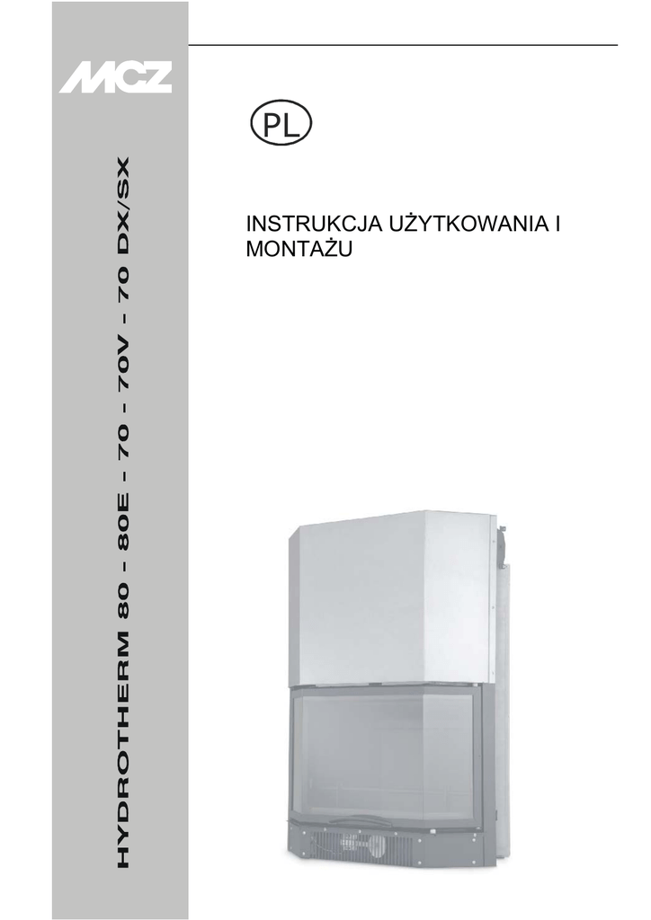 PL INSTRUKCJA UŻYTKOWANIA I MONTAŻU INSTRUKCJA MONTAŻU I UŻYTKOWANIA Spis treści str. 2 MCZ S.p.A. - Via G.Oberdan 86, I - 33074 Vigonovo (PN) Italy. 09 EN 13229:2001, A1:2003, A2:2004, AC:2006, HYDROTHERM 80 HYDROTHERM 80E Moc znamionowa (H2O): 26,2 kW (15,2 kW H2O) Emisja CO (przy 13% O2 ) 0,61% Wydajność: 77,1% Temperatura spalin: 333 °C Odległości bezpieczeństwa (tył): 180 mm Odległości bezpieczeństwa (bok): 180 mm 1,5 bar Maksymalne ciśnienie wody: (150 kPa) Produkt zgodny z instalowaniem w zbiorowym przewodzie kominowym. Urządzenie o przerywanym działaniu. Używać wyłącznie odpowiedni opał. Przeczytać i postępować zgodnie z instrukcjami! COD: 8900914 500 Spis treści Serwis techniczny - Prawa zastrzeżone dla firmy MCZ S.p.A. - Powielanie zabronione INSTRUKCJA MONTAŻU I UŻYTKOWANIA MCZ S.p.A. - Via G.Oberdan 86, I - 33074 Vigonovo (PN) Italy. MCZ S.p.A. - Via G.Oberdan 86, I - 33074 Vigonovo (PN) Italy. 09 09 EN 13229:2001, A1:2003, A2:2004, AC:2006, EN 13229:2001, A1:2003, A2:2004, AC:2006, HYDROTHERM 70 HYDROTHERM 70DX Spis treści str. 3 HYDROTHERM 70SX Potenza nominale (H2O): Puissance nominale (H2 O): Heizleistung (H2O): Emissione CO (al 13% O2): Emissions CO (Bez.13% O2): Mittlere CO- Emission (Bez.13% O2): Rendimento : Rendement : Energieeffizenz: Temperatura fumi: Température des fumées: Mittlere Abgastemperatur: Distanze di sicurezza (retro): Distances de sécurité (postérieures): Sicherheitsabstände (Hinten): Distanze di sicurezza (lato): Distances de sécurité (laterales): Sicherheitsabstände (Seitlich): Pressione idrica massima: Pression Max.eau : Max. Wasserdruck: 21,2 kW (13,0 kW H2O) 0,87% 75,2% 310 °C 150 mm 150 mm 1,5 bar (150 kPa) HYDROTHERM 70V Potenza nominale (H2O): Puissance nominale (H2 O): Heizleistung (H2O): Emissione CO (al 13% O2): Emissions CO (Bez.13% O2): Mittlere CO- Emission (Bez.13% O2): Rendimento : Rendement : Energieeffizenz: Temperatura fumi: Température des fumées: Mittlere Abgastemperatur: Distanze di sicurezza (retro): Distances de sécurité (postérieures): Sicherheitsabstände (Hinten): Distanze di sicurezza (lato): Distances de sécurité (laterales): Sicherheitsabstände (Seitlich): Pressione idrica massima: Pression Max.eau : Max. Wasserdruck: 21,2 kW (13,0 kW H2 O) 0,87% 75,2% 310 °C 150 mm 150 mm 2,0 bar (200 kPa) Produkt zgodny z instalowaniem w zbiorowym przewodzie kominowym. Produkt zgodny z instalowaniem w zbiorowym przewodzie kominowym. Urządzenie o przerywanym działaniu. Urządzenie o przerywanym działaniu. Używać wyłącznie odpowiedni opał. Używać wyłącznie odpowiedni opał. Przeczytać i postępować zgodnie z instrukcjami! Przeczytać i postępować zgodnie z instrukcjami! COD: 8900914 700 Spis treści COD: 8900914 600 Serwis techniczny - Prawa zastrzeżone dla firmy MCZ S.p.A. - Powielanie zabronione INSTRUKCJA MONTAŻU I UŻYTKOWANIA Spis treści str. 4 WPROWADZENIE ..................................................................................................................................6 Aktualizacja publikacji ............................................................................................................................6 Przechowywanie instrukcji......................................................................................................................6 W jaki sposób czytać instrukcję ..............................................................................................................6 1. OSTRZEŻENIA I WARUNKI GWARANCJI...........................................................................................7 1.1. OSTRZEŻENIA DOTYCZĄCE BEZPIECZEŃSTWA .................................................................................7 1.2. OSTRZEŻENIA OPERATYWNE ..........................................................................................................7 1.3. WARUNKI GWARANCJI....................................................................................................................8 1.3.1. Ograniczenia............................................................................................................................8 1.3.2. Wykluczenia.............................................................................................................................8 2. POJĘCIA DOTYCZĄCE INSTALACJI WEDŁUG UNI 10683 ..................................................................9 2.1. OTOCZENIE ROBOCZE ....................................................................................................................9 2.2. ŚRODKI OSTROŻNOŚCI...................................................................................................................9 2.3. ZEWNĘTRZNE ŹRÓDŁO POWIETRZA ..............................................................................................10 2.4. PODŁĄCZENIE DO KANAŁU DYMOWEGO ........................................................................................11 2.4.1. Zawór spalin (opcja)...............................................................................................................11 2.5. KANAŁ DYMOWY ..........................................................................................................................11 2.5.1. Przykłady kanałów dymowych .................................................................................................12 2.6. NASADA KOMINOWA ....................................................................................................................13 3. WYMIARY I CHARAKTERYSTYKA TECHNICZNA ..............................................................................15 4. INSTALOWANIE I MONTAŻ .............................................................................................................18 4.1. PRZYGOTOWANIE I ODPAKOWANIE...............................................................................................18 4.2. USTAWIENIE.....................................