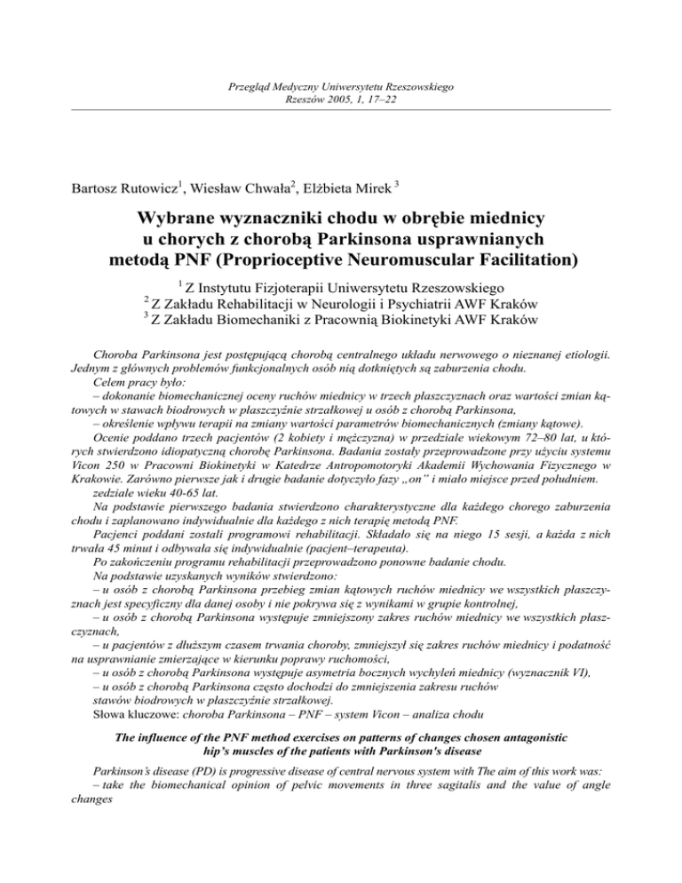 Przegląd Medyczny Uniwersytetu Rzeszowskiego Rzeszów 2005, 1, 17–22 Bartosz Rutowicz1, Wiesław Chwała2, Elżbieta Mirek 3 Wybrane wyznaczniki chodu w obrębie miednicy u chorych z chorobą Parkinsona usprawnianych metodą PNF (Proprioceptive Neuromuscular Facilitation) 1 Z Instytutu Fizjoterapii Uniwersytetu Rzeszowskiego Z Zakładu Rehabilitacji w Neurologii i Psychiatrii AWF Kraków 3 Z Zakładu Biomechaniki z Pracownią Biokinetyki AWF Kraków 2 Choroba Parkinsona jest postępującą chorobą centralnego układu nerwowego o nieznanej etiologii. Jednym z głównych problemów funkcjonalnych osób nią dotkniętych są zaburzenia chodu. Celem pracy było: – dokonanie biomechanicznej oceny ruchów miednicy w trzech płaszczyznach oraz wartości zmian kątowych w stawach biodrowych w płaszczyźnie strzałkowej u osób z chorobą Parkinsona, – określenie wpływu terapii na zmiany wartości parametrów biomechanicznych (zmiany kątowe). Ocenie poddano trzech pacjentów (2 kobiety i mężczyzna) w przedziale wiekowym 72–80 lat, u których stwierdzono idiopatyczną chorobę Parkinsona. Badania zostały przeprowadzone przy użyciu systemu Vicon 250 w Pracowni Biokinetyki w Katedrze Antropomotoryki Akademii Wychowania Fizycznego w Krakowie. Zarówno pierwsze jak i drugie badanie dotyczyło fazy „on” i miało miejsce przed południem. zedziale wieku 40-65 lat. Na podstawie pierwszego badania stwierdzono charakterystyczne dla każdego chorego zaburzenia chodu i zaplanowano indywidualnie dla każdego z nich terapię metodą PNF. Pacjenci poddani zostali programowi rehabilitacji. Składało się na niego 15 sesji, a każda z nich trwała 45 minut i odbywała się indywidualnie (pacjent–terapeuta). Po zakończeniu programu rehabilitacji przeprowadzono ponowne badanie chodu. Na podstawie uzyskanych wyników stwierdzono: – u osób z chorobą Parkinsona przebieg zmian kątowych ruchów miednicy we wszystkich płaszczyznach jest specyficzny dla danej osoby i nie pokrywa się z wynikami w grupie kontrolnej, – u osób z chorobą Parkinsona występuje zmniejszony zakres ruchów miednicy we wszystkich płaszczyznach, – u pacjentów z dłuższym czasem trwania choroby, zmniejszył się zakres ruchów miednicy i podatność na usprawnianie zmierzające w kierunku poprawy ruchomości, – u osób z chorobą Parkinsona występuje asymetria bocznych wychyleń miednicy (wyznacznik VI), – u osób z chorobą Parkinsona często dochodzi do zmniejszenia zakresu ruchów stawów biodrowych w płaszczyźnie strzałkowej. Słowa kluczowe: choroba Parkinsona – PNF – system Vicon – analiza chodu The influence of the PNF method exercises on patterns of changes chosen antagonistic hip’s muscles of the patients with Parkinson's disease Parkinson’s disease (PD) is progressive disease of central nervous system with The aim of this work was: – take the biomechanical opinion of pelvic movements in three sagitalis and the value of angle changes – assess the influence of the therapy on changes of biomechanical values Three patients (2 females and 1 man , age: 72–80 y.o.) with idiopatic PD was objected. The investigations were conducted in the Biokinetic Laboratory of the Antropomotorcity Cathedral at the Academy of Physical Education in Cracow with use of the Vicon 250 system. Both, first and second investigation concerned “on” phase and was done before noon. Control group contained random chosen healthy persons with 40-65 years old. On the ground of first investigation it was found characteristic gait disorder and planned for each patient therapy of the PNF method. Patients took part in rehabilitation program. It consisted of 15 sessions, each of them endured 45 minutes and hold severally (patient-therapist). After rehabilitation program the testing was repeated. On the basis received results it was found that: – at the PD patients the course of the pelvic angular changes in all planes is specific for each person and doesn’t agree with results of the control group, – at the PD patients exist reduced range of movement of the pelvic, – at the patients with longer time of duration of disease decreased susceptibility on rationalization, – at the PD patients exist asymmetry steps out asymmetry of lateral shifts (determinant VI) unknown etiology. One of the main functional problem of PD patients is gait disorder. Key words: Parkinson’s disease – PNF – Vicon system – gait analysis