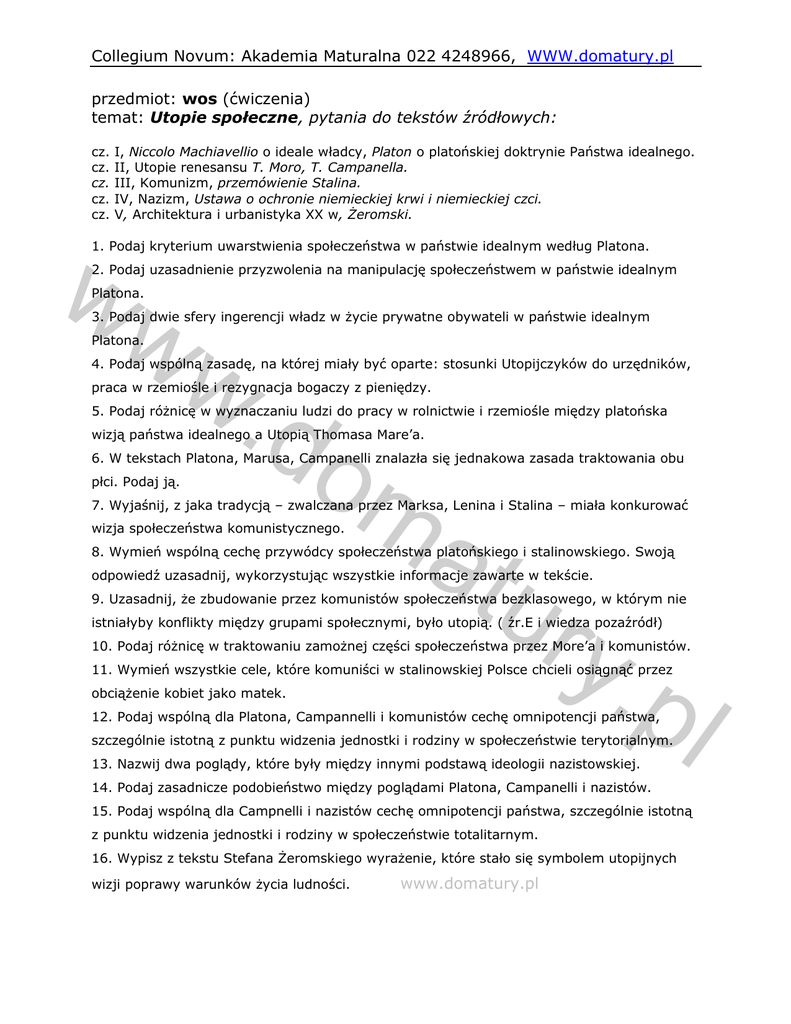Collegium Novum: Akademia Maturalna 022 4248966, WWW.domatury.pl przedmiot: wos (ćwiczenia) temat: Utopie społeczne, pytania do tekstów źródłowych: cz. cz. cz. cz. cz. I, Niccolo Machiavellio o ideale władcy, Platon o platońskiej doktrynie Państwa idealnego. II, Utopie renesansu T. Moro, T. Campanella. III, Komunizm, przemówienie Stalina. IV, Nazizm, Ustawa o ochronie niemieckiej krwi i niemieckiej czci. V, Architektura i urbanistyka XX w, Żeromski. ww 1. Podaj kryterium uwarstwienia społeczeństwa w państwie idealnym według Platona. 2. Podaj uzasadnienie przyzwolenia na manipulację społeczeństwem w państwie idealnym Platona. w. do 3. Podaj dwie sfery ingerencji władz w życie prywatne obywateli w państwie idealnym Platona. 4. Podaj wspólną zasadę, na której miały być oparte: stosunki Utopijczyków do urzędników, praca w rzemiośle i rezygnacja bogaczy z pieniędzy. 5. Podaj różnicę w wyznaczaniu ludzi do pracy w rolnictwie i rzemiośle między platońska ma wizją państwa idealnego a Utopią Thomasa Mare’a. 6. W tekstach Platona, Marusa, Campanelli znalazła się jednakowa zasada traktowania obu płci. Podaj ją. 7. Wyjaśnij, z jaka tradycją – zwalczana przez Marksa, Lenina i Stalina – miała konkurować wizja społeczeństwa komunistycznego. tur y.p 8. Wymień wspólną cechę przywódcy społeczeństwa platońskiego i stalinowskiego. Swoją odpowiedź uzasadnij, wykorzystując wszystkie informacje zawarte w tekście. 9. Uzasadnij, że zbudowanie przez komunistów społeczeństwa bezklasowego, w którym nie istniałyby konflikty między grupami społecznymi, było utopią. ( źr.E i wiedza pozaźródł) 10. Podaj różnicę w traktowaniu zamożnej części społeczeństwa przez More’a i komunistów. 11. Wymień wszystkie cele, które komuniści w stalinowskiej Polsce chcieli osiągnąć przez obciążenie kobiet jako matek. 12. Podaj wspólną dla Platona, Campannelli i komunistów cechę omnipotencji państwa, szczególnie istotną z punktu widzenia jednostki i rodziny w społeczeństwie terytorialnym. 13. Nazwij dwa poglądy, które były między innymi podstawą ideologii nazistowskiej. 14. Podaj zasadnicze podobieństwo między poglądami Platona, Campanelli i nazistów. l 15. Podaj wspólną dla Campnelli i nazistów cechę omnipotencji państwa, szczególnie istotną z punktu widzenia jednostki i rodziny w społeczeństwie totalitarnym. 16. Wypisz z tekstu Stefana Żeromskiego wyrażenie, które stało się symbolem utopijnych wizji poprawy warunków życia ludności. www.domatury.pl