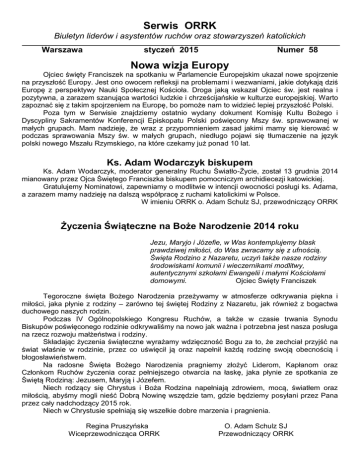 Serwis ORRK Biuletyn liderów i asystentów ruchów oraz stowarzyszeń katolickich Warszawa styczeń 2015 Numer 58 Nowa wizja Europy Ojciec święty Franciszek na spotkaniu w Parlamencie Europejskim ukazał nowe spojrzenie na przyszłość Europy. Jest ono owocem refleksji na problemami i wezwaniami, jakie dotykają dziś Europę z perspektywy Nauki Społecznej Kościoła. Droga jaką wskazał Ojciec św. jest realna i pozytywna, a zarazem szanująca wartości ludzkie i chrześcijańskie w kulturze europejskiej. Warto zapoznać się z takim spojrzeniem na Europę, bo pomoże nam to widzieć lepiej przyszłość Polski. Poza tym w Serwisie znajdziemy ostatnio wydany dokument Komisję Kultu Bożego i Dyscypliny Sakramentów Konferencji Episkopatu Polski poświęcony Mszy św. sprawowanej w małych grupach. Mam nadzieję, że wraz z przypomnieniem zasad jakimi mamy się kierować w podczas sprawowania Mszy św. w małych grupach, niedługo pojawi się tłumaczenie na język polski nowego Mszału Rzymskiego, na które czekamy już ponad 10 lat. Ks. Adam Wodarczyk biskupem Ks. Adam Wodarczyk, moderator generalny Ruchu Światło-Życie, został 13 grudnia 2014 mianowany przez Ojca Świętego Franciszka biskupem pomocniczym archidiecezji katowickiej. Gratulujemy Nominatowi, zapewniamy o modlitwie w intencji owocności posługi ks. Adama, a zarazem mamy nadzieję na dalszą współpracę z ruchami katolickimi w Polsce. W imieniu ORRK o. Adam Schulz SJ, przewodniczący ORRK Życzenia Świąteczne na Boże Narodzenie 2014 roku Jezu, Maryjo i Józefie, w Was kontemplujemy blask prawdziwej miłości, do Was zwracamy się z ufnością. Święta Rodzino z Nazaretu, uczyń także nasze rodziny środowiskami komunii i wieczernikami modlitwy, autentycznymi szkołami Ewangelii i małymi Kościołami domowymi. Ojciec Święty Franciszek Tegoroczne święta Bożego Narodzenia przeżywamy w atmosferze odkrywania piękna i miłości, jaka płynie z rodziny – zarówno tej świętej Rodziny z Nazaretu, jak również z bogactwa duchowego naszych rodzin. Podczas IV Ogólnopolskiego Kongresu Ruchów, a także w czasie trwania Synodu Biskupów poświęconego rodzinie odkrywaliśmy na nowo jak ważna i potrzebna jest nasza posługa na rzecz rozwoju małżeństwa i rodziny. Składając życzenia świąteczne wyrażamy wdzięczność Bogu za to, że zechciał przyjść na świat właśnie w rodzinie, przez co uświęcił ją oraz napełnił każdą rodzinę swoją obecnością i błogosławieństwem. Na radosne Święta Bożego Narodzenia pragniemy złożyć Liderom, Kapłanom oraz Członkom Ruchów życzenia coraz pełniejszego otwarcia na łaskę, jaka płynie ze spotkania ze Świętą Rodziną: Jezusem, Maryją i Józefem. Niech rodzący się Chrystus i Boża Rodzina napełniają zdrowiem, mocą, światłem oraz miłością, abyśmy mogli nieść Dobrą Nowinę wszędzie tam, gdzie będziemy posyłani przez Pana przez cały nadchodzący 2015 rok. Niech w Chrystusie spełniają się wszelkie dobre marzenia i pragnienia. Regina Pruszyńska Wiceprzewodnicząca ORRK O. Adam Schulz SJ Przewodniczący ORRK Przemówienie Ojca św. Franciszka w Parlamencie Europejskim Panie Przewodniczący, Panie i Panowie Wiceprzewodniczący, Dostojni Eurodeputowani, Szanowni Państwo z różnych tytułów pracujący w tej Izbie, Drodzy przyjaciele, Dziękuję wam za zaproszenie, by zabrać głos na forum tej fundamentalnej instytucji życia Unii Europejskiej i za daną mi przez was szansę zwrócenia się za waszym pośrednictwem do reprezentowanych przez was ponad pięciuset milionów obywateli 28 państw członkowskich. Szczególną wdzięczność pragnę wyrazić Panu, panie przewodniczący Parlamentu, za pańskie serdeczne słowa powitania skierowane do mnie w imieniu wszystkich członków Zgromadzenia. Moja wizyta ma miejsce ponad ćwierć wieku od tej, jaką złożył papież Jan Paweł II. Wiele się zmieniło od tamtych czasów w Europie i na całym świecie. Nie ma już przeciwstawnych bloków, które wówczas dzieliły kontynent na dwie części i powoli spełnia się pragnienie, aby „Europa suwerenna i wyposażona w wolne instytucje rozszerzyła się kiedyś aż do granic, jakie wyznacza jej geografia, a bardziej jeszcze historia” (1). Oprócz rozszerzonej Unii Europejskiej jest również bardziej złożony i mocno zmieniający się świat. Jest on coraz bardziej wzajemnie powiązany i globalny, a więc mniej „eurocentryczny”. Obszerniejszej i posiadającej większy wpływ Unii zdaje się jednak towarzyszyć wizerunek Europy trochę podstarzałej i przytłumionej, skłonnej, by czuć się mniej uczestniczącą w świecie, który patrzy na nią z dystansem, nieufnością, a niekiedy z podejrzliwością. Zwracając się dziś do was i wychodząc od mojego powołania jako pasterza, chciałbym skierować do wszystkich obywateli Europy orędzie nadziei i zachęty. Orędzie nadziei, którego podstawą jest ufność, że trudności mogą stać się silnymi katalizatorami jedności, by przezwyciężyć wszelkie obawy, jakie Europa przeżywa razem z całym światem. Nadzieję w Panu, który przekształca zło w dobro, a śmierć w życie. Zachęty, by powrócić do stanowczego przekonania ojców założycieli Unii Europejskiej, którzy pragnęli przyszłości opierającej się na zdolności do wspólnego działania na rzecz przezwyciężenia podziałów i krzewienia pokoju i jedności wśród wszystkich narodów kontynentu. W centrum tego ambitnego projektu politycznego było zaufanie do człowieka, nie tyle jako obywatela ani też podmiotu ekonomicznego, ale do człowieka jako osoby obdarzonej godnością transcendentną. Bardzo zależy mi na podkreśleniu ścisłego związku między tymi dwoma słowami: „godność” i „transcendentna”. „Godność” to słowo-klucz, które charakteryzowało odbudowę po II wojnie światowej. Nasza historia najnowsza wyróżnia się z powodu niewątpliwie centralnego miejsca krzewie