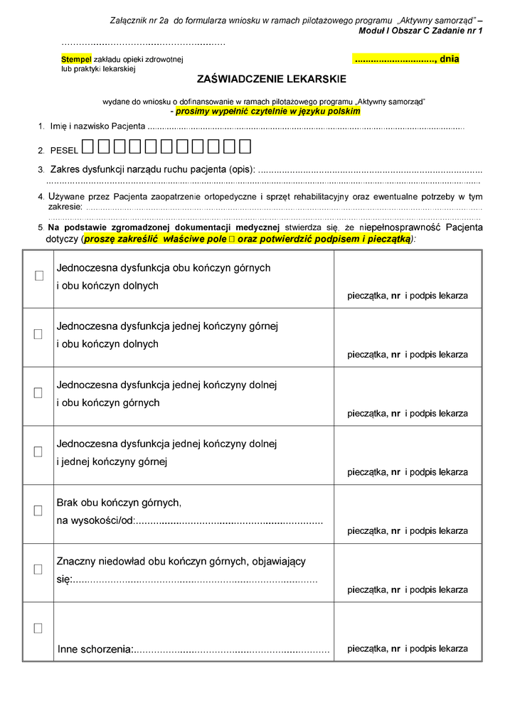 Załącznik nr 2a do formularza wniosku w ramach pilotażowego programu „Aktywny samorząd” – ......................................................... .............................., dnia Stempel zakładu opieki zdrowotnej lub praktyki lekarskiej Moduł I Obszar C Zadanie nr 1 ZAŚWIADCZENIE LEKARSKIE wydane do wniosku o dofinansowanie w ramach pilotażowego programu „Aktywny samorząd” - prosimy wypełnić czytelnie w języku polskim 1. Imię i nazwisko Pacjenta .................................................................................................................................... 2. PESEL Zakres dysfunkcji narządu ruchu pacjenta (opis): ..................................................................................... ................................................................................................................................................................................. 4. Używane przez Pacjenta zaopatrzenie ortopedyczne i sprzęt rehabilitacyjny oraz ewentualne potrzeby w tym 3. zakresie: ..................................................................................................................................................................... .................................................................................................................................................................................... 5. Na podstawie zgromadzonej dokumentacji medycznej stwierdza się, że niepełnosprawność Pacjenta dotyczy (proszę zakreślić właściwe pole oraz potwierdzić podpisem i pieczątką): Jednoczesna dysfunkcja obu kończyn górnych i obu kończyn dolnych pieczątka, nr i podpis lekarza Jednoczesna dysfunkcja jednej kończyny górnej i obu kończyn dolnych pieczątka, nr i podpis lekarza Jednoczesna dysfunkcja jednej kończyny dolnej i obu kończyn górnych pieczątka, nr i podpis lekarza Jednoczesna dysfunkcja jednej kończyny dolnej i jednej kończyny górnej pieczątka, nr i podpis lekarza Brak obu kończyn górnych, na wysokości/od:................................................................. pieczątka, nr i podpis lekarza Znaczny niedowład obu kończyn górnych, objawiający się:..................................................................................... pieczątka, nr i podpis lekarza Inne schorzenia:.................................................................... pieczątka, nr i podpis lekarza Str. 2 załącznika nr 2a do formularza wniosku – dotyczy formularzy wniosków – Moduł I Obszar C Zadanie nr 1 pole obowiązkowe w przypadku Pacjenta ubiegającego się o dofinansowanie w ramach obszaru C programu - na podstawie zgromadzonej dokumentacji medycznej 6. Ponadto ( ) stwierdza się, że: proszę zakreślić właściwe pola 1. Pacjent może poruszać się na wózku inwalidzkim o napędzie ręcznym: tak nie 2. Korzystanie z wózka o napędzie elektrycznym jest spowodować wstrzymanie lub pogorszenie niekorzystnie na sprawność kończyn górnych: 3. Przeciwwskazania niewskazane procesu tak rehabilitacji lub wpłynie nie do korzystania z wózka o napędzie (np. utraty przytomności, epilepsja): , gdyż może elektrycznym .................................................................. brak przeciwwskazań ............................................................................................................................ ............................................ ............................... pieczątka, nr i podpis lekarza Dotyczy wyłącznie Wnioskodawców ubiegających się o zwiększenie kwoty dofinansowania na zakup wózka inwalidzkiego o napędzie elektrycznym Pacjent z uwagi niepełnosprawność na ograniczenia wymaga funkcjonalne, zakupu wózka stan i zakres dysfunkcji narządu ruchu inwalidzkiego o napędzie elektrycznym powodującej z ponadstandardowym wyposażeniem, w tym: (proszę zakreślić właściwe pola ) niestandardowe sterowniki umożliwiające sterowanie wózkiem za pomocą jedynie władnych części ciała jak np.: ręki, palca, brody, stopy, warg lub wdechu i wydechu powietrza itp. urządzenia umożliwiające prowadzenie wózka także przez osobę towarzyszącą (hamulec, sterownik itp.) niestandardowe siedzisko (np. z windą podnoszącą, rehabilitacyjne, zapewniające maksymalną stabilizację, specjalne, regulowane (w tym elektrycznie i w różnych płaszczyznach): podnóżki, podłokietniki lub oparcia przeciwodleżynowe, itp.) nadgarstków kliny zapobiegające zsuwaniu się Pacjenta z wózka lub podpórki boczne, peloty piersiowe zagłówek stabilizujący głowę i szyję (w kształcie litery U) specjalne pasy bezpieczeństwa (np. dwupunktowe zapinane na biodrach, czteropunktowe) taki sposób, aby wózek był indywidualnie dopasowany do sylwetki Pacjenta (np. w przypadku niestandardowego wzrostu czy wagi Pacjenta) inne elementy i urządzenia (np. umożliwiające podłączenia joysticka wózka do komputera i posługiwanie się nim jak myszką), jakie : ........................................, dnia .............. (miejscowość ) (data) ............................................... pieczątka, nr i podpis lekarza