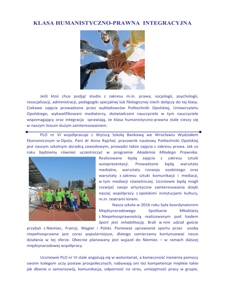 KLASA HUMANISTYCZNO-PRAWNA INTEGRACYJNA Jeśli ktoś chce podjąć studia z zakresu m.in. prawa, socjologii, psychologii, resocjalizacji, administracji, pedagogiki specjalnej lub filologicznej niech dołączy do tej klasy. Ciekawe zajęcia prowadzone przez wykładowców Politechniki Opolskiej, Uniwersytetu Opolskiego, wykwalifikowani mediatorzy, doświadczeni nauczyciele w tym nauczyciele wspomagający oraz integracja sprawiają, że klasa humanistyczno-prawna stale cieszy się w naszym liceum dużym zainteresowaniem. PLO nr VI współpracuje z Wyższą Szkołą Bankową we Wrocławiu Wydziałem Ekonomicznym w Opolu. Pani dr Anna Rajchel, pracownik naukowy Politechniki Opolskiej jest naszym szkolnym doradcą zawodowym, prowadzi także zajęcia z zakresu prawa. Jak co roku będziemy również uczestniczyć w programie Akademia Młodego Prawnika. Realizowane będą zajęcia z zakresu sztuki autoprezentacji. Prowadzone będą warsztaty medialne, warsztaty rozwoju osobistego oraz warsztaty z zakresu sztuki komunikacji i mediacji, w tym mediacji rówieśniczej. Uczniowie będą mogli rozwijać swoje artystyczne zainteresowania dzięki naszej współpracy z opolskimi instytucjami kultury, m.in. teatrami kinem. Nasza szkoła w 2016 roku była koordynatorem Międzynarodowego Spotkania Młodzieży z Niepełnosprawnością realizowanym pod hasłem Sport jest rehabilitacją. Brali w nim udział goście przybyli z Niemiec, Francji, Węgier i Polski. Ponieważ uprawianie sportu przez osoby niepełnosprawne jest coraz popularniejsze, dlatego zamierzamy kontynuować nasze działania w tej sferze. Obecnie planowany jest wyjazd do Niemiec – w ramach dalszej międzynarodowej współpracy. Uczniowie PLO nr VI stale angażują się w wolontariat, a konieczność niesienia pomocy swoim kolegom uczy postaw prospołecznych; nabywają oni też kompetencje miękkie takie jak dbanie o samorozwój, komunikacja, odporność na stres, umiejętność pracy w grupie, które są dzisiaj poszukiwane na rynku pracy. Nabór do klasy humanistyczno-prawnej to szansa dla tych, którzy pragną bez kompleksów wkroczyć w świat społeczeństwa demokratycznego, biorąc życie w swoje ręce. U nas możesz zdobyć wiedzę z zakresu prawa, a także wziąć udział w kursie retoryki praktycznej. W tej klasie w czasie trwania edukacji uczniowie będą realizowali następujące przedmioty z zakresu rozszerzenia: język polski, język angielski, wiedza o społeczeństwie lub historia. Dodatkowym przedmiotem będą elementy prawa.