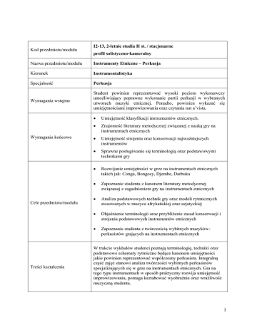 Kod przedmiotu/modułu I2-13, 2-letnie studia II st. / stacjonarne profil solistyczno-kameralny Nazwa przedmiotu/modułu Instrumenty Etniczne – Perkusja Kierunek Instrumentalistyka Specjalność Perkusja Wymagania wstępne Student powinien reprezentować wysoki poziom wykonawczy umożliwiający poprawne wykonanie partii perkusji w wybranych utworach muzyki etnicznej. Ponadto, powinien wykazać się umiejętnościami improwizowania oraz czytania nut a’vista. Wymagania końcowe Cele przedmiotu/modułu Treści kształcenia Umiejętność klasyfikacji instrumentów etnicznych. Znajomość literatury metodycznej związanej z nauką gry na instrumentach etnicznych Umiejętność strojenia oraz konserwacji najważniejszych instrumentów Sprawne posługiwanie się terminologią oraz podstawowymi technikami gry Rozwijanie umiejętności w grze na instrumentach etnicznych takich jak: Conga, Bongosy, Djembe, Darbuka Zapoznanie studenta z kanonem literatury metodycznej związanej z zagadnieniem gry na instrumentach etnicznych Analiza podstawowych technik gry oraz modeli rytmicznych stosowanych w muzyce afrykańskiej oraz azjatyckiej Objaśnienie terminologii oraz przybliżenie zasad konserwacji i strojenia podstawowych instrumentów etnicznych Zapoznanie studenta z twórczością wybitnych muzykówperkusistów grających na instrumentach etnicznych W trakcie wykładów studenci poznają terminologię, techniki oraz podstawowe schematy rytmiczne będące kanonem umiejętności jakie powinien reprezentować współczesny perkusista. Integralną część zajęć stanowi analiza twórczości wybitnych perkusistów specjalizujących się w grze na instrumentach etnicznych. Gra na tego typu instrumentach w sposób praktyczny rozwija umiejętność improwizowania, pomaga kształtować wyobraźnie oraz wrażliwość muzyczną studenta. 1 w zakresie wiedzy: posiada ogólną znajomość literatury muzycznej (K_W01) posiada znajomość podstawowego repertuaru związanego z własną specjalnością (K_W02) posiada znajomość elementów dzieła muzycznego i wzorców budowy formalnej utworów (K_W03) umiejętnie docierać do niezbędnych informacji (materiały nutowe, wydawnictwa książkowe, nagrania audio i wideo, Internet) (K_W04) posiada znajomość stylów muzycznych i związanych z nimi tradycji wykonawczych (K_W08) posiada podstawowe wiadomości w zakresie praktycznego zastosowania wiedzy o harmonii i zdolność analizowania pod tym kątem wykonywanego repertuaru (K_W13) w zakresie umiejętności: Zamierzone dysponuje umiejętnościami potrzebnymi do tworzenia i realizowania własnych koncepcji artystycznych (K_U01) jest świadomy sposobów wykorzystywania swej intuicji, emocjonalności i wyobraźni w obszarze ekspresji artystycznej (K_U02) posiada umiejętność wykorzystywania wiedzy dotyczącej podstawowych kryteriów stylistycznych wykonywanych utworów (K_U05) posiada umiejętność odczytania zapisu muzyki XX i XXI wieku (K_U06) posiada umiejętność właściwego odczytania tekstu nutowego, biegłego i pełnego przekazania materiału muzycznego, zawartych w utworze idei i jego formy (K_U09) opanował warsztat techniczny potrzebny do profesjonalnej prezentacji muzycznej i jest świadomy problemów specyficznych dla danego instrumentu (intonacja, precyzja itp.) (K_U10) poprzez opanowanie efektywnych technik ćwiczenia wykazuje umiejętność samodzielnego doskonalenia warsztatu technicznego (K_U12) posiada umiejętność rozumienia i kontrolowania struktur rytmicznych i metrorytmicznych oraz aspektów dotyczących frazowania, struktury harmonicznej itp. opracowywanych utworów (K_U13) posiada biegłą znajomość w zakresie słuchowego rozpoznawania materiału muzycznego, zapamiętywania go i operowania nim (K_U14) efekty kształcenia 2 w zakresie kompetencji społecznych: umie gromadzić, analizować i w świadomy sposób interpretować potrzebne informacje (K_K01) realizuje własne koncepcje i działania artystyczne oparte na zróżnicowanej stylistyce, wynikającej z wykorzystania wyobraźni, ekspresji i intuicji (K_K02) posiada umiejętność organizacji pracy własnej w ramach realizacji wspólnych zadań i projektów (K_K03) posiada umiejętność samooceny, jak też jest zdolny do budowania konstruktywnej krytyki w obrębie działań muzycznych, artystycznych oraz w obszarze szeroko pojmowanej kultury (K_K04) jest zdolny do definiowania własnych sądów i przemyśleń na tematy społeczne, naukowe i etyczne oraz umie je umiejscowić w obrębie własnej pracy artystycznej (K_K05) w sposób świadomy i profesjonalny umie zaprezentować własną działalność artystyczną (K_K09) umie posługiwać się fachową terminologią z zakresu dziedziny muzyki (K_K10) Wykłady, zajęcia indywidualne, dyskusja dydaktyczna Ćwiczenia z podkładem muzycznym (nagrania utworów muzycznych) Czytanie partytur (śledzenie partii perkusji) wsparte materiałami audio-wideo Formy kształcenia Rok Punkty ECTS (nakład pracy studenta niezbędny do osiągnięcia zamierzonych efektów kształcenia) I II Semestr I II III IV Punkty ECTS 1 1 - - Ilość godzin w tygodniu 1 1 - - zal zal - - Rodzaj zaliczenia Legenda zal – zaliczenie; zst – zaliczenie ze stopniem; egz – egzamin; ekm – egzamin komisyjny 3 Kryteria oceny Literatura Stopień opanowania przedstawionych technik gry Zdolność do tworzenia interesujących kreacji artystycznych Znajomość tradycji wykonawczej i stylistyk Ted Reed - Bongo and Conga Drum Technique / wydawnictwo: Meridith Music Chalo Eduardo & Frank Kumor - Drum Circle: A Guide to World Percussion / wydawnictwo: Alfred Percussion Język wykładowy polski, możliwość prowadzenia zajęć w języku angielskim Prowadzący Dr hab. Dariusz Kaliszuk 4