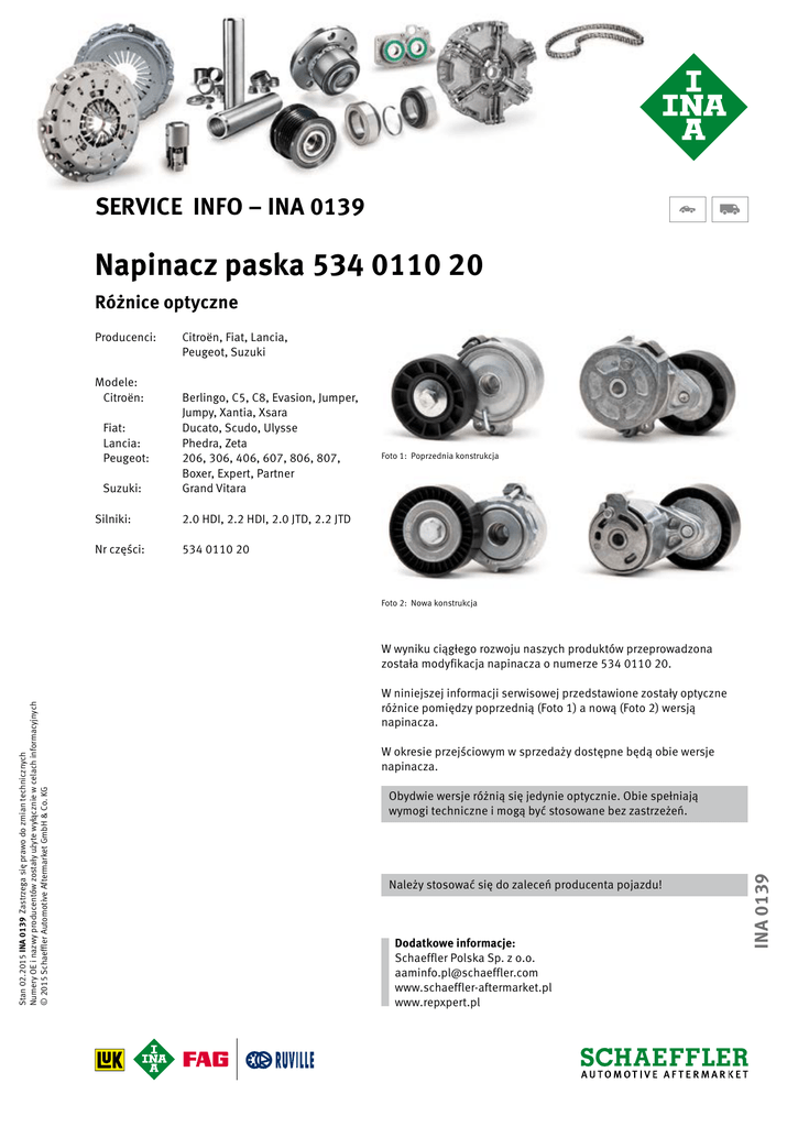 SERVICE INFO – INA 0139 Napinacz paska 534 0110 20 Różnice optyczne Producenci: Modele: Citroën: Fiat: Lancia: Peugeot: Suzuki: Citroën, Fiat, Lancia, Peugeot, Suzuki Berlingo, C5, C8, Evasion, Jumper, Jumpy, Xantia, Xsara Ducato, Scudo, Ulysse Phedra, Zeta 206, 306, 406, 607, 806, 807, Boxer, Expert, Partner Grand Vitara Silniki: 2.0 HDI, 2.2 HDI, 2.0 JTD, 2.2 JTD Nr części: 534 0110 20 Foto 1: Poprzednia konstrukcja Foto 2: Nowa konstrukcja W niniejszej informacji serwisowej przedstawione zostały optyczne różnice pomiędzy poprzednią (Foto 1) a nową (Foto 2) wersją napinacza. W okresie przejściowym w sprzedaży dostępne będą obie wersje napinacza. Obydwie wersje różnią się jedynie optycznie. Obie spełniają wymogi techniczne i mogą być stosowane bez zastrzeżeń. Należy stosować się do zaleceń producenta pojazdu! Dodatkowe informacje: Schaeffler Polska Sp. z o.o. [email protected] www.schaeffler-aftermarket.pl www.repxpert.pl INA 0139 Stan 02.2015 INA 0139 Zastrzega się prawo do zmian technicznych Numery OE i nazwy producentów zostały użyte wyłącznie w celach informacyjnych © 2015 Schaeffler Automotive Aftermarket GmbH & Co. KG W wyniku ciągłego rozwoju naszych produktów przeprowadzona została modyfikacja napinacza o numerze 534 0110 20.