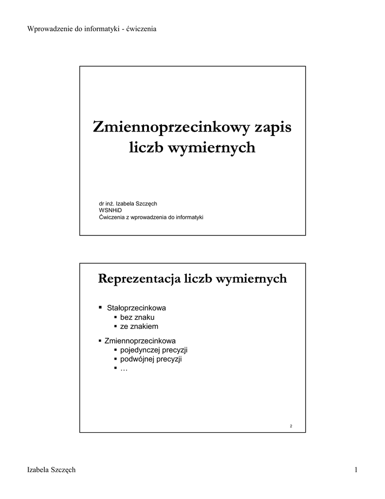 Wprowadzenie do informatyki - ć wiczenia Zmiennoprzecinkowy zapis liczb wymiernych dr inż . Izabela Szczęch WSNHiD Ćwiczenia z wprowadzenia do informatyki Reprezentacja liczb wymiernych § Stałoprzecinkowa § bez znaku § ze znakiem § Zmiennoprzecinkowa § pojedynczej precyzji § podwó jnej precyzji § … 2 Izabela Szczęch 1 Wprowadzenie do informatyki - ć wiczenia Plan zaję ć n Zapis zmiennoprzecinkowy - definicja i konwersje n Zakresy liczb w reprezentacji zmiennoprzecinkowej n Dokładnoś ć reprezentacji zmiennoprzecinkowej n Arytmetyka w reprezentacji zmiennoprzecinkowej n Problem utarty precyzji n Standardy reprezentacji zmiennoprzecinkowej 3 Zapis zmiennoprzecinkowy - definicja i konwersja Izabela Szczęch 2 Wprowadzenie do informatyki - ć wiczenia Wady zapisu stałoprzecinkowego § zapis bardzo duż ych lub bardzo małych liczb w notacji stałoprzecinkowej jest niewygodny ponieważ wymaga duż ej liczby znakó w § jeś li chcemy rozszerzyć zakres czy precyzję (liczbę miejsc po przecinku) musimy uż yć większej liczby znakó w § dwanaś cie bilionó w: 12 000 000 000 000 § trzydzieś ci trylionó w: 30 000 000 000 000 000 000 § jedna bilionowa: 0,000 000 000 001 5 Zapis zmiennoprzecinkowy Zapis zmiennoprzecinkowy (ang. floating point numbers) zwany ró wnież postacią wykładniczą, notacją naukowa składa się z następujących elementó w: § m – mantysy, czyli liczby stałoprzecinkowej § p – podstawy systemu § c – cechy, czyli wykładnika potęgowego, do któ rego podnosimy podstawę systemu Wartoś ć liczby zmiennoprzecinkowej L obliczamy według wzoru: L( FP ) = m * p c 6 Izabela Szczęch 3 Wprowadzenie do informatyki - ć wiczenia Zapis zmiennoprzecinkowy § Zapis zmiennoprzecinkowy wymaga znacznie mniejszej liczby znakó w niż stałoprzecinkowy przy zapisie bardzo duż ych lub bardzo małych liczb. § Przykład dla systemu dziesiętnego: § 12 000 000 000 000 = 1,2x1013 § 30 000 000 000 000 000 000 = 3,0x1019 § 0,000 000 000 001 = 1,0x10-12 7 Zapis zmiennoprzecinkowy § Położ enie przecinka w mantysie nie jest ustalone i moż e się dowolnie zmieniać . § Poniż sze zapisy oznaczają tą samą liczbę: 325 x 10 20 = 32,5 x 1021 = 3,25 x 1022 = 0,0325 x 10 24, itd. § Zmiana położ enia przecinka w mantysie wpływa na wartoś ć cechy liczby: § przesunięcie przecinka o 1 pozycję w lewo wymaga zwiększenia cechy o 1. § przesunięcie przecinka o 1 pozycję w prawo wymaga zmniejszenia cechy o 1. 8 Izabela Szczęch 4 Wprowadzenie do informatyki - ć wiczenia Znormalizowany zapis Znormalizowana liczba zmiennoprzecinkowa to taka, w któ rej mantysa spełnia nieró wnoś ć : p>|m| ≥1 Według tej definicji postacią znormalizowaną dla zapisó w: 325 x 10 20 = 32,5 x 1021 = 3,25 x 1022 = 0,0325 x 10 24 jest jedynie zapis 3,25 x 10 22. 9 Binarny zapis zmiennoprzecinkowy § W binarnym systemie zmiennoprzecinkowym m, p oraz c zapisane są dwó jkowo, a podstawa p jest zawsze ró wna 2. § Z racji, ż e podstawa jest zawsze znana, do zapisania dwó jkowej liczby zmiennoprzecinkowej wystarczy podanie wartoś ci m, c oraz sposobu ich kodowania. 10 Izabela Szczęch 5 Wprowadzenie do informatyki - ć wiczenia Binarny zapis zmiennoprzecinkowy § W ramach ć wiczeń będziemy operować na 8-mio bitowych dwó jkowych liczbach zmiennoprzecinkowych (FP), w któ rych: § 4 najstarsze bity są przeznaczone na zapis cechy w kodzie U2, § pozostałe 4 bity są na zapis mantysy ró wnież w kodzie U2. Przyjmijmy też , ż e mantysa jest liczbą stałoprzecinkową (w kodzie U2) z dwoma miejscami po przecinku. cecha b7 b6 b5 mantysa b4 b3 b2 b1 b0 11 Konwersja binarnego zapisu FP na system dziesię tny Przykład: Oblicz wartoś ć dziesiętną zmiennoprzecinkowej dwó jkowej liczby 11110101(FP). c = 1111(U2) 1111(U2) = -8+4+2+1= -1(10) m = 01,01(U2) 01,01(U2) = 1+ 1/4 L(FP) = m* 2c = 5/4*2-1 = 5/4*1/2 = 5/8 11110101 (FP) = 5/8 (10) 12 Izabela Szczęch 6 Wprowadzenie do informatyki - ć wiczenia Konwersja binarnego zapisu FP na system dziesię tny Zadania: Oblicz wartoś ć dziesiętną następujących zmiennoprzecinkowych liczb dwó jkowych: a) 00010100 (FP) b) 11010111(FP) c) 11111001(FP) 13 Konwersja z systemu dziesię tnego na zapis FP Algorytm przeliczania liczby dziesiętnej na liczbę zmiennoprzecinkową w innym systemie pozycyjnym: § Przeliczamy daną liczbę dziesiętną na liczbę w systemie docelowym. Wynik jest wartoś cią mantysy przy cesze ró wnej 0. § Normalizujemy mantysę modyfikując przy tym odpowiednio cechę liczby. 14 Izabela Szczęch 7 Wprowadzenie do informatyki - ć wiczenia Konwersja z systemu dziesię tnego na zapis FP Przykład 1: Wyznacz dwó jkową zmiennoprzecinkową reprezentację liczby 2,5(10) 2,5(10)=?(U2) Z racji, ż e jest to stałoprzecinkowa liczba dodatnia, to z kodzie U2 wygląda tak samo jak w Znak-moduł. Konwertujemy ją zatem na ZM. Dostajemy: 2,5(10)=010,1(U2) Tak by wyglądała reprezentacja przy cesze = zero czyli 0000(U2). Ale chcemy reprezentację z dwoma miejscami po przecinku, musimy więc przesunąć wszystkie bity o jedną pozycję w prawo i zwiększyć cechę o jeden. Wynik: 2,5(10)=00010101(FP) c=0001(U2), m=0101(U2) 15 Konwersja z systemu dziesię tnego na zapis FP Sprawdzenie wyniku: L = 00010101(U2) c = 0001(U2) = 1(10) m = 01,01(U2) = 0*(-21) + 1*20 + 0*2-1 + 2-2=11/4 L = m* 2c = 11/4 * 21 = 5/4*2 = 10/4=2,5 00010101(FP) = 2,5(10) 16 Izabela Szczęch 8 Wprowadzenie do informatyki - ć wiczenia Konwersja z systemu dziesię tnego na zapis FP Przykład 2: Wyznacz dwó jkową zmiennoprzecinkową reprezentację liczby -1,13(10) -1,13(10)=?(U2) Z racji, ż e jest to stałoprzecinkowa liczba UJEMNA, to aby ją przedstawić w kodzie U2, szukamy najpierw zapisu wartoś ci 1,13 w kodzie U2 (któ ry jest toż samy z zapisem w kodzie Znak-moduł), a następnie szukamy liczby przeciwnej (przepisać wszystkie bity łącznie z pierwszą napotkaną jedynką a pozostałe bity zanegować ). +1,13(10) = 01,001000