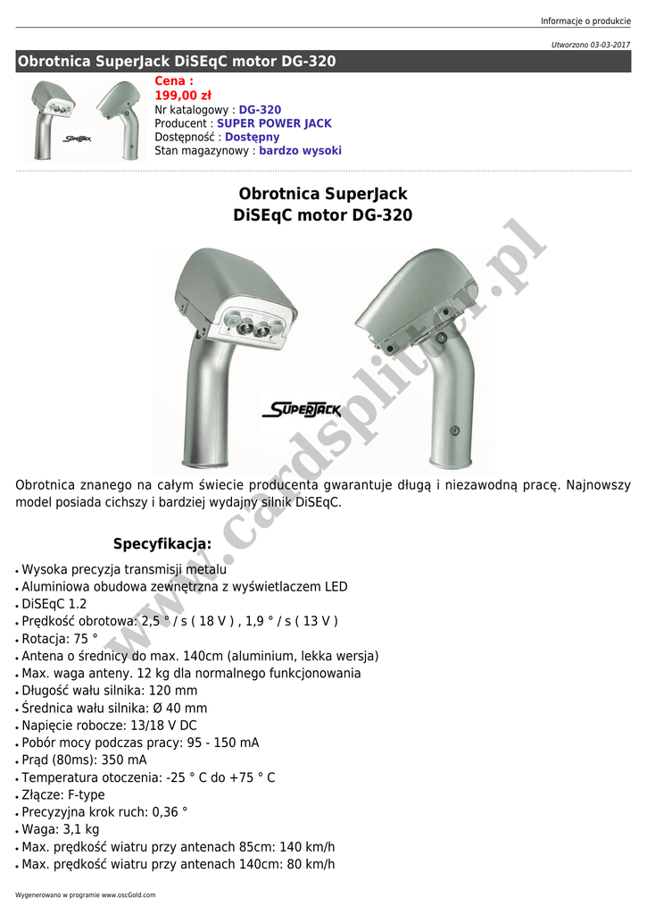 Informacje o produkcie Utworzono 03-03-2017 Obrotnica SuperJack DiSEqC motor DG-320 Cena : 199,00 zł Nr katalogowy : DG-320 Producent : SUPER POWER JACK Dostępność : Dostępny Stan magazynowy : bardzo wysoki ar d sp lit te r .p l Obrotnica SuperJack DiSEqC motor DG-320 w .c Obrotnica znanego na całym świecie producenta gwarantuje długą i niezawodną pracę. Najnowszy model posiada cichszy i bardziej wydajny silnik DiSEqC. Specyfikacja: ● ● ● ● ● ● ● ● ● ● ● ● ● ● ● ● ● Wysoka precyzja transmisji metalu Aluminiowa obudowa zewnętrzna z wyświetlaczem LED DiSEqC 1.2 Prędkość obrotowa: 2,5 ° / s ( 18 V ) , 1,9 ° / s ( 13 V ) Rotacja: 75 ° Antena o średnicy do max. 140cm (aluminium, lekka wersja) Max. waga anteny. 12 kg dla normalnego funkcjonowania Długość wału silnika: 120 mm Średnica wału silnika: Ø 40 mm Napięcie robocze: 13/18 V DC Pobór mocy podczas pracy: 95 - 150 mA Prąd (80ms): 350 mA Temperatura otoczenia: -25 ° C do +75 ° C Złącze: F-type Precyzyjna krok ruch: 0,36 ° Waga: 3,1 kg Max. prędkość wiatru przy antenach 85cm: 140 km/h Max. prędkość wiatru przy antenach 140cm: 80 km/h w w ● Wygenerowano w programie www.oscGold.com ● .p l ● sp lit te r ● ar d ● Max. moment obrotowy podczas pracy: 15 Nm Max. moment obrotowy w stylu jak 150 Nm 2 Przycisk Obudowa Wschód / Zachód z funkcją resetu Wymiary (SxWxG): 350 x 175 x 110 Żywotność: 50000 wstawki do 160 ° (80 ° E + 80 ° W) Gwarancja: 12miesięcy w .c ● w w ●