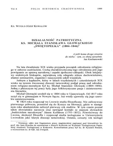 Vol. 6 Ks. FOLIA HISTORICA CRACOVIENSIA 1999 W it o l d J ó z e f K o w a l ó w DZIAŁALNOŚĆ PATRIOTYCZNA KS. MICHAŁA STANISŁAWA GŁOWACKIEGO „ŚWIĘTOPEŁKA” (1804-1846)1 A je śli komu droga otwarta do nieba - tym, co służą ojczyźnie. Ja n K o ch an o w sk i Na lata dwudzieste XIX wieku przypada początek odrodzenia religijne go w zaborze austriackim. Cechą charakterystyczną tego odrodzenia je st jego powiązanie ze sprawą narodową i aspekt społeczno-chłopski. Obok inicjaty wy niektórych biskupów, największą rolę odegrało niższe duchowieństwo, alumni seminariów, organiści i nauczyciele szkół wiejskich. Jednym z kapłanów, który w latach trzydziestych i czterdziestych XIX wieku na terenie ówczesnej diecezji tarnowskiej podjął pracę nad odrodze niem religijno-moralnym był ks. Michał Stanisław Głowacki (1804-1846). Jedną z płaszczyzn tej pracy były jego folklorystyczne pasje i zainteresowa nia literackie. M ichał Głowacki urodził się w 1804 roku w Ujanowicach. Od 1817 roku uczył się w gimnazjum w Nowym Sączu. Już wtedy ujawniły się jego szero kie zainteresowania. W 1824 roku rozpoczął we Lwowie studia filozoficzne. Nie zaliczywszy pierwszego półrocza, przeniósł się do Koszyc na Słowacji, gdzie w następ nym roku akademickim zaliczył pierwszy rok studiów. W tym czasie poznał także słowiańskie narzecza oraz nawiązał kontakt ze znanym słowackim „budzicielem narodowym” Janem Kollarem (1793-1852). Powróciwszy do Lwowa, skończył filozofie i rozpoczął studia teologiczne w Uniwersytecie Lwowskim jako kleryk diecezji tarnowskiej. Ostatni, czwarty rok teologii 1 N iniejszy szkic jest fragmentem pracy magisterskiej napisanej pod kierunkiem ks. prof. dra Jana Kracika na seminarium z historii Kościoła na Wydziale Teologicznym Papie skiej Akademii Teologicznej w Krakowie. Konsultantem pracy był ks. dr Ryszard Banach, a recenzentem ks. dr hab. Jan Związek. 190 K s. W it o l d J ó zef K o w a l ó w (tzw. studium pastoralne) ukończył w Tarnowie. W 1831 roku, gdy w Króle stwie Polskim upadło powstanie listopadowe, Michał Głowacki przyjął świę cenia kapłańskie. Oprócz zwykłej pracy kapłańskiej ks. M ichał Głowacki podjął szeroką działalność literacko-folklorystyczną. Jego największym wkładem w kulturę polską jest to, że jako pierwszy spisał teksty pieśni górali tatrzańskich oraz legendę o śpiących rycerzach w Tatrach. Po pracy kapłańskiej jako wikariusz w Nowym Sączu (1831-1833), Żabnie i Odpoiyszowie (1833-1837) i Żywcu (1837-1842) został skierowany do pracy w Poroninie na Podhalu, gdzie był duszpasterzem w latach 1842-1846 (w latach 1843-1844 był administrato rem tej parafii). W 1846 roku był jednym z głównych organizatorów po wstania narodowego na Podhalu, które przeszło do historii jako powstanie chochołowskie, w wyniku czego został aresztowany. Zmarł w nowosądeckim więzieniu. Dzisiaj ten folklorysta, bibliofil i patriota jest zapomniany. W niniej szym szkicu przypomnimy fakty jakie rozegrały się tuż przed, w trakcie i po upadku powstania chochołowskiego. 1. POCZĄTKI DZIAŁALNOŚCI PATRIOTYCZNEJ 1.1. PIERWSZE ZETKNIĘCIE SIĘ Z PRACĄ NARODOWĄ Michał Głowacki już jako gimnazjalista, posiadając kilkuset tomowy księgozbiór ma w swych zbiorach „nieszkolne” książki historyczne i literatu rę piękną, które wówczas były narzędziem obrony przed utratą tożsamości narodowej. Udostępniając swe skarby kolegom w germanizującycn gimna zjach w Tarnowie i Nowym Sączu, chcąc nie chcąc, prowadzi pośród nich działalność narodową. W okresie studiów uniwersyteckich we Lwowie Głowacki zajmując się literaturą i poezją, polską oraz słowiańska,, wkracza w rzesze patriotycznej młodzieży, której sprawa narodowa leżała na sercu. Wpływ romantycznej i niepodległościowej atmosfery stołecznego Lwowa na M ichała Głowackiego był niewątpliwy. Zadajmy sobie pytanie czy brał on udział w pracach jakie goś związku młodzieży, poza uczestnictwem w konspiracji w seminariach duchownych obrządków rzymsko- i grekokatolickiego we Lwowie. W 1826 roku we Lwowie istniał tajny, zrzeszający kilkudziesięciu studentów, Zwią zek Czarnych Braci, prawdopodobnie o rewolucyjnym charakterze2. O tym, czy Głowacki brał w nim udział nic nam nie wiadomo, podobnie jak niewiele wiemy o samej organizacji. Obok Związku Braci Czarnych, „prawdopo dobnie równocześnie istniały także inne towarzystwa studenckie „zatrudnia jące się” literaturą i poezją, choć żadnych nie ma o nich wiadomości. Uni wersytet Lwowski stanowił wówczas przecież półtoratysięczne środowisko 2 Aleksander K a m i ń s k i , Polskie związki młodzieży (1804—1831), W arszawa 1963, s. 273-275. DZIAŁALNOŚĆ PATRIOTYCZNA KS. MICHAŁA STANISŁAWA GŁOWACKIEGO. 191 młodzieży”3. Znając poglądy i osobowość Głowackiego możemy go „podej rzewać” o udział w takowych organizacjach. Przejdźmy jednak ze sfery do mysłów do udokumentowanych faktów. 1830 rok jest dla Głowackiego przełomowym i zapewne zaważył na podjęciu przezeń systematycznej pracy narodowej. W końcu sierpnia tegoż roku przebywa w Krakowie, uważanym powszechnie za skrawek niepodległej Polski. To miasto sprawiło, że Głowackiego „myśli stęsknione cudnie za kwitły” i „swemi pamiątkami pozostałemi na całe życie hojnie wyposażyło”. Pełen bardzo gorąco przeżywanego patriotyzmu jest dalszy opis jego pobytu w „świątyni starożytności i dziejów” : „Rozumiałem ja rozprawy [i] skargi wszystkich miejsc dokładnie - bo któżby nie zrozumi[a]ł się z matką choć dawno obumarłą. Mówiliśmy z so b ą płakaliśmy wzajemnie, układaliśmy przyszłość - Bóg wie czyli szczęśliwą”. Głowacki w Krakowie, mieście do świadczonym wieloma nieszczęściami i klęskami, ulega jego „patryalchalnej i niepodległej” atmosferze4. Drugim faktem, który wyw