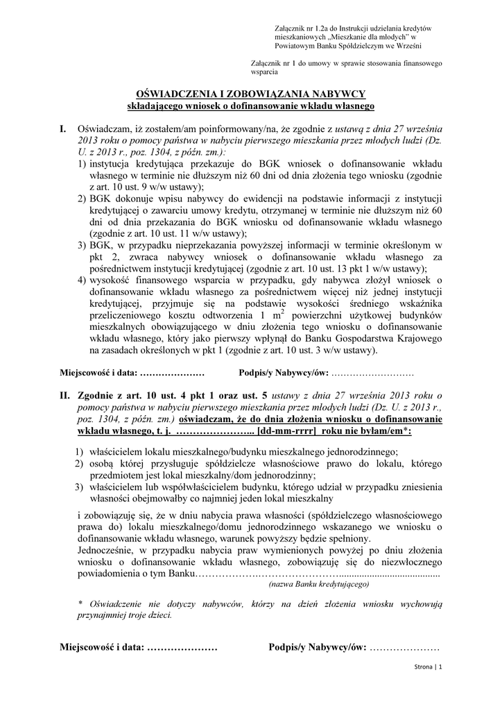 Załącznik nr 1.2a do Instrukcji udzielania kredytów mieszkaniowych „Mieszkanie dla młodych” w Powiatowym Banku Spółdzielczym we Wrześni Załącznik nr 1 do umowy w sprawie stosowania finansowego wsparcia OŚWIADCZENIA I ZOBOWIĄZANIA NABYWCY składającego wniosek o dofinansowanie wkładu własnego I. Oświadczam, iż zostałem/am poinformowany/na, że zgodnie z ustawą z dnia 27 września 2013 roku o pomocy państwa w nabyciu pierwszego mieszkania przez młodych ludzi (Dz. U. z 2013 r., poz. 1304, z późn. zm.): 1) instytucja kredytująca przekazuje do BGK wniosek o dofinansowanie wkładu własnego w terminie nie dłuższym niż 60 dni od dnia złożenia tego wniosku (zgodnie z art. 10 ust. 9 w/w ustawy); 2) BGK dokonuje wpisu nabywcy do ewidencji na podstawie informacji z instytucji kredytującej o zawarciu umowy kredytu, otrzymanej w terminie nie dłuższym niż 60 dni od dnia przekazania do BGK wniosku od dofinansowanie wkładu własnego (zgodnie z art. 10 ust. 11 w/w ustawy); 3) BGK, w przypadku nieprzekazania powyższej informacji w terminie określonym w pkt 2, zwraca nabywcy wniosek o dofinansowanie wkładu własnego za pośrednictwem instytucji kredytującej (zgodnie z art. 10 ust. 13 pkt 1 w/w ustawy); 4) wysokość finansowego wsparcia w przypadku, gdy nabywca złożył wniosek o dofinansowanie wkładu własnego za pośrednictwem więcej niż jednej instytucji kredytującej, przyjmuje się na podstawie wysokości średniego wskaźnika przeliczeniowego kosztu odtworzenia 1 m2 powierzchni użytkowej budynków mieszkalnych obowiązującego w dniu złożenia tego wniosku o dofinansowanie wkładu własnego, który jako pierwszy wpłynął do Banku Gospodarstwa Krajowego na zasadach określonych w pkt 1 (zgodnie z art. 10 ust. 3 w/w ustawy). Miejscowość i data: ………………… Podpis/y Nabywcy/ów: ……………………… II. Zgodnie z art. 10 ust. 4 pkt 1 oraz ust. 5 ustawy z dnia 27 września 2013 roku o pomocy państwa w nabyciu pierwszego mieszkania przez młodych ludzi (Dz. U. z 2013 r., poz. 1304, z późn. zm.) oświadczam, że do dnia złożenia wniosku o dofinansowanie wkładu własnego, t. j. …………………... [dd-mm-rrrr] roku nie byłam/em*: 1) właścicielem lokalu mieszkalnego/budynku mieszkalnego jednorodzinnego; 2) osobą której przysługuje spółdzielcze własnościowe prawo do lokalu, którego przedmiotem jest lokal mieszkalny/dom jednorodzinny; 3) właścicielem lub współwłaścicielem budynku, którego udział w przypadku zniesienia własności obejmowałby co najmniej jeden lokal mieszkalny i zobowiązuję się, że w dniu nabycia prawa własności (spółdzielczego własnościowego prawa do) lokalu mieszkalnego/domu jednorodzinnego wskazanego we wniosku o dofinansowanie wkładu własnego, warunek powyższy będzie spełniony. Jednocześnie, w przypadku nabycia praw wymienionych powyżej po dniu złożenia wniosku o dofinansowanie wkładu własnego, zobowiązuję się do niezwłocznego powiadomienia o tym Banku……………….……………………........................................ (nazwa Banku kredytującego) * Oświadczenie nie dotyczy nabywców, którzy na dzień złożenia wniosku wychowują przynajmniej troje dzieci. Miejscowość i data: ………………… Podpis/y Nabywcy/ów: ………………… Strona | 1 III. Zgodnie z art. 10 ust. 4 pkt 2 ustawy z dnia 27 września 2013 roku o pomocy państwa w nabyciu pierwszego mieszkania przez młodych ludzi (Dz. U. z 2013 r., poz. 1304, z późn. zm.) oświadczam, że na dzień złożenia wniosku o dofinansowanie wkładu własnego, t. j. …………………………..… [dd-mm-rrrr] roku: Nabywca I TAK NIE Nabywca II TAK NIE 1) jestem najemcą lokalu mieszkalnego, innego, niż mieszkanie, na które wnioskowane jest dofinansowanie wkładu własnego*; 2) przysługuje mi spółdzielcze lokatorskie prawo do lokalu mieszkalnego* i zobowiązuję się, w terminie nie przekraczającym 6 m–cy od daty zawarcia umowy, mocą której nastąpi przeniesienie własności (spółdzielczego własnościowego prawa do) mieszkania, do (dotyczy, jeżeli powyżej wstawiono znak „X” przy odpowiedzi „Tak”): Nabywca I 1) rozwiązania umowy mieszkalnego*; najmu i opróżnienia Nabywca II lokalu 2) zrzeczenia się spółdzielczego lokatorskiego prawa do lokalu mieszkalnego na rzecz spółdzielni mieszkaniowej i opróżnienia tego lokalu*. *wstawić znak „X” przy właściwej odpowiedzi Miejscowość i data: ………………… Podpis/y Nabywcy/ów: ………………… IV. Zgodnie z art. 10 ust. 4 pkt 3 ustawy z dnia 27 września 2013 r. o pomocy państwa w nabyciu pierwszego mieszkania przez młodych ludzi (Dz. U. z 2013 r., poz. 1304, z późn. zm.) oświadczam, że lokal mieszkalny/dom jednorodzinny wskazany we wniosku o dofinansowanie wkładu własnego nabywam w celu zaspokojenia własnych potrzeb mieszkaniowych. Miejscowość i data: ……………… Podpis/y Nabywcy/ów: ……………………… V. Wyrażam zgodę na przekazanie do Banku Gospodarstwa Krajowego (zwanego dalej BGK) informacji zamieszczonych we wniosku o dofinansowanie wkładu własnego, stanowiących chronione dane osobowe, zgodnie z art. 23 ust. 1 pkt 1 ustawy z dnia 29 sierpnia 1997 r. o ochronie danych osobowych (Dz. U. z 2014 r., poz. 1182, z późn. zm.) oraz informacje objęte tajemnicą bankową, zgodnie z art. 104 ust. 3 ustawy z dnia 29 sierpnia 1997r. Prawo bankowe (Dz. U. z 2015 r., poz. 128, z późn. zm.) w związku z ubieganiem się o dofinansowanie wkładu własnego na nabycie mieszkania zgodnie z warunkami ustawy z dnia 27 września 2013 r. o pomocy państwa w nabyciu pierwszego mieszkania przez młodych ludzi (Dz. U. z 2013 r., poz. 1304, z późn. zm.). Miejscowość i data: …………… Podpis/y Nabywcy/ów: ……………………… Strona | 2 Oświadczam/y, że: 1. Powyższa zgoda została udzielona dobrowolnie. Zostałem/am/liśmy* poinformowany/a/i* o przysługującym m