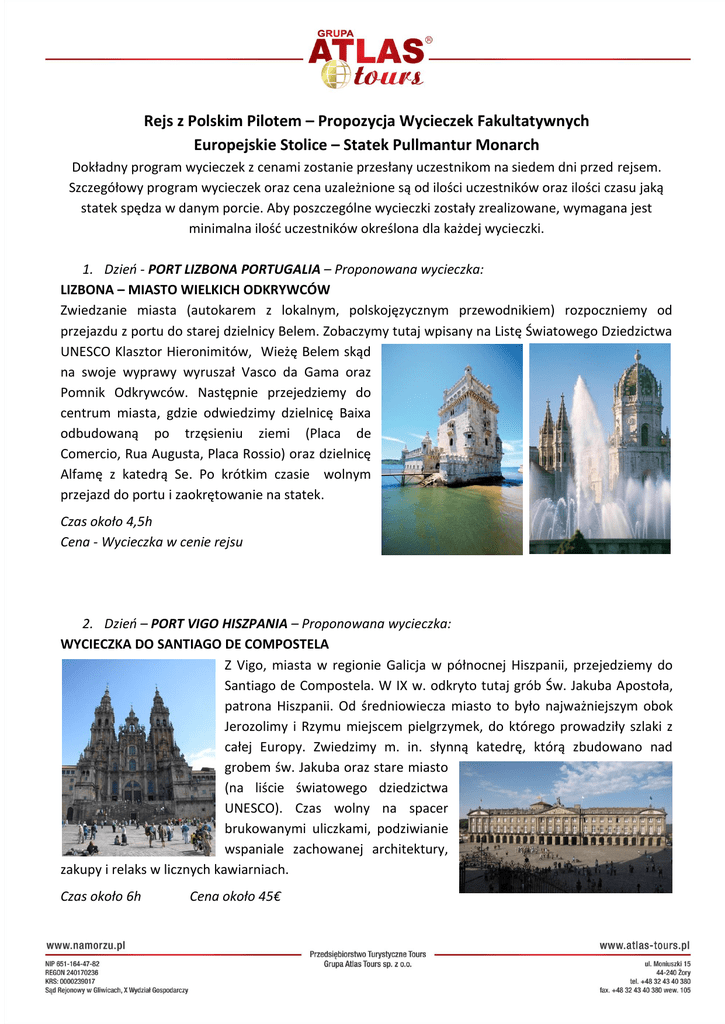 Rejs z Polskim Pilotem – Propozycja Wycieczek Fakultatywnych Europejskie Stolice – Statek Pullmantur Monarch Dokładny program wycieczek z cenami zostanie przesłany uczestnikom na siedem dni przed rejsem. Szczegółowy program wycieczek oraz cena uzależnione są od ilości uczestników oraz ilości czasu jaką statek spędza w danym porcie. Aby poszczególne wycieczki zostały zrealizowane, wymagana jest minimalna ilość uczestników określona dla każdej wycieczki. 1. Dzień - PORT LIZBONA PORTUGALIA – Proponowana wycieczka: LIZBONA – MIASTO WIELKICH ODKRYWCÓW Zwiedzanie miasta (autokarem z lokalnym, polskojęzycznym przewodnikiem) rozpoczniemy od przejazdu z portu do starej dzielnicy Belem. Zobaczymy tutaj wpisany na Listę Światowego Dziedzictwa UNESCO Klasztor Hieronimitów, Wieżę Belem skąd na swoje wyprawy wyruszał Vasco da Gama oraz Pomnik Odkrywców. Następnie przejedziemy do centrum miasta, gdzie odwiedzimy dzielnicę Baixa odbudowaną po trzęsieniu ziemi (Placa de Comercio, Rua Augusta, Placa Rossio) oraz dzielnicę Alfamę z katedrą Se. Po krótkim czasie wolnym przejazd do portu i zaokrętowanie na statek. Czas około 4,5h Cena - Wycieczka w cenie rejsu 2. Dzień – PORT VIGO HISZPANIA – Proponowana wycieczka: WYCIECZKA DO SANTIAGO DE COMPOSTELA Z Vigo, miasta w regionie Galicja w północnej Hiszpanii, przejedziemy do Santiago de Compostela. W IX w. odkryto tutaj grób Św. Jakuba Apostoła, patrona Hiszpanii. Od średniowiecza miasto to było najważniejszym obok Jerozolimy i Rzymu miejscem pielgrzymek, do którego prowadziły szlaki z całej Europy. Zwiedzimy m. in. słynną katedrę, którą zbudowano nad grobem św. Jakuba oraz stare miasto (na liście światowego dziedzictwa UNESCO). Czas wolny na spacer brukowanymi uliczkami, podziwianie wspaniale zachowanej architektury, zakupy i relaks w licznych kawiarniach. Czas około 6h Cena około 45€ 3. Dzień - NA MORZU – Wypoczynek i korzystanie z atrakcji oferowanych przez statek 4. Dzień - PORT BILBAO HISZPANIA– Proponowana wycieczka: BILBAO – KRAJ BASKÓW Bilbao, leżące w północnej Hiszpanii jest stolicą prowincji i największym miastem Baskijskiego Regionu Autonomicznego. Od 1300 roku kiedy jako mała osada otrzymało prawa miejskie miasto rozrosło się do pozycji głównego ośrodka baskijskiego ruchu narodowego oraz jednego z najważniejszych ośrodków gospodarczych i kulturalnych w Hiszpanii. Z portu morskiego Getxo, przejedziemy do Centrum Bilbao. Podczas spaceru z pilotem zobaczymy słynne muzeum Guggenheima. Bogate współczesne zbiory oraz robiący ogromne wrażenie nowoczesny budynek zapewniły miastu mocną pozycję na kulturalnej mapie kraju. Przejdziemy prze Casco Viejo czyli stare miasto, gdzie zobaczymy m. in. katedrę św. Jakuba, Plaza Nueva, Teatro Arriaga oraz most Puente del Arenal. Po przerwie na typowe baskijskie przekąski tapas powrócimy do portu morskiego. Czas około 6h Cena około 30€ 5. Dzień - NA MORZU – Wypoczynek i korzystanie z atrakcji oferowanych przez statek 6. Dzień - PORT DOVER WIELKA BRYTANIA – Proponowana wycieczka: STOLICA WIELKIEJ BRYTANI – LONDYN Stolica Wielkiej Brytanii Londyn to jedno z największych miast Europy (zamieszkuje w nim ponad 8 mln osób). Jest też ważnym światowym centrum finansowym z siedzibą największej europejskiej giełdy. Miasto słynie z najstarszego metra, bogatej historii, wielu parków, piętrowych autobusów i rodziny królewskiej. Z portu w Dover pojedziemy do Londynu. Podczas spaceru z pilotem zobaczymy centrum miasta z jego najważniejszymi obiektami. Zwiedzimy Opactwo Westminsterskie, które przez wieki było miejscem koronacji i pochówku królów Angielskich. Następnie zobaczymy St. Margaret's Church, parlament, Big Ben oraz most Westminsterski. Przejdziemy przez Downing Street, zatrzymamy się na Trafalgar Square. Zwiedzimy National Gallery oraz St. Martin in the Fields. Odwiedzimy dzielnicę Chinatown, dzielnicę rozrywki Soho (będzie tu czas wolny) oraz plac Piccadilly Circus. Na zakończenie odwiedzimy Bucingham Palace oraz przejdziemy przez St. James's Park. Czas około 9h Cena około 70€ 7. Dzień - PORT IJMUIDEN HOLANDIA – Proponowana wycieczka: WYCIECZKA DO STOLICY HOLANDII - AMSTERDAMU Po spotkaniu w porcie Ijmuiden z lokalnym polskojęzycznym przewodnikiem, przejedziemy do Amsterdamu, stolicy Holandii. Podczas zwiedzania miasta w pierwszej część naszej wycieczki odbędziemy panoramiczny przejazd autokarem przez najciekawsze dzielnice m.in. Dam Square, Centraal Station oraz XVII wieczne centrum. W drugiej części wycieczki pospacerujemy przez dzielnicę chińską oraz przez tzw. Red Light District (Dzielnicę Czerwonych Latarni), zobaczymy także okolice Waterlooplein - cześć dawnej dzielnicy żydowskiej. W programie także czas wolny w okolicach targu kwiatowego Singel oraz relaksujący, godzinny rejs przeszkloną łodzią po najpiękniejszych kanałach Amsterdamu. Powrót do portu w Ijmuiden. Czas około 7h Cena około 65€ 8. Dzień - NA MORZU – Wypoczynek i korzystanie z atrakcji oferowanych przez statek 9. Dzień - PORT KOPENHAGA DANIA – Proponowana wycieczka: KOPENHAGA – ZWIEDZANIE MIASTA I REJS ŁODZIĄ PO KANAŁACH KOPENHAGI W pierwszej części wycieczki (z lokalnym polskojęzycznym przewodnikiem) będziemy zwiedzać miasto autokarem, zatrzymując się przy najważniejszych jego miejscach m. in.: Pałace Królewskie, ratusz, pomnik małej syrenki z baśni Andersena, katedra oraz stare miasto. W drugiej części naszej wycieczki popłyniemy łodzią w ponad godzinny rejs po kanałach stolicy Danii i zobaczymy tym razem miasto od strony wody. Po rejsie czas wolny na spacer głównym deptakiem miasta z licznymi atrakcjami i muzeami. Będzie również czas na skosztowanie lokalnego przysmaku jakim jest śledź przyrządzany na kilkanaście sposobów. Czas około 7h Cena około 45€ 10. Dzień - PORT ROSTOK NIEMCY – Wyokrętowanie *Opublikowane w materiałach in