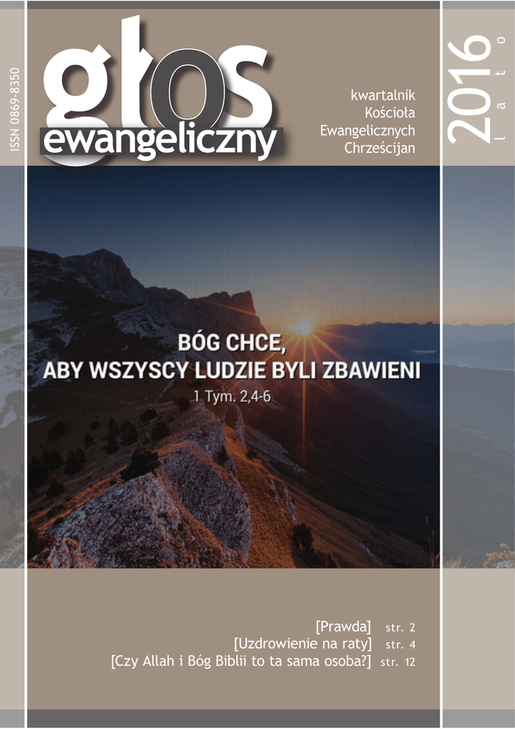 [Prawda] [Uzdrowienie na raty] [Czy Allah i Bóg Biblii to ta sama osoba?] str. 2 str. 4 str. 12 l a t o 2016 ISSN 0869-8350 kwartalnik Kościoła Ewangelicznych Chrześcijan [słowo od Prezbitera Naczelnego] „Przeto, odrzuciwszy kłamstwo mówcie prawdę, każdy z bliźnim swoim, bo SŁOWO OD GŁOS EWANGELICZNY – LATO – 2016 PREZBITERA NACZELNEGO 2 Cezary Komisarz pastor, Prezbiter Naczelny jesteśmy członkami jedni drugich” – Efezjan 4,25. PRAWDA W czasach postmodernizmu, gdy PRAWDA oraz jej autorytet staje się towarem deficytowym, gdy mnogość „prawd” za wszelką cenę usiłuje deprecjonować PRAWDĘ Bożego Słowa, jako Kościół Jezusa Chrystusa jesteśmy wezwani do mówienia prawdy, życia prawdą i dawania świadectwa prawdzie. Bez prawdy zarówno jednostki, jak i całe grupy społeczne błądzą po bezdrożach kłamstwa, insynuacji czy sugestii. Podobnie jak Piłat w Ew. Jana 18,38, dzisiejszy człowiek często zadaje sobie pytanie: „Gdzie jest prawda?”. Pan Jezus odpowiada, że jedynie On jest PRAWDĄ, On dał swojemu Kościołowi PRAWDĘ Słowa oraz Ducha PRAWDY, który wprowadza nas we wszelką PRAWDĘ. PRAWDA winna być cechą każdego wierzącego, jednak tak się nie dzieje, gdyż nie jest to coś automatycznie przypisanego nam w momencie nawrócenia, jak zbawienie, czy przebaczenie grzechów. O PRAWDĘ trzeba zabiegać, w PRAWDZIE należy trwać, na prawdzie należy budować i często PRAWDY trzeba dociekać, a wręcz o nią walczyć. Co gorsze, PRAWDA jest niemile widziana w dzisiejszym świecie, gdyż już nie tylko „kole w oczy” niewierzących, ale coraz częściej – cóż za nieszczęście! – staje się solą w oku wierzących (Galacjan 4,16). PRAWDA budowana jest na faktach, a nie na odczuciach i pragnieniach. Wrogiem PRAWDY są nie tylko kłamstwo czy półprawdy, ale również wszelkiego rodzaju insynuacje i nieuczciwe sugestie. PRAWDA nie poddaje się presji okoliczności i brzmi tak samo jednoznacznie tam, gdzie jest akceptowana, jak również tam, gdzie jest znienawidzona, bez względu na koszt i konsekwencje. Proponuję krótki test, który pozwoli nam nie tylko odpowiedzieć sobie na pytanie: „Czy jestem człowiekiem Prawdy?”, ale również zrozumieć nasz stosunek do PRAWDY. Czy jesteśmy prawdziwi w mowie, zachowaniu, motywacjach? Czy czasami naginamy prawdę, upiększamy lub uszczuplamy dla osiągnięcia lepszego rezultatu? Czy czasami prawda nas przeraża i dlatego ją wypieramy? Czy dopuszczamy „kłamstwo”, dopóki nie rani ono innych? Jak się czujemy kłamiąc? Jak się czujemy wiedząc, że jesteśmy okłamywani? Czy jesteśmy naprawdę gotowi, aby ludzie mówili nam tylko prawdę? Przeprowadźmy teraz bilans zysków i strat w kwestii PRAWDY: CO daje nam PRAWDA Fundament i oparcie, które chronią nas w czasie życiowej burzy. Kotwicę, dzięki której nie będziemy dryfowali z wiatrem. Drogowskaz, który prowadzi do celu. Mądrość, która pomaga w życiowych decyzjach. Siłę do przeciwstawiania się kłamstwu. Radość z pokoju. Komfort pewności konsekwencji. CO się dzieje bez PRAWDY? Zaczynamy wierzyć w kłamstwa. Rozwijamy w sobie złe nawyki, które kształtują nasz charakter. Jak budować w sobie PRAWDĘ? Zrobić uczciwy rachunek zysków i strat. Okazuje się, że w większości przypadków kłamstwo nie było ani opłacalne, ani nawet konieczne. Obserwować rezultaty mówienia PRAWDY i cieszyć się nimi. Uczciwie wyznać grzech kłamstwa i powody, jakie nim kierowały. Prosić Pana Boga o niegasnące pragnienie PRAWDY. Zidentyfikować dziedziny naszego życia, w których brakuje PRAWDY i szczególnie je pielęgnować. Napełniać siebie oraz innych ludzi PRAWDĄ, a odrzucić wszelkie kłamstwa i nie szukać towarzystwa kłamców. Podsycać pragnienie PRAWDY poprzez przebywanie z innymi Ludźmi PRAWDY. Uznać prawdomówność za fundamentalną zasadę życiową, bez względu na konsekwencje. Pan Jezus powiedział: Wywiedzcie się PRAWDY, a ona uczyni was wolnymi. Drodzy w Chrystusie, moją modlitwą jest, aby Kościół Ewangelicznych Chrześcijan był kościołem wolnych, prawdomównych i szczerych wobec siebie chrześcijan. ISSN 0869-8350 Głos Ewangeliczny jest organem prasowym Kościoła Ewangelicznych Chrześcijan w Polsce. Redagują: Szymon Matusiak, Mariusz Socha, Tadeusz Tołwiński (red. naczelny) Głos Ewangeliczny w roku 2016 ukaże się kwartalnie, w numerach: Wiosna, Lato, Jesień, Zima 6 cena: zł + koszt przesyłki zł prenumerata roczna: 32 Misje w Kościele: Kościół Ewangelicznych Chrześcijan ul. Zagórna 10, 00-441 Warszawa tel./fax 22 622 79 40 [email protected], Zamówienia prosimy kierować na adres: www.kech.pl „Głos Ewangeliczny”, ul. Zagórna 10, 00-441 Warszawa, Poland, tel. 22 622 79 40; Cezary Komisarz – Prezbiter Naczelny e-mail: [email protected] Jacek Duda – z-ca Przewodniczącego RK Leon Dziadkowiec – Sekretarz Ofiary na potrzeby wydawnictwa z kraju i zagranicy prosimy kierować na adres: Daniel Krystoń – Skarbnik KECh (Głos Ewangeliczny); PKO-BP XV O/M. Warszawa Członkowie Rady Kościoła – Piotr Dymkowski, Mariusz Nr 45 1020 1156 0000 7302 0071 3370 Bank Swift Code: BPKOPLPW Socha, Jan Tomczyk Komitet ds. Pracy wśród Dzieci ul. Wojciecha 8/2, 45-023 Opole tel. 77 456 75 60 e-mail: alicja _ [email protected] Misja „Nadzieja dla Wszystkich” Jarosław Gaudek ul. Browarna 7/41, 88-400 Żnin Agenda KECh Alfred Radzi al. Jedności Narodowej 11U/1 71-415 Szczecin Mariusz Socha 91 426 11 52 Fundacja Legatio ul. Zdrojowa 14, 87-816 Włocławek tel. 54 2364127 e-mail: [email protected] www.legatio.pl Fundacja Ewangeliczna ul. Myśliwska 2, 87-118 Toruń tel. 56 692 68 69 e-mail: [email protected] www.fewa.pl Agenda KECh Misja Namiotowa 00-441 Warszawa, ul. Zagórna 10 e-mail: [email protected] Cezary Komisarz 509 307 702 3 [Prawda] Żyjemy w emocjonalnej niewoli ciągłego strachu przed konsekwencjami ujawnienia PRAWDY. Brak duchowego wzrostu, gdyż kła