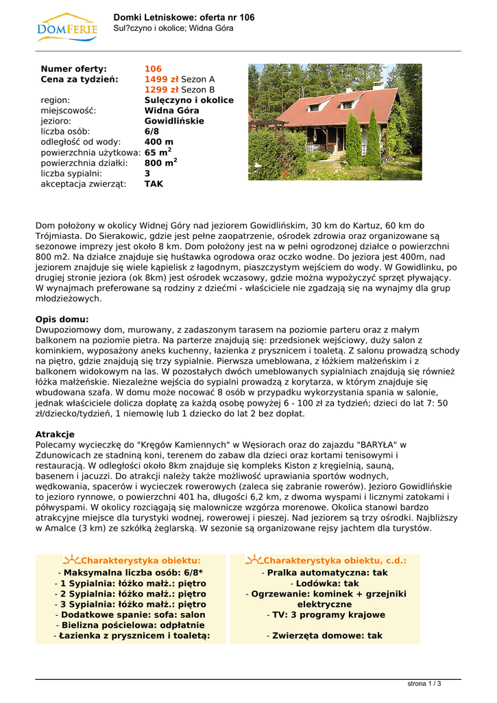 Domki Letniskowe: oferta nr 106 Sul?czyno i okolice; Widna Góra Numer oferty: Cena za tydzień: 106 1499 zł Sezon A 1299 zł Sezon B region: Sulęczyno i okolice miejscowość: Widna Góra jezioro: Gowidlińskie liczba osób: 6/8 odległość od wody: 400 m powierzchnia użytkowa: 65 m2 powierzchnia działki: 800 m2 liczba sypialni: 3 akceptacja zwierząt: TAK Dom położony w okolicy Widnej Góry nad jeziorem Gowidlińskim, 30 km do Kartuz, 60 km do Trójmiasta. Do Sierakowic, gdzie jest pełne zaopatrzenie, ośrodek zdrowia oraz organizowane są sezonowe imprezy jest około 8 km. Dom położony jest na w pełni ogrodzonej działce o powierzchni 800 m2. Na działce znajduje się huśtawka ogrodowa oraz oczko wodne. Do jeziora jest 400m, nad jeziorem znajduje się wiele kąpielisk z łagodnym, piaszczystym wejściem do wody. W Gowidlinku, po drugiej stronie jeziora (ok 8km) jest ośrodek wczasowy, gdzie można wypożyczyć sprzęt pływający. W wynajmach preferowane są rodziny z dziećmi - właściciele nie zgadzają się na wynajmy dla grup młodzieżowych. Opis domu: Dwupoziomowy dom, murowany, z zadaszonym tarasem na poziomie parteru oraz z małym balkonem na poziomie pietra. Na parterze znajdują się: przedsionek wejściowy, duży salon z kominkiem, wyposażony aneks kuchenny, łazienka z prysznicem i toaletą. Z salonu prowadzą schody na piętro, gdzie znajdują się trzy sypialnie. Pierwsza umeblowana, z łóżkiem małżeńskim i z balkonem widokowym na las. W pozostałych dwóch umeblowanych sypialniach znajdują się również łóżka małżeńskie. Niezależne wejścia do sypialni prowadzą z korytarza, w którym znajduje się wbudowana szafa. W domu może nocować 8 osób w przypadku wykorzystania spania w salonie, jednak właściciele dolicza dopłatę za każdą osobę powyżej 6 - 100 zł za tydzień; dzieci do lat 7: 50 zł/dziecko/tydzień, 1 niemowlę lub 1 dziecko do lat 2 bez dopłat. Atrakcje Polecamy wycieczkę do "Kręgów Kamiennych" w Węsiorach oraz do zajazdu "BARYŁA" w Zdunowicach ze stadniną koni, terenem do zabaw dla dzieci oraz kortami tenisowymi i restauracją. W odległości około 8km znajduje się kompleks Kiston z kręgielnią, sauną, basenem i jacuzzi. Do atrakcji należy także możliwość uprawiania sportów wodnych, wędkowania, spacerów i wycieczek rowerowych (zaleca się zabranie rowerów). Jezioro Gowidlińskie to jezioro rynnowe, o powierzchni 401 ha, długości 6,2 km, z dwoma wyspami i licznymi zatokami i półwyspami. W okolicy rozciągają się malownicze wzgórza morenowe. Okolica stanowi bardzo atrakcyjne miejsce dla turystyki wodnej, rowerowej i pieszej. Nad jeziorem są trzy ośrodki. Najbliższy w Amalce (3 km) ze szkółką żeglarską. W sezonie są organizowane rejsy jachtem dla turystów. Charakterystyka obiektu: - Maksymalna liczba osób: 6/8* - 1 Sypialnia: łóżko małż.: piętro - 2 Sypialnia: łóżko małż.: piętro - 3 Sypialnia: łóżko małż.: piętro - Dodatkowe spanie: sofa: salon - Bielizna pościelowa: odpłatnie - Łazienka z prysznicem i toaletą: Charakterystyka obiektu, c.d.: - Pralka automatyczna: tak - Lodówka: tak - Ogrzewanie: kominek + grzejniki elektryczne - TV: 3 programy krajowe - Zwierzęta domowe: tak strona 1 / 3 Domki Letniskowe: oferta nr 106 Sul?czyno i okolice; Widna Góra parter - Salon z kominkiem: parter - Kuchnia: parter - Kuchenka: 2 + kombiwar, elektryczna - Kuchenka mikrofalowa: tak - Czajnik: bezprzewodowy - Ciepła woda: podgrzewacz przepływowy - Grill przenośny: tak - Kąpiel w jeziorze: 400 m - Wypożyczalnia sprzętu wodnego: 3 km - Wędkowanie: wykup zezwolenia - Restauracja: 4 km - Lekarz: 7 km - Sklep spożywczy: 1,5 km - Stadnina koni: 7/12 km *) Dopłata za każdą osobę powyżej 6: 100 zł/tydzień, dzieci do lat 7: 50 zł/tydzień, 1 niemowlę lub 1 dziecko do lat 2 bez dopłat - maksymalnie 8 osób. CENNIK: Podana poniżej i wyróżniona na pomarańczowo cena jest całkowitą ceną wynajmu domu na 1 tydzień - od soboty do soboty (zawiera w sobie kwotę rezerwacji i zaliczki). Dodatkowo dolicza się podane niżej opłady obowiązkowe i/lub nieobowiązkowe. Sezon A Sezon B TYLKO Weekendy: 25.06. - 20.08.2011. Poza sezonem A 29.04 - 03.05 (4 doby) wynajem za 1 tydzień w tym: 1499 zł/tydz (6 osób) 1299 zł/tydz (6 osób) 849 zł za 3 doby 1049 zł za 4 doby (6 osób) - rezerwacja 299 zł/tydz 279 zł/tydz 249 zł/pobyt - zaliczka 200 zł/tydz 200 zł/tydz 200 zł/pobyt OPŁATY DODATKOWE: 1. Zużycie energii elekt. wg wskazań licznika; koszt 70 gr. za 1 kWh. 2. Dopłata za każdą osobę powyżej 6*: 100 zł/tydzień, dzieci do lat 7: 50 zł/tydzień, niemowlęta i dzieci do lat 2 bez dopłat - maksymalnie 8 osób 3. Zużycie wody 5 zł za 1 m3 4. Opłata za 120l worek na śmieci 10zł/szt. 5. Sprzątanie domu po zakończeniu turnusu 80 zł jeżeli najemca nie chce sam wykonać tej pracy 6. Bielizna pościelowa 10 zł/osoba/pobyt 7. Drewno do kominka we własnym zakresie (można zakupić w tartaku, odległość ok. 5km) 8. Każde zwierzę 50 zł/tydzień* *W przypadku krótszych wynajmów opłaty naliczane są jak za cały tydzień KAUCJA 300 zł strona 2 / 3 Domki Letniskowe: oferta nr 106 Sul?czyno i okolice; Widna Góra Kaucja, pobierana przez właściciela w momencie przekazania kluczy, jest zwracana najemcy po potrąceniu kwoty opłat dodatkowych oraz ewentualnych uzasadnionych kosztów szkód powstałych z jego winy. strona 3 / 3 Powered by TCPDF (www.tcpdf.org)