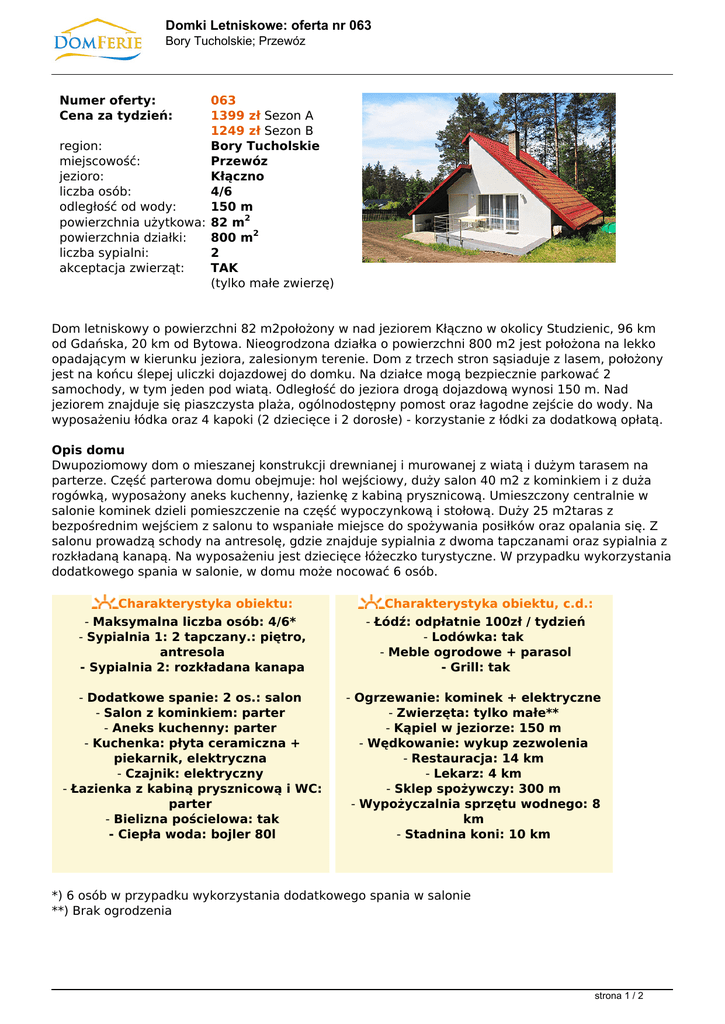 Domki Letniskowe: oferta nr 063 Bory Tucholskie; Przewóz Numer oferty: Cena za tydzień: 063 1399 zł Sezon A 1249 zł Sezon B region: Bory Tucholskie miejscowość: Przewóz jezioro: Kłączno liczba osób: 4/6 odległość od wody: 150 m powierzchnia użytkowa: 82 m2 powierzchnia działki: 800 m2 liczba sypialni: 2 akceptacja zwierząt: TAK (tylko małe zwierzę) Dom letniskowy o powierzchni 82 m2położony w nad jeziorem Kłączno w okolicy Studzienic, 96 km od Gdańska, 20 km od Bytowa. Nieogrodzona działka o powierzchni 800 m2 jest położona na lekko opadającym w kierunku jeziora, zalesionym terenie. Dom z trzech stron sąsiaduje z lasem, położony jest na końcu ślepej uliczki dojazdowej do domku. Na działce mogą bezpiecznie parkować 2 samochody, w tym jeden pod wiatą. Odległość do jeziora drogą dojazdową wynosi 150 m. Nad jeziorem znajduje się piaszczysta plaża, ogólnodostępny pomost oraz łagodne zejście do wody. Na wyposażeniu łódka oraz 4 kapoki (2 dziecięce i 2 dorosłe) - korzystanie z łódki za dodatkową opłatą. Opis domu Dwupoziomowy dom o mieszanej konstrukcji drewnianej i murowanej z wiatą i dużym tarasem na parterze. Część parterowa domu obejmuje: hol wejściowy, duży salon 40 m2 z kominkiem i z duża rogówką, wyposażony aneks kuchenny, łazienkę z kabiną prysznicową. Umieszczony centralnie w salonie kominek dzieli pomieszczenie na część wypoczynkową i stołową. Duży 25 m2taras z bezpośrednim wejściem z salonu to wspaniałe miejsce do spożywania posiłków oraz opalania się. Z salonu prowadzą schody na antresolę, gdzie znajduje sypialnia z dwoma tapczanami oraz sypialnia z rozkładaną kanapą. Na wyposażeniu jest dziecięce łóżeczko turystyczne. W przypadku wykorzystania dodatkowego spania w salonie, w domu może nocować 6 osób. Charakterystyka obiektu: - Maksymalna liczba osób: 4/6* - Sypialnia 1: 2 tapczany.: piętro, antresola - Sypialnia 2: rozkładana kanapa - Dodatkowe spanie: 2 os.: salon - Salon z kominkiem: parter - Aneks kuchenny: parter - Kuchenka: płyta ceramiczna + piekarnik, elektryczna - Czajnik: elektryczny - Łazienka z kabiną prysznicową i WC: parter - Bielizna pościelowa: tak - Ciepła woda: bojler 80l Charakterystyka obiektu, c.d.: - Łódź: odpłatnie 100zł / tydzień - Lodówka: tak - Meble ogrodowe + parasol - Grill: tak - Ogrzewanie: kominek + elektryczne - Zwierzęta: tylko małe** - Kąpiel w jeziorze: 150 m - Wędkowanie: wykup zezwolenia - Restauracja: 14 km - Lekarz: 4 km - Sklep spożywczy: 300 m - Wypożyczalnia sprzętu wodnego: 8 km - Stadnina koni: 10 km *) 6 osób w przypadku wykorzystania dodatkowego spania w salonie **) Brak ogrodzenia strona 1 / 2 Domki Letniskowe: oferta nr 063 Bory Tucholskie; Przewóz CENNIK: Podana poniżej i wyróżniona na pomarańczowo cena jest całkowitą ceną wynajmu domu na 1 tydzień - od soboty do soboty (zawiera w sobie kwotę rezerwacji i zaliczki). Dodatkowo dolicza się podane niżej opłady obowiązkowe i/lub nieobowiązkowe. Sezon A Sezon B TYLKO Weekendy: 25.06. - 20.08.2011. Poza sezonem A 29.04 - 03.05 (4 doby) wynajem za 1 tydzień w tym: 1399 zł/tydz 1249 zł/tydz 799 zł za 3 doby 999 zł za 4 doby - rezerwacja 299 zł/tydz 249 zł/tydz 199 zł/pobyt - zaliczka 200 zł/tydz 200 zł/tydz 200 zł/pobyt OPŁATY DODATKOWE: 1. Zużycie energii elekt. wg wskazań licznika; koszt 70 gr. za 1 kWh. 2. Zużycie wody: 6 zł za 1 m3 3. Sprzątanie domu po zakończeniu turnusu 100 zł jeżeli najemca nie chce sam wykonać tej pracy 4. Drewno do kominka 1 wsad gratis, dodatkowa wiązka 30 zł 5. Wypożyczenie łodzi: 100zł / tydzień (na wyposażeniu 4 kapoki: 2 dziecięce i 2 dorosłe) 6. Każde zwierzę 50 zł/tydzień 7. Bielizna pościelowa 10 zł/osoba/pobyt KAUCJA 300 zł Kaucja, pobierana przez właściciela w momencie przekazania kluczy, jest zwracana najemcy po potrąceniu kwoty opłat dodatkowych oraz ewentualnych uzasadnionych kosztów szkód powstałych z jego winy. strona 2 / 2 Powered by TCPDF (www.tcpdf.org)