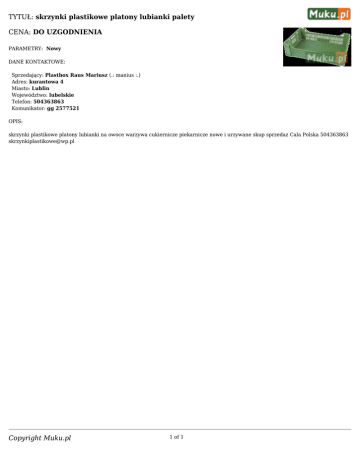 TYTUŁ: skrzynki plastikowe platony lubianki palety CENA: DO UZGODNIENIA PARAMETRY: Nowy DANE KONTAKTOWE: Sprzedający: Plastbox Raus Mariusz (.: manius :.) Adres: kurantowa 4 Miasto: Lublin Województwo: lubelskie Telefon: 504363863 Komunikator: gg 2577521 OPIS: skrzynki plastikowe platony lubianki na owoce warzywa cukiernicze piekarnicze nowe i urzywane skup sprzedaz Cala Polska 504363863 [email protected] Copyright Muku.pl 1 of 1