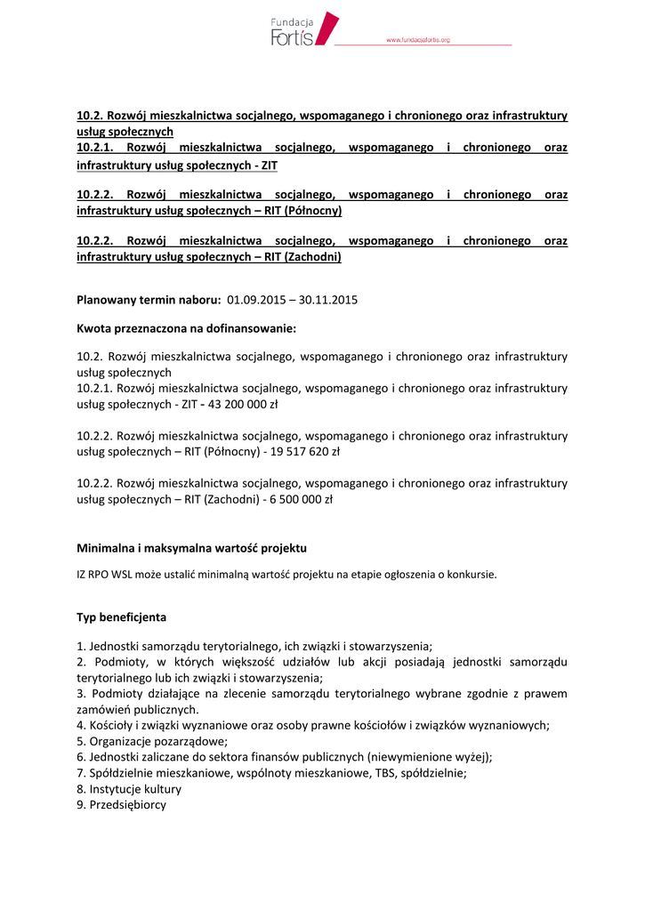 10.2. Rozwój mieszkalnictwa socjalnego, wspomaganego i chronionego oraz infrastruktury usług społecznych 10.2.1. Rozwój mieszkalnictwa socjalnego, wspomaganego i chronionego oraz infrastruktury usług społecznych - ZIT 10.2.2. Rozwój mieszkalnictwa socjalnego, wspomaganego infrastruktury usług społecznych – RIT (Północny) i chronionego oraz 10.2.2. Rozwój mieszkalnictwa socjalnego, wspomaganego infrastruktury usług społecznych – RIT (Zachodni) i chronionego oraz Planowany termin naboru: 01.09.2015 – 30.11.2015 Kwota przeznaczona na dofinansowanie: 10.2. Rozwój mieszkalnictwa socjalnego, wspomaganego i chronionego oraz infrastruktury usług społecznych 10.2.1. Rozwój mieszkalnictwa socjalnego, wspomaganego i chronionego oraz infrastruktury usług społecznych - ZIT - 43 200 000 zł 10.2.2. Rozwój mieszkalnictwa socjalnego, wspomaganego i chronionego oraz infrastruktury usług społecznych – RIT (Północny) - 19 517 620 zł 10.2.2. Rozwój mieszkalnictwa socjalnego, wspomaganego i chronionego oraz infrastruktury usług społecznych – RIT (Zachodni) - 6 500 000 zł Minimalna i maksymalna wartość projektu IZ RPO WSL może ustalić minimalną wartość projektu na etapie ogłoszenia o konkursie. Typ beneficjenta 1. Jednostki samorządu terytorialnego, ich związki i stowarzyszenia; 2. Podmioty, w których większość udziałów lub akcji posiadają jednostki samorządu terytorialnego lub ich związki i stowarzyszenia; 3. Podmioty działające na zlecenie samorządu terytorialnego wybrane zgodnie z prawem zamówień publicznych. 4. Kościoły i związki wyznaniowe oraz osoby prawne kościołów i związków wyznaniowych; 5. Organizacje pozarządowe; 6. Jednostki zaliczane do sektora finansów publicznych (niewymienione wyżej); 7. Spółdzielnie mieszkaniowe, wspólnoty mieszkaniowe, TBS, spółdzielnie; 8. Instytucje kultury 9. Przedsiębiorcy Opis działania i dodatkowe wyjaśnienia Inwestycje dotyczące mieszkalnictwa socjalnego, wspomaganego i chronionego oraz infrastruktury usług społecznych, muszą być realizowane w oparciu o istniejącą infrastrukturę, w powiązaniu z procesem aktywizacji zawodowej, mającym na celu usamodzielnienie ekonomiczne osób zagrożonych wykluczeniem społecznym. Minimalne wymagania jakie muszą spełniać lokale socjalne przewiduje Ustawa z dnia 21 czerwca 2001 r. o ochronie praw lokatorów, mieszkaniowym zasobie gminy i o zmianie Kodeksu Cywilnego (Dz.U.2014.150 j.t.) oraz Rozporządzenie Ministra Infrastruktury z dnia 29 lipca 2009 r. w sprawie finansowego wsparcia na tworzenie lokali socjalnych, mieszkań chronionych i lokali wchodzących w skład mieszkaniowego zasobu gminy niestanowiących lokali socjalnych. Dla mieszkań chronionych minimalne wymagania opisuje Rozporządzenie Ministra Pracy I Polityki Społecznej z dnia 14 marca 2012 r. w sprawie mieszkań chronionych (Dz.U.2012.305). Finansowe wsparcie ze środków EFRR nie przysługuje na przedsięwzięcia, których realizacja współfinansowana jest ze środków Funduszu Dopłat w oparciu o ustawę z dnia 8 grudnia 2006 r. ofinansowym wsparciu tworzenia lokali socjalnych, mieszkań chronionych, noclegowni i domów dla bezdomnych (Dz.U. z dnia 29 grudnia 2006 r.). W ramach działania 10.2 dopuszcza się realizację inwestycji polegających na łączeniu dwóch typów projektów. Roboty budowlane w zdegradowanych budynkach w celu adaptacji ich na mieszkania socjalne, wspomagane i chronione jest możliwa również w przypadku pojedynczych lokali. W działaniu 10.2 jest możliwość wyposażenia centrum usług społecznościowych oraz mieszkań socjalnych, wspomaganych i chronionych. Realizacja projektów w ramach ww. typów projektów jest uzależniona od realizacji projektu z zakresu usług społecznych, finansowanych w ramach EFS, a dotyczących określonej grupy społecznej, dotkniętej dysfunkcją lub wykluczeniem. Wsparcie inwestycyjne projektów z EFRR ma charakter uzupełniający (dodatkowy) i możliwe jest wyłącznie w powiązaniu z działaniami realizowanymi z EFS, które pełnią rolę wiodącą względem EFRR. Tak więc projekty muszą wykazywać charakter przedsięwzięć kompleksowych, koordynujących interwencję infrastrukturalną z wsparciem realizowanym w ramach EFS. W ramach działania 10.2 nie ma możliwości budowy nowych obiektów. W ramach obszarów strategicznej interwencji (OSI), wsparciem zostanie objęte miasto Bytom z uwagi na koncentrację negatywnych zjawisk społeczno-gospodarczych. Wymienione typy beneficjentów mogą realizować przedsięwzięcia w ramach projektów partnerskich w rozumieniu art. 33 ustawy z dnia 11 lipca 2014 r. o zasadach realizacji programów w zakresie polityki spójności finansowanych w perspektywie finansowej 2014– 2020, jak również w ramach projektów hybrydowych w rozumieniu art. 34 ww. ustawy. Działanie 10.2. Rozwój mieszkalnictwa socjalnego, wspomaganego i chronionego oraz infrastruktury usług społecznych A. Wydatki kwalifikowalne: Dla działania 10.2 Rozwój mieszkalnictwa socjalnego, wspomaganego i chronionego oraz infrastruktury usług społecznych za kwalifikowalne uznaje się wszystkie wydatki niezbędne do realizacji projektu, zgodne z zasadami określonymi w części ogólnej wytycznych programowych, jak również wydatki szczegółowe wymienione poniżej w ramach następujących kategorii: Wydatki związane z przygotowaniem projektu, m.in.: ekspertyzy budowlane, analizy techniczne wymagane przepisami prawa, projekt budowlany, projekt wykonawczy, dokumentacja aplikacyjna, przetargowa i geodezyjna (np. studium wykonalności / biznes plan lub ich elementy, program funkcjonalno-użytkowy, kosztorys inwestorski), raport oddziaływania na środowisko oraz niezbędne decyzje administracyjne, opłaty związane z uzyskaniem decyzji administracyjnych, wydatki poniesione na instrumenty zabezpieczające realizację umowy o dofinansowanie, mapy lub szkice sytuujące projekt, opracowania dotyczące analizy 