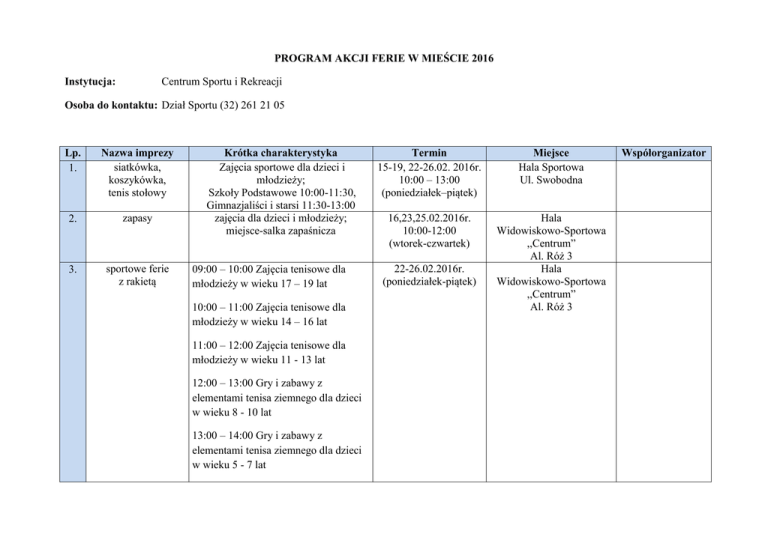 PROGRAM AKCJI FERIE W MIEŚCIE 2016 Instytucja: Centrum Sportu i Rekreacji Osoba do kontaktu: Dział Sportu (32) 261 21 05 Lp. 1. Nazwa imprezy siatkówka, koszykówka, tenis stołowy 2. zapasy 3. sportowe ferie z rakietą Krótka charakterystyka Zajęcia sportowe dla dzieci i młodzieży; Szkoły Podstawowe 10:00-11:30, Gimnazjaliści i starsi 11:30-13:00 zajęcia dla dzieci i młodzieży; miejsce-salka zapaśnicza 09:00 – 10:00 Zajęcia tenisowe dla młodzieży w wieku 17 – 19 lat 10:00 – 11:00 Zajęcia tenisowe dla młodzieży w wieku 14 – 16 lat 11:00 – 12:00 Zajęcia tenisowe dla młodzieży w wieku 11 - 13 lat 12:00 – 13:00 Gry i zabawy z elementami tenisa ziemnego dla dzieci w wieku 8 - 10 lat 13:00 – 14:00 Gry i zabawy z elementami tenisa ziemnego dla dzieci w wieku 5 - 7 lat Termin 15-19, 22-26.02. 2016r. 10:00 – 13:00 (poniedziałek–piątek) Miejsce Hala Sportowa Ul. Swobodna 16,23,25.02.2016r. 10:00-12:00 (wtorek-czwartek) Hala Widowiskowo-Sportowa ,,Centrum” Al. Róż 3 Hala Widowiskowo-Sportowa ,,Centrum” Al. Róż 3 22-26.02.2016r. (poniedziałek-piątek) Współorganizator 4. zimowa akademia badmintona zajęcia dla dzieci i młodzieży 5. wypożyczalnia nart biegowych 6. szkółka bokserska Bezpłatne wypożyczenie sprzętu narciarstwa biegowego dla uczniów Dąbrowskich Szkół, posiadacze kart Dąbrowska Rodzinka.pl 25 % zniżki, Dąbrowska Rodzinka.pl Plus 50% zniżki (wypożyczalnia czynna w zależności od warunków atmosferycznych) Zajęcia ogólnorozwojowe dla dzieci i młodzieży 7. kulig wraz z ogniskiem Zajęcia dla grup zorganizowanych, po wcześniejszej telefonicznej rezerwacji terminu. (oferta uzależniona od warunków atmosferycznych) 15-19.02.2016r. Godz. 9:00 do 13:00 (poniedziałek-piątek) 15-26.02.2016r. (przez całe ferie w godz. 10:00-14:00) Szkoła Podstawowa nr 31 Al. Zwycięstwa ( Ząbkowice ) Centrum Sportów Letnich i Wodnych Pogoria przy zbiorniku Pogoria 3 15-19.22-26.02.2016r. (poniedziałek–piątek) 9:00-11:00 Hala Sportowa ul. Swobodna 46 15-19.22-26.02.2016r. (poniedziałek–piątek) godz. 10:00-14:00) Baza BiwakowoCampingowa-Rekreacyjna „Eurocamping” Błędów ul. Żołnierska tel. (032) 260 02 08 Dąbrowski Klub Bokserski