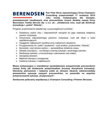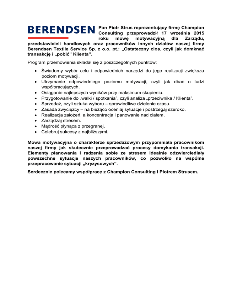 Pan Piotr Strus reprezentujący firmę Champion Consulting przeprowadził 17 września 2015 roku mowę motywacyjną dla Zarządu, przedstawicieli handlowych oraz pracowników innych działów naszej firmy Berendsen Textile Service Sp. z o.o. pt.: „Ostateczny cios, czyli jak domknąć transakcję i „pobić” Klienta”. Program przemówienia składał się z poszczególnych punktów: Świadomy wybór celu i odpowiednich narzędzi do jego realizacji zwiększa poziom motywacji. Utrzymanie odpowiedniego poziomu motywacji, czyli jak dbać o ludzi współpracujących. Osiąganie najlepszych wyników przy maksimum skupieniu. Przygotowanie do „walki / spotkania”, czyli analiza „przeciwnika / Klienta”. Sprzedaż, czyli sztuka wyboru – sprawiedliwe dzielenie czasu. Zasada zwycięzcy – na bieżąco oceniaj sytuacje i postrzegaj szeroko. Realizacja założeń, a koncentracja i panowanie nad ciałem. Zarządzaj stresem. Mądrość płynąca z przegranej. Celebruj sukcesy z najbliższymi. Mowa motywacyjna o charakterze sprzedażowym przypomniała pracownikom naszej firmy jak skutecznie przeprowadzać procesy domykania transakcji. Elementy planowania i radzenia sobie ze stresem idealnie odzwierciedlały powszechne sytuacje naszych pracowników, co pozwoliło na wspólne przepracowanie sytuacji „kryzysowych”. Serdecznie polecamy współpracę z Champion Consulting i Piotrem Strusem.