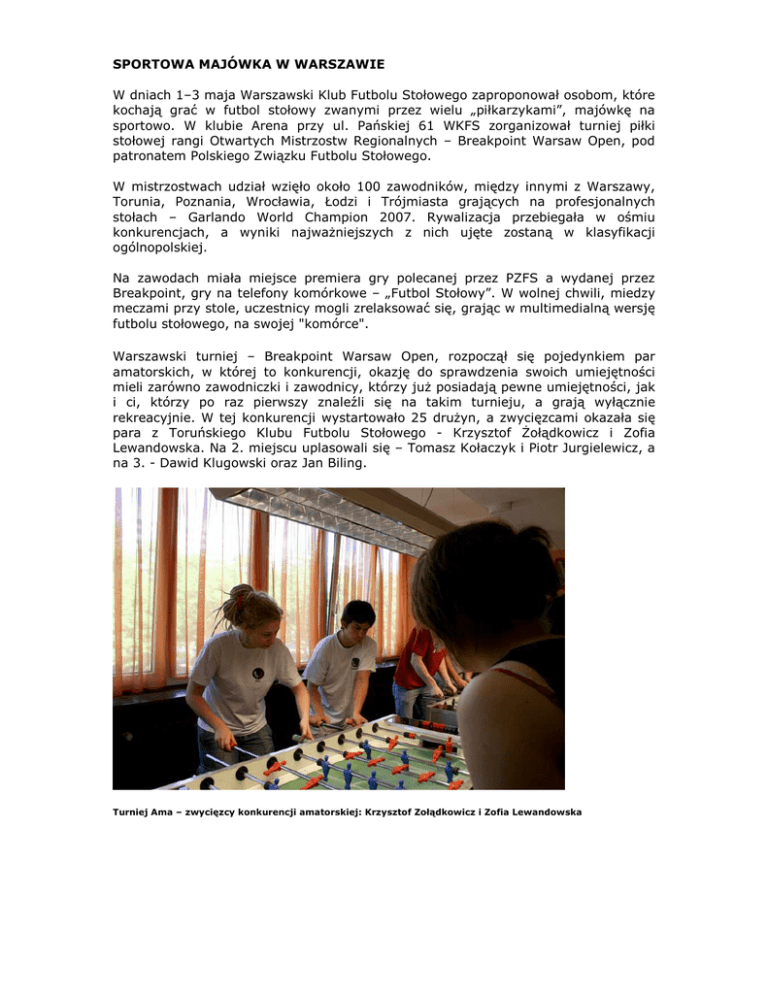 SPORTOWA MAJÓWKA W WARSZAWIE W dniach 1–3 maja Warszawski Klub Futbolu Stołowego zaproponował osobom, które kochają grać w futbol stołowy zwanymi przez wielu „piłkarzykami”, majówkę na sportowo. W klubie Arena przy ul. Pańskiej 61 WKFS zorganizował turniej piłki stołowej rangi Otwartych Mistrzostw Regionalnych – Breakpoint Warsaw Open, pod patronatem Polskiego Związku Futbolu Stołowego. W mistrzostwach udział wzięło około 100 zawodników, między innymi z Warszawy, Torunia, Poznania, Wrocławia, Łodzi i Trójmiasta grających na profesjonalnych stołach – Garlando World Champion 2007. Rywalizacja przebiegała w ośmiu konkurencjach, a wyniki najwaŜniejszych z nich ujęte zostaną w klasyfikacji ogólnopolskiej. Na zawodach miała miejsce premiera gry polecanej przez PZFS a wydanej przez Breakpoint, gry na telefony komórkowe – „Futbol Stołowy”. W wolnej chwili, miedzy meczami przy stole, uczestnicy mogli zrelaksować się, grając w multimedialną wersję futbolu stołowego, na swojej "komórce". Warszawski turniej – Breakpoint Warsaw Open, rozpoczął się pojedynkiem par amatorskich, w której to konkurencji, okazję do sprawdzenia swoich umiejętności mieli zarówno zawodniczki i zawodnicy, którzy juŜ posiadają pewne umiejętności, jak i ci, którzy po raz pierwszy znaleźli się na takim turnieju, a grają wyłącznie rekreacyjnie. W tej konkurencji wystartowało 25 druŜyn, a zwycięzcami okazała się para z Toruńskiego Klubu Futbolu Stołowego - Krzysztof śołądkowicz i Zofia Lewandowska. Na 2. miejscu uplasowali się – Tomasz Kołaczyk i Piotr Jurgielewicz, a na 3. - Dawid Klugowski oraz Jan Biling. Turniej Ama – zwycięzcy konkurencji amatorskiej: Krzysztof Zołądkowicz i Zofia Lewandowska Kolejnym punktem piątkowych rozgrywek była konkurencja DYP (Draw Your Partner), czyli turniej par losowanych. Specyfiką tej konkurencji, jest to, Ŝe grana jest ona w parach, ale to organizator losuje partnera do wspólnej gry. Do zawodów przystąpiło 86 zawodników, którzy zostali losowo dobrani w 43 pary. W tej konkurencji najlepsi okazali się Jakub Ziencikiewicz wraz z Robertem Koteckim, 2. miejsce zajęli Paweł Jóźwiak i Marcin Snopkowski, a 3. Przemysław Noga z Wrocławia wraz z warszawską zawodniczką Zuzanną Filon. Turniej DYP – mecz: Zuzanna Filon i Przemysław Noga (po lewej) kontra Tomasz PoboŜy i Przemysław Bętkowski (po prawej) W piątkowy wieczór rozpoczęła się jedna z najwaŜniejszych konkurencji futbolu stołowego – Single Open, które były kontynuowane w sobotnie południe, a udział wzięło 57 zawodników. Najciekawsze rozgrywki przebiegały między Pawłem Sielskim z Wrocławia pięciokrotnym Mistrzem Polski w konkurencji Single Open, a Jakubem Ziencikiewiczem z Łodzi – zdobywcy 3. miejsca na Mistrzostwach Polski 2008 w tej konkurencji. Pojedynki tych dwóch utytułowanych zawodników, mających na swoim koncie sukcesy w najwaŜniejszych imprezach międzynarodowych i ogólnopolskich tradycyjnie gromadzi sporą grupę kibiców. Emocji nie zabrakło równieŜ tym razem. W Singlach Open triumfował na pierwszym miejscu Jakub Ziencikiewicz, wygrywając z Sielskim po bardzo emocjonującej i wyczerpującej walce w finale, a na 3. miejscu uplasował się równie utytułowany zawodnik – Marcin Snopkowski z Torunia. Finał Singli Open – Paweł Sielski (po lewej) i Jakub Ziencikiewicz (po prawej). Mecz sędziuje – Łukasz Polak, Sędzia Główny turnieju Sobota to dzień, w którym rozgrywany był turniej mikstowy, a więc par mieszanych. W potyczkach miedzy parami damsko-męskimi najlepiej zaprezentowała się para z Łodzi, mistrzowie Polski 2008 - Jakub Ziencikiewicz i Magdalena Sobczyk, na drugim miejscu była poznańsko-toruńska para - Agata Ćwiąkała i Jacek Raczkier, a na 3 miejscu podium znaleźli się Joanna Boczkowska z Warszawy wraz z Marcinem Snopkowskim. Finał Par Mixtowych: Agata Cwiąkała i Jacek Raczkier (po lewej) przeciwko Jakub Ziencikiewicz i Magdalena Sobczyk (po prawej) Futbol stołowy to sport równieŜ dla kobiet, dlatego rozgrywane są takŜe konkurencje wyłącznie dla pań, tj. Single i Pary Kobiece. Jednym z punktów programu sobotniego turnieju były właśnie Pary Kobiece. Do tej konkurencji przystąpiły 22 zawodniczki, a najlepsze okazały się Wicemistrzynie Świata 2008 w tej konkurencji - Agata Ćwiąkała i Agnieszka Rutowska z Poznania, 2. miejsce zajęły dziewczyny z Wrocławia Magdalena Cabaj oraz Barbara Kurtyka, a 3. miejsce wywalczyły warszawskie zawodniczki - Zuzanna Filon oraz Barbara Umowska. Konkurencja – Pary Kobiet. Zdobywczynie 2 miejsca w tej konkurencji – Magdalena Cabaj i Barbara Kurtyka Punktem kulminacyjnym sobotniego wieczoru było rozpoczęcie jednej z najwaŜniejszych konkurencji piłki stołowej - Par Open. Do walki o mistrzostwo przystąpiło 38 par. Nie zabrakło zawodników z czołówki rankingu ogólnopolskiego, a kilka par wygrywając z zawodnikami wyŜej rozstawionymi, sprawiło na tych zawodach duŜą niespodziankę. NajwaŜniejsze mecze finałowe w Parach Open rozegrały się w południe, w niedzielę. W tej waŜnej konkurencji triumfował Paweł Sielski grający ze swoim klubowym kolegą – Przemysławem Nogą, którzy wygrali finał z łódzką parą – Jakubem Ziencikiewiczem i Filipem Kubiatowiczem. 3. miejsce na podium zajęła toruńska para - Marcin Snopkowski i Radosław Szczepański. Turniej Par Open, zwycięzcy konkurencji – Paweł Sielski i Przemysław Noga Niedziela to ostatni dzień turnieju Breakpoint Warsaw Open. Ostatnią rozgrywaną konkurencją były Single Kobiet. Najlepszą zawodniczką okazała się Mistrzyni Polski 2008 w tej konkurencji – Agata Ćwiąkała. 2. miejsce wywalczyła Barbara Kurtyka z Wrocławia, a 3. Zuzanna Filon z Warszawy. Trening przed konkurencją Singli Kobiet. ZwycięŜczyni w tej konkurencji – Agata Ćwiąkała Otwarte Mistrzostwa Regionalne – Breakpoint Warsaw Open by