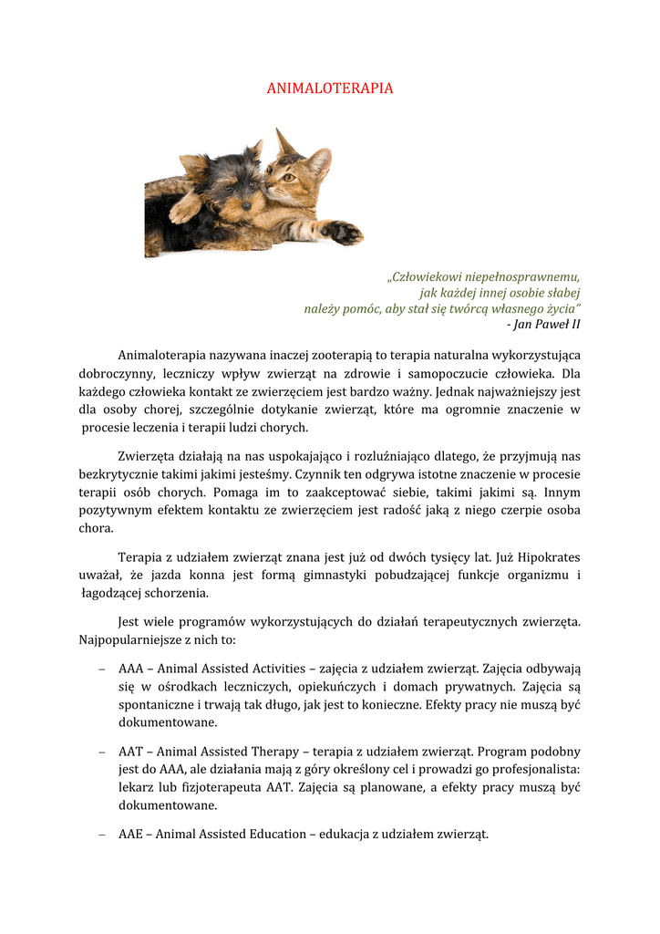 ANIMALOTERAPIA „Człowiekowi niepełnosprawnemu, jak każdej innej osobie słabej należy pomóc, aby stał się twórcą własnego życia” - Jan Paweł II Animaloterapia nazywana inaczej zooterapią to terapia naturalna wykorzystująca dobroczynny, leczniczy wpływ zwierząt na zdrowie i samopoczucie człowieka. Dla każdego człowieka kontakt ze zwierzęciem jest bardzo ważny. Jednak najważniejszy jest dla osoby chorej, szczególnie dotykanie zwierząt, które ma ogromnie znaczenie w procesie leczenia i terapii ludzi chorych. Zwierzęta działają na nas uspokajająco i rozluźniająco dlatego, że przyjmują nas bezkrytycznie takimi jakimi jesteśmy. Czynnik ten odgrywa istotne znaczenie w procesie terapii osób chorych. Pomaga im to zaakceptować siebie, takimi jakimi są. Innym pozytywnym efektem kontaktu ze zwierzęciem jest radość jaką z niego czerpie osoba chora. Terapia z udziałem zwierząt znana jest już od dwóch tysięcy lat. Już Hipokrates uważał, że jazda konna jest formą gimnastyki pobudzającej funkcje organizmu i łagodzącej schorzenia. Jest wiele programów wykorzystujących do działań terapeutycznych zwierzęta. Najpopularniejsze z nich to: AAA – Animal Assisted Activities – zajęcia z udziałem zwierząt. Zajęcia odbywają się w ośrodkach leczniczych, opiekuńczych i domach prywatnych. Zajęcia są spontaniczne i trwają tak długo, jak jest to konieczne. Efekty pracy nie muszą być dokumentowane. AAT – Animal Assisted Therapy – terapia z udziałem zwierząt. Program podobny jest do AAA, ale działania mają z góry określony cel i prowadzi go profesjonalista: lekarz lub fizjoterapeuta AAT. Zajęcia są planowane, a efekty pracy muszą być dokumentowane. AAE – Animal Assisted Education – edukacja z udziałem zwierząt. Najpopularniejsze terapie zwierzęce to: hipoterapia (terapia, z udziałem koni) felinoterapia (terapia z udziałem kotów) dogoterapia (terapia z udziałem psów) delfinoterapia (terapia z udziałem delfinów) alpakoterapia (terapia z udziałem alpak) onoterapia (terapia z mułami i osłami) pet therapy (terapia z udziałem różnych zwierząt, między innymi królików, chomików, świnek morskich, ptaków, gadów i płazów hodowlanych) HIPOTERAPIA „Koń jest Twoim zwierciadłem. On Ci nie pochlebia lecz pokazuje Twój temperament i jego wahania. Nie złość się nigdy na swego konia – przecież równie dobrze mógłbyś złościć się na zwierciadło” – Rudolph Binding Hipoterapia to terapia poprzez kontakt z koniem. Ma ona służyć poprawie funkcjonowania człowieka w sferze fizycznej, emocjonalnej, poznawczej i społecznej. Stosowana jest szczególnie tam, gdzie inne metody nie przynoszą zadowalających rezultatów. Realizowana jest przez: gimnastykę na koniu – przywraca sprawność fizyczną poprzez odpowiednią gimnastykę leczniczą wykonywaną na koniu poruszającym się stępem i kłusem. Jest uzupełnieniem klasycznej fizjoterapii; jazdę konną – podczas jazdy konnej i czynności z nią związanych stosowane są działania edukacyjne, pedagogiczne, elementy psychoterapii, terapii zajęciowej i logopedii; kontakt z koniem – umożliwia pacjentowi poznanie zwierzęcia i nawiązanie z nim kontaktu. Efektem terapeutycznym jest poprawienie komunikacji pacjenta ze światem zewnętrznym. Z hipoterapii mogą korzystać osoby: upośledzone umysłowo; z zaburzeniami rozwoju; z uszkodzeniem wzroku i słuchu; niedostosowane społecznie. Cele działań hipoterapeutycznych: poprawa koordynacji wzrokowo – ruchowej; poprawa orientacji przestrzennej; rozeznanie w schemacie własnego ciała; zwiększenie możliwości koncentracji uwagi i utrzymywania zorganizowanej aktywności; zwiększanie motywacji do wykonywania ćwiczeń; rozwijanie samodzielności; zmniejszanie zaburzeń równowagi; poprawa reakcji obronnych; zwiększanie możliwości lokomocyjnych; relaksacja i osłabienie reakcji nerwicowych; zapewnienie kontaktu ze zwierzęciem i przyrodą. FELINOTERAPIA „Zdobyć przyjaźń kota nie jest rzeczą łatwą. Nie lokuje on swych uczuć nierozważnie: może zostać Waszym przyjacielem, jeśli jesteście tego godni, ale nigdy Waszym niewolnikiem” - Théophile Gautier Felinoterapia nazywana jest inaczej terapią - leczeniem kotem. Kontakt z kotem działa uspokajająco, zmniejsza stres, obniża ciśnienie. Koty mogą także pomóc w uśmierzaniu bólu. Kot, którego naturalna temperatura wynosi ok. 38 stopni, działa podczas głaskania jak grzałka. W świat dziecka chorego na autyzm, czy zespół Aspergera człowiekowi jest bardzo trudno wniknąć. Dziecko nawiązuje z nim kontakt, co powoduje uspokojenie się i otwarcie. Tak samo jest w przypadku dzieci chorych na ADHD, zespół Downa, zaburzenie zachowania i emocji, zaburzenie lękowe, depresję, uszkodzenie słuchu czy wzroku, upośledzonych umysłowo lub osób chorych psychicznie. Zajęcia felinoterapii gdy odbywają się w sposób regularny przynoszą wiele pozytywnych efektów zarówno pedagogicznych, jak i terapeutycznych. DOGOTERAPIA (KYNOTERAPIA) "Jedynym całkowicie bezinteresownym przyjacielem, którego można mieć na tym interesownym świecie, takim, który nigdy go nie opuści, nigdy nie okaże się niewdzięcznym lub zdradzieckim, jest pies… Pocałuje rękę, która nie będzie mogła mu dać jeść, wyliże rany odniesione w starciu z brutalnością świata… Kiedy wszyscy inni przyjaciele odejdą, on pozostanie" – George G. Vest Ogólnopolski Dzień Dogoterapii obchodzony jest 15 czerwca. Dogoterapia to zespół działań, które mają na celu terapeutyczne oddziaływanie na człowieka poprzez kontakt z psem. Terapia z wykorzystaniem psów pomaga przede wszystkim dzieciom z: autyzmem zespołem Aspergera mózgowym porażeniem dziecięcym ADHD zespołem zaburzeń uwagi (ADD) zespołem nadpobudliwości (HDK). Dogoterapia polega przede wszystkim na nawiązaniu więzi psychicznej ze zwierzęciem, co przyspiesza leczenie i ma korzys