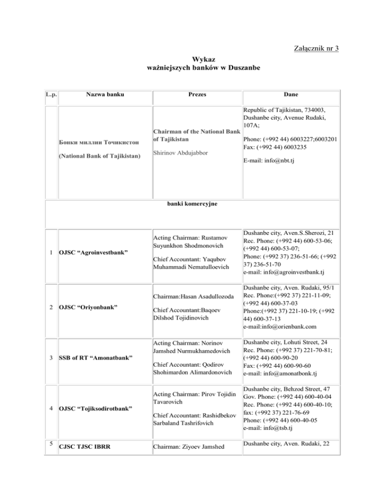 Załącznik nr 3 Wykaz ważniejszych banków w Duszanbe