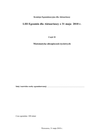 Komisja Egzaminacyjna dla Aktuariuszy LIII Egzamin dla Aktuariuszy z 31 maja 2010 r. Część II Matematyka ubezpieczeń życiowych Imię i nazwisko osoby egzaminowanej: .......................................................................... Czas egzaminu: 100 minut Warszawa, 31 maja 2010 r. Matematyka ubezpieczeń życiowych 31 maja 2010 r. ___________________________________________________________________________ 1. Niech oznacza dalsze trwanie życia (x) oraz . Niech dalej . Dane są część całkowitą , Obliczyć niech oznacza , . . Wybierz odpowiedź najbliższą. A) (B) (C) (D) (E) 1 Matematyka ubezpieczeń życiowych 31 maja 2010 r. ___________________________________________________________________________ 2. Rozważamy ubezpieczenie spłaty kredytu hipotecznego – letniego wysokości zł , który zaciągnął (25) wylosowany z populacji de Moivre’a z wiekiem granicznym Intensywność oprocentowania kredytu wynosi w skali roku. Kredyt jest spłacany w postaci renty ciągłej z odpowiednio dobraną stałą intensywnością. W przypadku śmierci kredytobiorcy w ciągu najbliższych lat ubezpieczyciel spłaci natychmiast kredytodawcy niespłaconą część kredytu. za to ubezpieczenie. Techniczna Obliczyć składkę jednorazową netto intensywność oprocentowania wynosi Wybierz odpowiedź najbliższą. (A) (E) (B) (C) (D) 2 Matematyka ubezpieczeń życiowych 31 maja 2010 r. ___________________________________________________________________________ 3. Osoba urodzona 1 lipca zawarła 1 października, w wieku ( x + 1 ) lat 4 ubezpieczenie rentowe na 3 wypłaty po 10 000 zł płatne w kolejne 3 daty 1 stycznia. Podaj jednorazową składkę netto za to ubezpieczenie, jeśli v = 0,95 q x = q x+1 = 0,12 q x + 2 = 0,16 oraz śmiertelność w ciągu każdego roku życia ma rozkład zgodny z hipotezą Balducciego. Wskaż najbliższą wartość. (A) 24 062 (B) 24 083 (C) 24 104 (D) 24 125 (E) 24 146 3 Matematyka ubezpieczeń życiowych 31 maja 2010 r. ___________________________________________________________________________ 4. Rozważamy ubezpieczenie bezterminowe na życie dla (25), które jest opłacane za pomocą renty życiowej corocznych składek w wysokości netto . Na koniec roku śmierci ubezpieczonego będzie wypłacona suma ubezpieczenia zł. Korzystając z założenia UDD obliczyć rezerwę składek netto Dane są (A) (E) (B) (C) (D) 4 Matematyka ubezpieczeń życiowych 31 maja 2010 r. ___________________________________________________________________________ 5. Rozpatrujemy dyskretny typ n-letniego ubezpieczenia na życie i dożycie z sumą ubezpieczenia 1000 zł i składką płatną przez n lat ubezpieczenia. Po k latach ubezpieczenia ubezpieczony zaprzestał płacenia składek i może wybrać jeden z dwóch, aktuarialnie równoważnych, sposobów konwersji swej polisy: · bezterminowe ubezpieczenie na życie z sumą ubezpieczenia 1900 zł, · terminowe, (n-k)-letnie ubezpieczenie na życie i dożycie ze świadczeniem śmiertelnym S oraz sumą ubezpieczenia za dożycie 1000 zł. Wyznacz sumę ubezpieczenia za śmierć S. Dane są: Ax + k : n- k | A1x + k : n- k | = 0,3 . = 1,6 Ax + k n -k E x + k Wskaż najbliższą wartość. (A) (E) 1791 1875 (B) 1812 (C) 1833 (D) 1854 5 Matematyka ubezpieczeń życiowych 31 maja 2010 r. ___________________________________________________________________________ 6. (25) płaci regularne coroczne składki w wysokości aż do osiągnięcia wieku Od tego momentu zacznie otrzymywać emeryturę dożywotnią w wysokości na rok. Dane są: oraz Oblicz . Wybierz odpowiedź najbliższą. (A) (E) 0,07 0,11 (B) 0,08 (C) 0,09 (D) 0,10 6 Matematyka ubezpieczeń życiowych 31 maja 2010 r. ___________________________________________________________________________ 7. Rozważamy 20-letnie ubezpieczenie na życie i dożycie ciągłego typu z sumą ubezpieczenia 10 000 zł i ze składką płaconą przez cały okres ubezpieczenia ze stałą intensywnością. Jednorazowe koszty wystawienia polisy wynoszą 3 % sumy ubezpieczenia i są rezerwowane metodą Zillmera. Roczna intensywność kosztów administracyjnych rośnie równomiernie od 10% sumy ubezpieczenia w momencie wystawienia polisy do 20% w momencie wygaśnięcia polisy z powodu dożycia. Wyznacz różnicę między rezerwą brutto a rezerwą netto po 10 latach ubezpieczenia, jeśli populacja ubezpieczonych ma wykładniczy rozkład czasu trwania życia z parametrem m = 0,04 oraz d = 0,06 . Wskaż najbliższą wartość. (A) (E) 1930 2090 (B) 1970 (C) 2010 (D) 2050 7 Matematyka ubezpieczeń życiowych 31 maja 2010 r. ___________________________________________________________________________ 8. W modelu szkodowości dwojakiej dane są funkcje intensywności poszczególnych szkód: , Wiadomo ponadto, że Oblicz (A ) . (B) (C) (D) (E) 8 Matematyka ubezpieczeń życiowych 31 maja 2010 r. ___________________________________________________________________________ 9. Rozpatrujemy ciągły typ ubezpieczenia dla (x=65) oraz (y=60), które w pierwszych 5 latach ubezpieczenia wypłaca jednorazowo 10 000 w chwili śmierci (x), jeśli (y) żyje, a następnie (niezależnie od daty śmierci (x)) 5 lat po śmierci (x), jeśli (y) nadal żyje, zaczyna wypłacać (y) dożywotnią rentę z intensywnością 10 000 na rok. Podaj jednorazową składkę netto za to ubezpieczenie, jeśli obydwa życia (x) i (y) są niezależne, mają wykładniczy rozkład czasu trwania życia m x = 0,03 , m y = 0,02 oraz d = 0,05 . Wskaż najbliższą wartość. (A) (E) 26 050 32 620 (B) 27 480 (C) 29 840 (D) 31 380 9 Matematyka ubezpieczeń życiowych 31 maja 2010 r. ___________________________________________________________________________ 10. Rozpatrujemy kohortę uczestników planu emerytalnego w wieku 45 lat. Plan dopuszcza przejście na emeryturę w wieku między 55 a 65 lat. 40 - t (t ) Prawdopodobieństwo utrzymania aktywnego statusu opisuje t p 45 = dla 40 1 (r ) dla 10 £ t < 20 . 0 £ t < 20 , a intensywność przejścia na