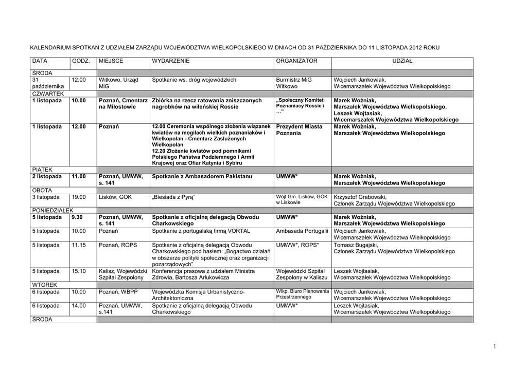 KALENDARIUM SPOTKAŃ Z UDZIAŁEM ZARZĄDU WOJEWÓDZTWA WIELKOPOLSKIEGO W DNIACH OD 31 PAŹDZIERNIKA DO 11 LISTOPADA 2012 ROKU DATA GODZ. MIEJSCE WYDARZENIE ORGANIZATOR 12.00 Witkowo, Urząd MiG Spotkanie ws. dróg wojewódzkich Burmistrz MiG Witkowo Wojciech Jankowiak, Wicemarszałek Województwa Wielkopolskiego 10.00 Poznań, Cmentarz Zbiórka na rzecz ratowania zniszczonych na Miłostowie nagrobków na wileńskiej Rossie „Społeczny Komitet Poznaniacy Rossie i …” 1 listopada 12.00 Poznań 12.00 Ceremonia wspólnego złoŜenia wiązanek kwiatów na mogiłach wielkich poznaniaków i Wielkopolan - Cmentarz ZasłuŜonych Wielkopolan 12.20 ZłoŜenie kwiatów pod pomnikami Polskiego Państwa Podziemnego i Armii Krajowej oraz Ofiar Katynia i Sybiru Prezydent Miasta Poznania Marek Woźniak, Marszałek Województwa Wielkopolskiego, Leszek Wojtasiak, Wicemarszałek Województwa Wielkopolskiego Marek Woźniak, Marszałek Województwa Wielkopolskiego PIĄTEK 2 listopada 11.00 Poznań, UMWW, s. 141 Spotkanie z Ambasadorem Pakistanu UMWW* Marek Woźniak, Marszałek Województwa Wielkopolskiego OBOTA 3 listopada 19.00 Lisków, GOK „Biesiada z Pyrą” Wójt Gm. Lisków, GOK w Liskowie Krzysztof Grabowski, Członek Zarządu Województwa Wielkopolskiego Spotkanie z oficjalną delegacją Obwodu Charkowskiego Spotkanie z portugalską firmą VORTAL UMWW* ŚRODA 31 października CZWARTEK 1 listopada PONIEDZIAŁEK 5 listopada 9.30 5 listopada 10.00 Poznań, UMWW, s. 141 Poznań 5 listopada 11.15 Poznań, ROPS 5 listopada 15.10 WTOREK 6 listopada 10.00 Poznań, WBPP 6 listopada 14.00 Poznań, UMWW, s.141 Spotkanie z oficjalną delegacją Obwodu Charkowskiego pod hasłem: „Bogactwo działań w obszarze polityki społecznej oraz organizacji pozarządowych” Kalisz, Wojewódzki Konferencja prasowa z udziałem Ministra Szpital Zespolony Zdrowia, Bartosza Arłukowicza Wojewódzka Komisja UrbanistycznoArchitektoniczna Spotkanie z oficjalną delegacją Obwodu Charkowskiego UDZIAŁ Marek Woźniak, Marszałek Województwa Wielkopolskiego Ambasada Portugalii Wojciech Jankowiak, Wicemarszałek Województwa Wielkopolskiego UMWW*, ROPS* Tomasz Bugajski, Członek Zarządu Województwa Wielkopolskiego Wojewódzki Szpital Zespolony w Kaliszu Leszek Wojtasiak, Wicemarszałek Województwa Wielkopolskiego Wlkp. Biuro Planowania Wojciech Jankowiak, Przestrzennego Wicemarszałek Województwa Wielkopolskiego UMWW* Leszek Wojtasiak, Wicemarszałek Województwa Wielkopolskiego ŚRODA 1 7 listopada 12.00 Warszawa, Sejm RP Spotkanie z Przewodniczącą Komisji ds. Europejskich CZWARTEK 8 listopada 10.00 Poznań, siedziba Konferencja pn. „Problematyka bezpieczeństwa, ergonomii oraz ekologii w uŜytkowaniu maszyn i ciągników rolniczych” Wyjazdowe posiedzenie Rady Parków Krajobrazowych Województwa Wielkopolskiego Inst. Maszyn Rolniczych 8 listopada 10.00 Chalin, Ośrodek Edukacji Przyrodniczej 8 listopada 13.00 8-9 listopada Piotrowo, Zespół Szkół Sofia, Bułgaria PIĄTEK 9 listopada 10.00 Poznań, WUP 9 listopada 19.00 Poznań, Aula UAM SOBOTA 10 listopada 16.00 Piła, Teatr Miejski 10 listopada 17.00 Poznań, Poznańska 18.00 Poznań, Teatr Wielki Przemysłowy Instytut Maszyn Rolniczych w Poznaniu Zespół Parków Krajobrazowych Woj. Wielkopolskiego Otwarcie kompleksu sportowego „Moje boisko – Wójt i Przewodniczący Rady Gminy Blizanów Orlik 2012” Roczne seminarium EPP poświęcone wymiarowi miejskiemu Polityki Spójności EPP* XIV Posiedzenie Regionalnej Sieci Tematycznej Koncert z okazji 65-lecia Filharmonii Poznańskiej WUP* Spotkanie z okazji 95-lecia działalności Chóru Mieszanego „Halka” w Pile Koncert „Dwie Kultury – jeden świat” Dyr. Regionalnego Centrum Kultury w Pile Ogólnokształcąca Szkoła Muzyczna II St., ul. Solna 12 NIEDZIELA 11 listopada Marek Woźniak, Marszałek Województwa Wielkopolskiego Filharmonia Poznańska Krzysztof Grabowski, Członek Zarządu Województwa Wielkopolskiego Tomasz Bugajski, Członek Zarządu Województwa Wielkopolskiego Krzysztof Grabowski, Członek Zarządu Województwa Wielkopolskiego Marek Woźniak, Marszałek Województwa Wielkopolskiego Wojciech Jankowiak, Wicemarszałek Województwa Wielkopolskiego Marek Woźniak, Marszałek Województwa Wielkopolskiego, Wojciech Jankowiak, Wicemarszałek Województwa Wielkopolskiego, Tomasz Bugajski, Członek Zarządu Województwa Wielkopolskiego Tomasz Bugajski, Członek Zarządu Województwa Wielkopolskiego Lions Club Poznań Wojciech Jankowiak, Novus Mixed, Fundacja Wicemarszałek Województwa Wielkopolskiego Muzyczna Apollo Koncert z okazji Narodowego Święta Niepodległości UMWW* Tomasz Bugajski, Członek Zarządu Województwa Wielkopolskiego UMWW –Urząd Marszałkowski Województwa Wielkopolskiego ROPS – Regionalny Ośrodek Polityki Społecznej EPP – Europejska Partia Ludowa (European People’s Party) WUP – Wojewódzki Urząd Pracy w Poznaniu 2