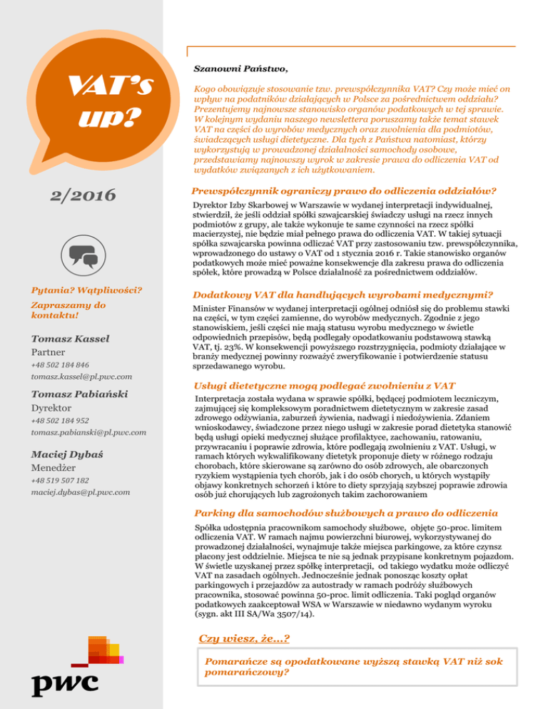 VAT’s up? 2/2016 Pytania? Wątpliwości? Zapraszamy do kontaktu! Tomasz Kassel Partner +48 502 184 846 [email protected] Tomasz Pabiański Dyrektor +48 502 184 952 [email protected] Maciej Dybaś Menedżer +48 519 507 182 [email protected] Szanowni Państwo, Kogo obowiązuje stosowanie tzw. prewspółczynnika VAT? Czy może mieć on wpływ na podatników działających w Polsce za pośrednictwem oddziału? Prezentujemy najnowsze stanowisko organów podatkowych w tej sprawie. W kolejnym wydaniu naszego newslettera poruszamy także temat stawek VAT na części do wyrobów medycznych oraz zwolnienia dla podmiotów, świadczących usługi dietetyczne. Dla tych z Państwa natomiast, którzy wykorzystują w prowadzonej działalności samochody osobowe, przedstawiamy najnowszy wyrok w zakresie prawa do odliczenia VAT od wydatków związanych z ich użytkowaniem. Prewspółczynnik ograniczy prawo do odliczenia oddziałów? Dyrektor Izby Skarbowej w Warszawie w wydanej interpretacji indywidualnej, stwierdził, że jeśli oddział spółki szwajcarskiej świadczy usługi na rzecz innych podmiotów z grupy, ale także wykonuje te same czynności na rzecz spółki macierzystej, nie będzie miał pełnego prawa do odliczenia VAT. W takiej sytuacji spółka szwajcarska powinna odliczać VAT przy zastosowaniu tzw. prewspółczynnika, wprowadzonego do ustawy o VAT od 1 stycznia 2016 r. Takie stanowisko organów podatkowych może mieć poważne konsekwencje dla zakresu prawa do odliczenia spółek, które prowadzą w Polsce działalność za pośrednictwem oddziałów. Dodatkowy VAT dla handlujących wyrobami medycznymi? Minister Finansów w wydanej interpretacji ogólnej odniósł się do problemu stawki na części, w tym części zamienne, do wyrobów medycznych. Zgodnie z jego stanowiskiem, jeśli części nie mają statusu wyrobu medycznego w świetle odpowiednich przepisów, będą podlegały opodatkowaniu podstawową stawką VAT, tj. 23%. W konsekwencji powyższego rozstrzygnięcia, podmioty działające w branży medycznej powinny rozważyć zweryfikowanie i potwierdzenie statusu sprzedawanego wyrobu. Usługi dietetyczne mogą podlegać zwolnieniu z VAT Interpretacja została wydana w sprawie spółki, będącej podmiotem leczniczym, zajmującej się kompleksowym poradnictwem dietetycznym w zakresie zasad zdrowego odżywiania, zaburzeń żywienia, nadwagi i niedożywienia. Zdaniem wnioskodawcy, świadczone przez niego usługi w zakresie porad dietetyka stanowić będą usługi opieki medycznej służące profilaktyce, zachowaniu, ratowaniu, przywracaniu i poprawie zdrowia, które podlegają zwolnieniu z VAT. Usługi, w ramach których wykwalifikowany dietetyk proponuje diety w różnego rodzaju chorobach, które skierowane są zarówno do osób zdrowych, ale obarczonych ryzykiem wystąpienia tych chorób, jak i do osób chorych, u których wystąpiły objawy konkretnych schorzeń i które to diety sprzyjają szybszej poprawie zdrowia osób już chorujących lub zagrożonych takim zachorowaniem Parking dla samochodów służbowych a prawo do odliczenia Spółka udostępnia pracownikom samochody służbowe, objęte 50-proc. limitem odliczenia VAT. W ramach najmu powierzchni biurowej, wykorzystywanej do prowadzonej działalności, wynajmuje także miejsca parkingowe, za które czynsz płacony jest oddzielnie. Miejsca te nie są jednak przypisane konkretnym pojazdom. W świetle uzyskanej przez spółkę interpretacji, od takiego wydatku może odliczyć VAT na zasadach ogólnych. Jednocześnie jednak ponosząc koszty opłat parkingowych i przejazdów za autostrady w ramach podróży służbowych pracownika, stosować powinna 50-proc. limit odliczenia. Taki pogląd organów podatkowych zaakceptował WSA w Warszawie w niedawno wydanym wyroku (sygn. akt III SA/Wa 3507/14). Czy wiesz, że…? Pomarańcze są opodatkowane wyższą stawką VAT niż sok pomarańczowy?