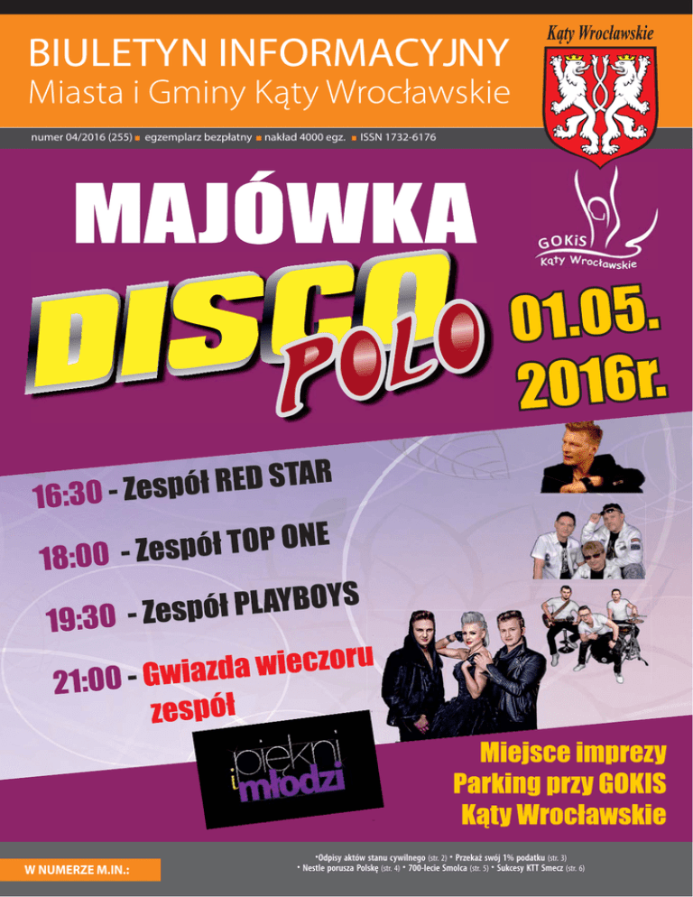 BIULETYN INFORMACYJNY numer 04/2016 (255) W NUMERZE M.IN.: egzemplarz bezpłatny nakład 4000 egz. ISSN 1732-6176 ·Odpisy aktów stanu cywilnego (str. 2) · Przekaż swój 1% podatku (str. 3) · Nestle porusza Polskę (str. 4) · 700-lecie Smolca (str. 5) · Sukcesy KTT Smecz (str. 6) INFORMACJE UMiG Gminna Rada Seniorów Gminna Rada Seniorów w Kątach Wrocławskich została powołana uchwałą nr IX/87/15 Rady Miejskiej w Kątach Wr. z dnia 25.06.2015r. W skład rady weszli: Zarząd Rady: Krystyna Horak – przewodnicząca (z Kątów Wr.), Małgorzata Bacajewska – v-ce przewodnicząca (ze Smolca), Ewa Walerzak - v-ce przewodnicząca (z Kątów Wr.), Zenon Łąk – sekretarz (z Romnowa), Członkowie Rady: Janina Miazek (z Zabrodzia), Marian Gajda (z Kątów Wr.), Zbigniew Walczak (z Kątów Wr.), Ryszard Kundyk (z Kamionnej), Jan Cisło (z Kątów Wr.), Elżbieta Daniel (z Kątów Wr.), Marianna Stachurska (z Gniechowic), Jan Wargocki (z Wojtkowic), Czesław Wyrwa (z Gniechowic) Rada została powołana na 4-letnią kadencję. Głównym zadaniem Rady jest działanie na rzecz osób starszych z terenu miasta i gminy Kąty Wrocławskie. Rada jest ciałem doradczym dla organów gminy, działa w następujących obszarach: profilaktyka i promocja zdrowia osób starszych, niepełnosprawność osób starszych, mieszkalnictwo osób starszych, przeciwdziałanie wykluczeniu społecznemu osób starszych, przełamywanie negatywnych stereotypów dotyczących osób starszych i budowa ich pozytywnego wizerunku w społeczeństwie, dostęp osób starszych do edukacji, kultury i rekreacji, wspieranie aktywności osób starszych, wykorzystanie twórczego potencjału osób starszych, integracja środowisk działających na rzecz osób starszych. Rada dostrzega potrzebę większej integracji środowisk senioralnych oraz zwiększenia wszelkich form aktywności. Lobbuje, aby w Kątach Wrocławskich powstał Dom Dziennego Pobytu Seniora („przedszkole” dla starszego członka rodziny), widzi potrzebę otwarcia Poradni Geriatrycznej, wdrożenia „Pudełka życia” (tj. zbioru ważnych danych telefony do osób najbliższych, informacje o chorobach, uczuleniach, przyjmowanych lekach oraz o tym, kto zajmie się zwierzętami pod nieobecność chorego gospodarza –przydatnych np. dla zespołu karetki pogotowia ratunkowego). Rada dostrzega zainteresowanie powstaniem Uniwersytetu Trzeciego Wieku. Rada liczy na poparcie jej działalności ze strony społeczeństwa i władz gminy. Krystyna Horak Młodzieżowa Rada Miejska W lutym bieżącego roku Młodzieżowa Rada Miejska w Kątach Wrocławskich rozpoczęła swoją działalność uroczystą sesją w Ratuszu. W jej skład wchodzą radni z różnych miejscowości i szkół. Wybory do Młodzieżowej Rady Miejskiej odbyły się w październiku ubiegłego roku w gimnazjach na terenie naszej gminy. Radni z gimnazjum w Jaszkotlu to: Alicja Gryszpińska, Aleksander Klajber, Kajetan Kowalski, Julia Łukaszewicz i Michał Sycz. Radni z gimnazjum w Kątach: Patryk Bubula, Joanna Drab, Wiktoria Rydzicka, Jakub Sawicki, Katarzyna Trzaska. Ostatnie pięć osób to młodzież ze szkół ponadgimnazjalnych: Julia Cichecka, Kamila Dąbrowska, Dominika Karbowska, Marcelina Okapiec i Barbara Tyszka. Podczas pierwszej sesji 29 lutego 2016r. wybrano przewodniczącą: Joannę Drab, wiceprzewodniczącą: Marcelinę Okapiec i sekretarza: Jakuba Sawickiego. 31 marca 2016r. odbyła się kolejna ważna sesja, w której brały udział wszystkie organy samorządowe naszej gminy tzn. Rada Miejska, Młodzieżowa Rada Miejska i Rada Seniorów. Nawiązano współpracę i podjęto pierwsze działania. Jako Młodzieżowa Rada Miejska chcielibyśmy pomóc w tworzeniu na terenie naszej gminy infrastruktury, która przyczyni się do wzrostu aktywności młodzieży, dorosłych i osób starszych. Pragniemy zwrócić uwagę na potrzeby mieszkańców w naszym wieku oraz dać im możliwość znalezienia sobie ciekawych zajęć na miejscu, bez konieczności opuszczania gminy. Planujemy, we współpracy ze Stowarzyszeniem Miłośników Ziemi Kąckiej, zorganizować konkurs wśród uczniów gimnazjów. Tematyka będzie obejmować dzieje Kątów Wrocławskich oraz okoliczne obiekty warte poznania. Oprócz działalności na rzecz młodzieży planujemy wspierać Radę Seniorów i udzielać się charytatywnie. Pracujemy dopiero od dwóch miesięcy, ale mamy nadzieję, że z czasem efekty naszych działań zaczną być widoczne. Joanna Drab Urząd Miasta i Gminy Kąty Wrocławskie Rynek-Ratusz 1, 55-080 Kąty Wrocławskie, tel.: +48 71 390 72 00, +48 71 390 72 06, fax: +48 71 390 72 01, e-mail: [email protected] Godziny pracy urzędu: Pn., Wt., Czw.: 7.30-15.30 · Śr.: 7.30-16.00 · Pt.: 7.30-15.00 2 ODPIS AKTU STANU CYWILNEGO - zasady wydawania Od dnia 1 marca 2015 roku obowiązuje nowa ustawa z dnia 28 listopada 2014 roku Prawo o aktach stanu cywilnego (Dz.U. z 2014 r. poz. 1741, z poźn. zm.) wprowadzająca elektroniczny sposób prowadzenia rejestracji stanu cywilnego w Polsce. Urodzenia, małżeństwa i zgony są rejestrowane przez Kierowników Urzędów Stanu Cywilnego w jednym, centralnym Rejestrze Stanu Cywilnego. Rejestr Stanu Cywilnego jest sukcesywnie napełniany aktami stanu cywilnego między innymi poprzez: • bieżącą rejestrację aktów stanu cywilnego (urodzeń, małżeństw i zgonów) • przenoszenia aktów stanu cywilnego sporządzonych dotychczas w księgach stanu cywilnego z urzędu lub na wniosek osoby, w przypadku wydawania odpisów aktów stanu cywilnego, dokonywania zmian w aktach lub dokonywania czynności dla których niezbędny jest wgląd do aktu (np. przygotowanie dokumentów do zawarcia małżeństwa). Odpisy aktów stanu cywilnego można wybrać w dowolnie wybranym Urzędzie Stanu Cywilnego pod warunkiem, że żądany akt urodzenia, małżeństwa lub zgonu został wprowadzony przez Urząd Stanu Cywilnego dotychczasowego miejsca przechowywania do centralnego Rejestr Stanu Cywiln