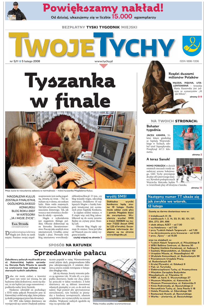 Powiększamy nakład! Od dzisiaj, ukazujemy się w liczbie 15.000 egzemplarzy BEZPŁATNY TYSKI TYGODNIK MIEJSKI www.tychy.pl Tyszanka w finale ISSN 1898-72 1898-7206 Rządzi duszami milionów Polaków Polakó MŁODA, PIĘKNA, UTALENTOWANA – ty tyszanka Marta Kuszewska je jest jedscenarzystó „M nym ze scenarzystów jak Miłość”. strony 8-9 stron NA TWOICH STRONACH: Bohater tygodnia TJ 5 lutego 2008 TOMASZ JODŁOWSKI nr 5/11 JACEK KAMPA, 51letni lekarz ginekolog ze Szpitala Wojewódzkiego w Tychach, zdobył tytuł Superpływaka. Przepłynął 617,5 kilometra. strona 2 TJ A teraz Sanok! MIMO PORAŻEK w dwóch ostatnich meczach rundy zasadniczej sezonu hokejowego, GKS Tychy przystępuje do play off z pierwszego miejsca. Rywalem podopiecznych Wojciecha Matczaka będzie w ćwierćfinale play off drużyna z Sanoka. strona 15 Moje życie to nieustanna zabawa w normalność – mówi tyszanka Magdalena Kulus. MAGDALENA KULUS ZOSTAŁA FINALISTKĄ OGÓLNOPOLSKIEGO KONKURSU BLOG ROKU 2007 W KATEGORII „JA I MOJE ŻYCIE”. Ewa Strzoda [email protected] D wudziestopięcioletnia Magda jest chora na zanik mięśni. Pomimo swojej niepeł- nosprawności jest osobą pogodną, otwartą na świat. – Nie zamykam się w domu, nie unikam ludzi. Mam wielu znajomych. Tak było od zawsze. Nie miałam nauczania domowego. Tak, jak wszyscy moi rówieśnicy chodziłam do szkoły – opowiada. Magda z wykształcenia jest magistrem filologii polskiej. Obecnie doktoryzuje się na kierunku literaturoznawstwo. Pracuje jako analityk stron internetowych. Uwielbia czytać książki i pisać. Prowadzi swój blog internetowy www.blondy- niblondyna.blox.pl. O tym, czy blog tyszanki wygra, zdecydują internauci. Dodatkowo 10 najlepszych blogów z każdej kategorii tematycznej jest ocenianych przez Kapitułę Konkursu. – Ja zajęłam siódme miejsce, w II etapie więc mój blog zakwalifikował się do oceny jurorów. Będzie on czytany przez Monikę Luft. Obecnie blog Magdy zajmuje 16. miejsce. Teraz już tylko od Waszych sms-ów zależy wygrana tyszanki. wyślij SMS! Następny numer TT ukaże się jak zwykle we wtorek, 12 lutego Dokładne wyniki konkursu będą znane 19 lutego. Każdy może oddać swój głos i pomóc Magdzie dojść do zwycięstwa. Wystarczy wysłać SMS o treści A00820 na numer 71222 (koszt SMS to 1,22 zł brutto). Szczegółowe informacje dostępne są na stronie www.blogroku.pl. Gazetę za darmo dostaniesz rano w: æ trolejbusach A i B; æ autobusach: 1, 2, 14, 33, 51, 82, 131, 137, 254, 273, 291, 696 æ obok sklepu AZET – od 7.00 æ na Hotelowcu – od 7.00 æ przy Tyskich Halach Targowych – od 7.00 æ na skrzyżowaniu przy browarze – od 12.00 æ przy „Tęczy” – od 15.00 czytaj więcej na stronie 3 SPOSÓB NA RATUNEK Zabytkowy pałacyk myśliwski przy ul. Katowickiej będzie sprzedany. Decyzja Rady Miasta to sposób na uratowanie tego jednego z najstarszych tyskich zabytków. P ałac nie może czekać, a inwestor musi tam wejść już wiosną, bo jak będziemy dalej dyskutować, może się okazać, że nie będzie już czego remontować – podkreśla radny Jerzy Sienicki. Niedawno odwiedził on pochodzący z XVII wieku pałacyk Promniców przy ul. Katowickiej i zrobił serię zdjęć, które pokazują skutki postępującej przez lata dewastacji. Od 1991 roku kolejni dzierżawcy nie wywiązywali się z umów i budynek systema- tycznie popadał w ruinę. Wyremontowany został jedynie dach, przeprowadzono kilka prac zabezpieczających. Z ostatnim dzierżawcą umowa została rozwiązana w listopadzie ubiegłego roku. Jak się okazuje, koszty remontu pałacu są ogromne (ok. 30 mln zł), a w przypadku dzierżawy, banki nie chcą udzielać pożyczki w takiej wysokości. Z kolei dzierżawcy nie są skłonni inwestować własnych pieniędzy w coś, co do nich nie należy. Stąd pomysł aby sprywatyzować nieruchomość, tym bardziej że pieniędzy z funduszy zewnętrznych, zdaniem urzędników, nie wystarczyłoby na remont obiektu. Większość radnych zgodziła się więc na sprzedaż. LS TOMASZ JODŁOWSKI Sprzedawanie pałacu Pałac trzeba szybko wyremontować. oraz na stojakach w: æ Tyskich Halach Targowych, al. Piłsudskiego 8 æ WBU Balbina Centrum, ul. Barona 30 æ Śląskiej Giełdzie Kwiatowej, ul. Sadowa 3 æ Szpitalu Wojewódzkim, ul. Edukacji 102 æ Urzędzie Miasta, al. Niepodległości 49 æ Wydziale Komunikacji, ul. Budowlanych 59 æ Powiatowym Urzędzie Pracy, ul. Budowlanych 59 æ Krytej Pływalni, ul. Edukacji 9 æ Fiat, ul. Turyńska æ Elektrociepłowni Tychy, ul. Przemysłowa æ Miejskim Zarządzie Budynków Mieszkalnych, ul. Filaretów 31 æ MBP, ul. kard. S. Wyszyńskiego 27 æ Muzeum Miejskim, ul. Katowicka 9 æ Muzeum Piwowarstwa, ul. Katowicka 9 æ Kinie Andromeda, pl. Baczyńskiego 2 æ NovymKinie Tychy, al. Jana Pawła II 18 æ Hotelu Piramida, ul. Sikorskiego 100 æ Restauracji Avanti, pl. Baczyńskiego æ Warka – piwiarnia, pl. Baczyńskiego T WOJE 1 2 T YCHY 5 L U T EGO 2008 www.tychy.pl idzie tydzień BOHATER TYGODNIA FELIETON Ginekolog dopłynął P nad morze TOMASZ JODŁOWSKI FOLIA A... SPRAWA POLSKA To była jedna z największych i najdłużej trwających imprez sportowych w Tychach. W ubiegłym roku Patrycja Lampart, nauczycielka języka angielskiego w tyskim Gimnazjum nr 4, zaproponowała wraz z dyrekcją MOSiR-u, rywalizację o miano Superpływaka. Uroczyste podsumowanie zawodów odbyło się w niedzielę. Ludzie i kilometry Zainteresowanie Superpływakiem przeszło nasze oczekiwania – powiedziała Patrycja Lampart. – Wzięło w nim udział ponad 400 osób. Patrycja Lampart, mimo zaawansowanej ciąży, także uczestniczyła w Superpływaku i zajęła wysokie, 12 miejsce, pokonując 163,9 km. 617,5 kilometra Tyle zaliczył Jacek Kampa, 51-letni lekarz ginekolog ze Szpitala Wojewódzkiego w Tychach. To o prawie 50 km więcej niż jest z Tychów do Gdańska. Jak się okazało, wśród superpływaków był bezkonkurencyjny. – To świetna impreza 