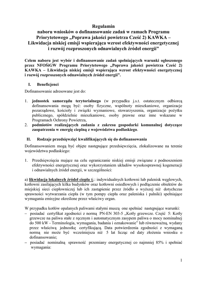 Regulamin naboru wniosków o dofinansowanie zadań w ramach Programu Priorytetowego „Poprawa jakości powietrza Cześć 2) KAWKA – Likwidacja niskiej emisji wspierająca wzrost efektywności energetycznej i rozwój rozproszonych odnawialnych źródeł energii” Celem naboru jest wybór i dofinansowanie zadań spełniających warunki ogłoszonego przez NFOŚiGW Programu Priorytetowego „Poprawa jakości powietrza Cześć 2) KAWKA – Likwidacja niskiej emisji wspierająca wzrost efektywności energetycznej i rozwój rozproszonych odnawialnych źródeł energii”. I. Beneficjenci Dofinansowanie adresowane jest do: 1. 2. II. jednostek samorządu terytorialnego (w przypadku j.s.t. ostatecznym odbiorcą dofinansowania mogą być: osoby fizyczne, wspólnoty mieszkaniowe, organizacje pozarządowe, kościoły i związki wyznaniowe, stowarzyszenia, organizacje pożytku publicznego, spółdzielnie mieszkaniowe, osoby prawne oraz inne wskazane w Programach Ochrony Powietrza, podmiotów realizujących zadania z zakresu gospodarki komunalnej dotyczące zaopatrzenia w energię cieplną z województwa podlaskiego. Rodzaje przedsięwzięć kwalifikujących się do dofinansowania Dofinansowaniem mogą być objęte następujące przedsięwzięcia, zlokalizowane na terenie województwa podlaskiego: 1. Przedsięwzięcia mające na celu ograniczanie niskiej emisji związane z podnoszeniem efektywności energetycznej oraz wykorzystaniem układów wysokosprawnej kogeneracji i odnawialnych źródeł energii, w szczególności: a) likwidacja lokalnych źródeł ciepła tj.: indywidualnych kotłowni lub palenisk węglowych, kotłowni zasilających kilka budynków oraz kotłowni osiedlowych i podłączenie obiektów do miejskiej sieci ciepłowniczej lub ich zastąpienie przez źródło o wyższej niż dotychczas sprawności wytwarzania ciepła (w tym pompy ciepła oraz paleniska i palniki) spełniające wymagania emisyjne określone przez właściwy organ. W przypadku kotłów opalanych paliwami stałymi muszą one spełniać następujące warunki: posiadać certyfikat zgodności z normą PN-EN 303-5 „Kotły grzewcze. Część 5: Kotły grzewcze na paliwa stałe z ręcznym i automatycznym zasypem paliwa o mocy nominalnej do 500 kW - Terminologia, wymagania, badania i oznakowanie” lub równoważną, wydany przez właściwą jednostkę certyfikującą. Data potwierdzenia zgodności z wymaganą normą nie może być wcześniejsza niż 5 lat licząc od daty złożenia wniosku o dofinansowanie; posiadać nominalną sprawność przemiany energetycznej co najmniej 85% i spełniać wymagania: 1 klasy 4 lub 5 – dla źródeł opalanych paliwami stałymi oddanych do użytkowania przed 01.01.2016 r.; klasy 5 – dla źródeł opalanych paliwami stałymi oddanych do użytkowania po 01.01.2016 r.; powinny być wyposażone w automatyczny podajnik paliwa (nie dotyczy kotłów zgazowujących) i nie mogą posiadać rusztu awaryjnego ani elementów umożliwiających jego zamontowanie. Obowiązkowym elementem projektu obejmującego zastosowanie urządzeń grzewczych na paliwo stałe (węgiel kamienny lub biomasę) powinno być zapewnienie systemu kontroli eksploatacji tych urządzeń. Minimalny zakres kontroli powinien obejmować: trwałą likwidację starego kotła na paliwo stałe i użytkowanie urządzenia grzewczego objętego dofinansowaniem jako podstawowego źródła ciepła w budynku; weryfikację nieuprawnionych modyfikacji kotła umożliwiających spalanie odpadów (np. dorobiony dodatkowy ruszt); warunki składowania opału w celu jego ochrony przed zawilgoceniem; weryfikację faktur zakupu paliwa w zakresie zgodności z parametrami paliwa dopuszczonymi przez producenta kotła w dokumentacji techniczno-ruchowej urządzenia, w tym możliwość pobrania i zbadania parametrów próbki paliwa. W przypadku likwidacji palenisk indywidualnych zakres przedsięwzięcia może m.in. obejmować wykonanie wewnętrznej instalacji c.o. lub instalacji gazowej; b) rozbudowa sieci ciepłowniczej w celu podłączenia istniejących obiektów (ogrzewanych ze źródeł lokalnych przy wykorzystywaniu paliwa stałego) do centralnego źródła ciepła wraz z podłączeniem obiektu do sieci; Warunkiem uzyskania dofinansowania dla rozbudowy sieci ciepłowniczej jest podłączenie wykonanej sieci cieplnej do ostatecznego odbiorcy korzyści. c) zastosowanie kolektorów słonecznych celem obniżenia emisji w lokalnym źródle ciepła opalanym paliwem stałym bądź celem współpracy ze źródłem ciepła zastępującym źródło ciepła opalane paliwem stałym. 2. 3. 4. Zakup aparatury dla kontroli rodzaju stosowanych paliw i pomiaru emisji (dotyczy, jeżeli beneficjentem końcowym jest jednostka samorządu terytorialnego lub instytucja przez nią wskazana); Kampanie edukacyjne (dotyczy beneficjentów końcowych z wyłączeniem osób fizycznych) pokazujące korzyści zdrowotne i społeczne z eliminacji niskiej emisji oraz/lub informujące o horyzoncie czasowym wprowadzenia zakazu stosowania paliw stałych lub innych działań systemowych gwarantujących utrzymanie poziomu stężeń zanieczyszczeń po wykonaniu działań naprawczych. Utworzenie baz danych (dotyczy przypadku, gdy beneficjentem jest jednostka samorządu terytorialnego lub instytucja przez nią wskazana) pozwalających na inwentaryzację źródeł emisji. 2 Warunkiem uzyskania dofinansowania na przedsięwzięcia wymienione w ust. 1 jest ich łączna realizacja z działaniami wymienionymi w ust. 3 i 4. Wymóg dotyczący utworzenia baz danych uznaje się za spełniony, jeżeli działanie to zostało wykonane w sposób kompleksowy przez danego beneficjenta w ramach poprzednich programów: „Poprawa jakości powietrza” i „Likwidacja niskiej emisji wspierająca wzrost efektywności ekologicznej i rozwój rozproszonych odnawialnych źródeł energii. Część 1) Program pilotażowy KAWKA” lub sfinansowane ze środków pozyskanych z innych źródeł. III. 1. 2. Warunki uzyskan