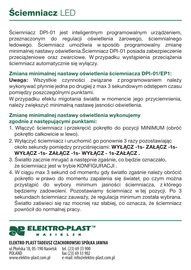 Ściemniacz LED Ściemniacz DPI-01 jest inteligentnym programowalnym urządzeniem, przeznaczonym do regulacji oświetlenia żarowego, ściemnialnego ledowego. Ściemniacz umożliwia w sposób programowalny zmianę minimalnej nastawy oświetlenia.Ściemniacz DPI-01 posiada zabezpieczenie przeciążeniowe oraz zwarciowe. W przypadku wystąpienia przeciążenia ściemniacz automatycznie się wyłączy. Zmiana minimalnej nastawy oświetlenia ściemniacza DPI-01/EP1: Uwaga: Wszystkie czynności związane z programowaniem należy wykonywać płynnie jedna po drugiej z max 3 sekundowym odstępem czasu pomiędzy poszczególnymi punktami. W przypadku efektu migotania światła w momencie jego przyciemnienia, należy zwiększyć minimalną nastawę jasności oświetlenia. Zmianę minimalnej nastawy oświetlenia wykonujemy zgodnie z następującymi punktami: 1. Włączyć ściemniacz i przekręcić pokrętło do pozycji MINIMUM (obróć pokrętło całkowicie w lewo). 2. Wyłączyć ściemniacz i uruchomić go ponownie 3 razy pozostawiając około sekundy pomiędzy przyciśnięciami: WYŁĄCZ -1s- ZAŁĄCZ -1sWYŁĄCZ -1s- ZAŁĄCZ -1s- WYŁĄCZ - 1s-ZAŁĄCZ . 3. Światło zacznie mrugać a następnie zgaśnie, co będzie oznaczało, że ściemniacz jest w trybie KONFIGURACJI . 4. W ciągu max 3 sekund od momentu gdy światło zgaśnie należy obrócić pokrętło w prawo do momentu zapalenia się świateł, po czym można przystąpić do wybory minimum jasności ściemniacza, z którego będziemy zadowoleni. Pozostawiamy ściemniacz w tej pozycji. Po 3 sekundach ściemniacz zauważy, że regulacja minimum została wybrana. Światło zaświeci się raz mocniej raz słabiej, co oznacza, że ściemniacz powrócił do normalnej pracy. ELEKTRO-PLAST TADEUSZ CZACHOROWSKI SPÓŁKA JAWNA ul.Płońska 18, 05-190 Nasielsk tel. (23) 69 33 900 POLAND fax (23) 69 33 902 www.elektro-plast.com.pl e-mail: [email protected] Sposób podłączenia i montażu Przed przystąpieniem do montażu należy wyłączyć zasilanie w rozdzielnicy elektrycznej. Zaleca się, aby montażu dokonała osoba posiadająca odpowiednie kwalifikacje. Podstawowe parametry: Znamionowe napięcie zasilania: 230 VAC Tolerancja napięcia zasilania: -15 +10% Częstotliwość znamionowa: 50 Hz Sterowanie oświetleniem: wyłącznik i regulacja na potencjometrze Moc obciążenia LED: 0 ÷ 100W, max 10 żarówek LED ściemnialnych Moc obciążenia żarowego: 10 ÷ 250W Uwagi: Ściemniacz DPI-01/EP1 nie współpracuje z obciążeniem halogenowym zasilanym poprzez transformator magnetyczny (np. transformator toroidalny) Liczba zacisków przyłączeniowych: 3 Przekrój przewodów przyłączeniowych: max 1,5mm2 • Mocowanie obudowy: standardowa puszka podtynkowa Ø60 mm • Stopień ochrony: IP20 • Temperaturowy zakres pracy: od -20 °C do +45 °C • Stopień zanieczyszczenia: 2 • Wymiary mechanizmu: 70 x 70 x 31 mm • Waga mechanizmu : 0,120 kg
