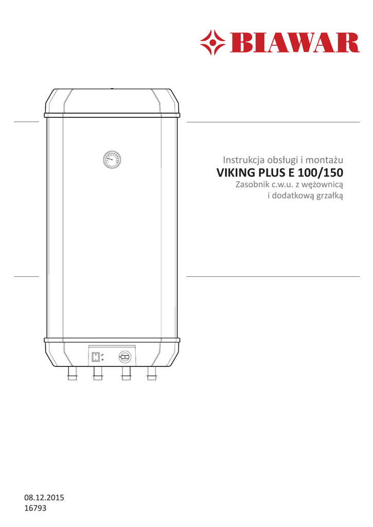 Instrukcja obsługi i montażu VIKING PLUS E 100/150 Zasobnik c.w.u. z wężownicą i dodatkową grzałką 08.12.2015 16793 Zamieszczone w instrukcji schematy instalacyjne nie zastępują projektu instalacji i mogą służyć jedynie do celów poglądowych. Produkt nie jest przeznaczony do używania przez osoby o obniżonej sprawności fizycznej / psychicznej lub nieposiadających doświadczenia i wiedzy, jeśli osoby te nie są nadzorowane lub instruowane przez osobę odpowiedzialną za ich bezpieczeństwo. Zabrania się obsługi urządzenia przez dzieci. Zastrzega się możliwość wprowadzania zmian konstrukcyjnych i zmian w instrukcji. ©NIBE-BIAWAR 2015 2 Zasobnik c.w.u. z wężownicą i dodatkową grzałką Viking Plus E 100 - 150 litrów SPIS TREŚCI Spis treści 1. Informacje ogólne...............................4 1.1 Wstęp............................................................ 4 1.2 Zastosowanie................................................. 4 1.3 Kontakt.......................................................... 4 2. Opis budowy......................................5 2.1 Budowa i działanie......................................... 5 3. Instalacja............................................5 3.1. Miejsce Instalacji.......................................... 5 3.2 Zawieszenie zasobnika................................... 6 3.3 Wymagania instalacji hydraulicznej............... 6 3.3 Wymagania instalacji elektrycznej................. 7 4. Podłączenie, uruchomienie, obsługa...7 4.1 Podłączenie................................................... 7 4.2 Uruchomienie................................................ 7 4.2.1 Izolacja termiczna instalacji....................................... 7 4.3 Obsługa.......................................................... 8 4.3.1 Zabezpieczenie termiczne......................................... 8 4.3.2 Montaż czujnika temperatury................................... 8 4.4 Ostrzeżenia i zalecenia praktyczne................ 8 4.5 Zabezpieczenie przed zamarznięciem........... 9 5. Konserwacja.......................................9 5.1 Wymiana anody ochronnej........................... 9 6. Serwis...............................................10 7. Akcesoria i części zamienne..............10 8. Wyposażenie....................................10 9. Dane techniczne...............................11 9.1 Wymiary urządzeń....................................... 12 10. Opis tabliczki znamionowej.............13 11. Recykling i utylizacja.......................13 KARTA GWARANCYJNA.........................14 Zasobnik c.w.u. z wężownicą i dodatkową grzałką Viking Plus E 100 - 150 litrów 3 INSTRUKCJA OBSŁUGI I MONTAŻU 1. Informacje ogólne 1.1 Wstęp Dziękujemy za okazane zaufanie i wybór urządzenia marki VIKING. Aby móc w pełni skorzystać z zalet tego urządzenia, prosimy przed użyciem przeczytać niniejszą instrukcję, a w szczególności rozdziały dotyczące instalacji, bezpieczeństwa obsługi oraz gwarancji. Prosimy przechowywać instrukcję w bezpiecznym miejscu i udostępnić ją w razie potrzeby. UWAGA Producent nie ponosi odpowiedzialności za szkody spowodowane przez nieprzestrzeganie niniejszej instrukcji. UWAGA Rozdziały niniejszej instrukcji dotyczące instalacji, przeglądów i konserwacji są przeznaczone dla wykwalifikowanych instalatorów. 1.2 Zastosowanie Zasobniki wody firmy NIBE-BIAWAR służą wyłącznie do podgrzewania, magazynowania i zaopatrywania w ciepłą wodę użytkową w budynkach jedno i wielorodzinnych, budynkach użyteczności publicznej, warsztatach, itp. Zasobniki wody serii VIKING PLUS występują w wariantach E100 i E150. Wyposażone są w grzałkę elektryczną o mocy 2 kW z regulacją temperatury w zakresie od 35 do 80 °C, wężownicę spiralną oraz wskaźnik temperatury. Wężownica może współpracować z niemal każdą instalacją centralnego ogrzewania lub innym źródłem ciepła np. kolektorem słonecznym, pompą ciepła itp. Są łatwe do instalowania, bezpieczne i wygodne w użytkowaniu. Podgrzaną wodę można doprowadzić do kilku miejsc czerpalnych oddalonych od siebie np. wanna, umywalka, zlew, itp. Rys. 1 Zasobnik wody VIKING PLUS 1.3 Kontakt W razie jakichkolwiek pytań lub wątpliwości prosimy o kontakt z naszą firmą: NIBE-BIAWAR sp. z o.o. Al. Jana Pawła II 57, 15-703 Białystok, Tel (85) 662 84 90, fax (85) 662 84 09, www.biawar.com.pl „NIBE-BIAWAR” sp. z o.o. zastrzega sobie prawo do wprowadzenia zmian technicznych oferowanych wyrobów. Wyrób został wykonany wg standardów PN-EN 60335-2-21. Wszystkie wyroby tej serii umożliwiają podłączenie układu cyrkulacyjnego. UWAGA Zasobnik służy do ogrzewania i zaopatrywania w wodę na cele użytkowe. Każde niewłaściwe i niezgodne z przeznaczeniem zastosowanie jest zakazane. Inne zastosowanie traktowane jest jako niezgodne z przeznaczeniem. Za wynikające z tego tytułu szkody nie odpowiada producent ani dostawca. 4 Zasobnik c.w.u. z wężownicą i dodatkową grzałką Viking Plus E 100 - 150 litrów INSTRUKCJA OBSŁUGI I MONTAŻU 2. Opis budowy Zasobniki wody serii VIKING PLUS E100, E150 są urządzeniami ciśnieniowymi, tzn. ciśnienia panujące w zbiorniku i wężownicy są równoważne ciśnieniom w odpowiadających im instalacjach. Główną częścią zasobnika jest zbiornik, w którym podgrzewana jest woda, wykonany z wysokogatunkowej blachy stalowej i zabezpieczony przed korozją emalią ceramiczną oraz ochronną anodą magnezową. Urządzenie wyposażone zostało w elektryczny element grzejny o mocy 2 kW z nastawnym termoregulatorem umożliwiającym podgrzewanie wody użytkowej w zakresie od 35 do 80 °C oraz wężownicę spiralną, podłączaną do instalacji c. o. Całość umieszczona jest w estetycznej obudowie z blachy stalowej (w pełni zabezpieczonej przed korozją farbą proszkową) i tworzywa sztucznego. Izolację termiczną stanowi gruba warstwa bezfreonowej pianki poliuretanowej PUR, która 