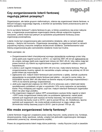 Do druku 1z8 http://poradnik.ngo.pl/x/29348?print_doc_id=1279813 Loterie fantowe Czy zorganizowanie loterii fantowej regulują jakieś przepisy? Organizacjom, ale także grupom nieformalnym, zdarza się organizować loterie fantowe, w których losujący wygrywają nagrody, a dochód ze sprzedaży losów przeznaczony jest na ważny społeczny cel. Co to są loterie fantowe? Loteria fantowa to gra, w której uczestniczy się przez nabycie losu, a organizacja pozarządowa organizująca loterię oferuje wyłącznie wygrane rzeczowe. Loteria może być jednym ze sposobów pozyskiwania funduszy przez organizację pozarządową. Loterie może być zorganizowana jako samodzielne działanie, albo w ramach jakiejś imprezy – festynu lub koncertu. Organizacje zauważają, że organizacja loterii w ramach popularnej imprezy znacznie zwiększa skuteczność działania. Zainteresowanie ludzi loterią zorganizowaną jako samodzielne działanie może być trudne. Warto pamiętać, że: Zorganizowanie loterii charytatywnej wymaga zezwolenia wydanego przez izbę celną (jeśli pula nagród wynosi w 2015 r. co najmniej 3941,49 zł) lub zgłoszenia jej do urzędu celnego (jeśli pula nagród jest niższa niż 3941,49 zł). Izby celne mają też prawo kontroli czy loterie są organizowane zgodnie z przepisami ustawy o grach hazardowych. Loteria o puli nagród mniejszej niż 3941,49 zł to tzw. mała loteria fantowa. Plan jej zorganizowania musimy zgłosić do naczelnika urzędu celnego nie później niż 30 dni przed dniem jej rozpoczęcia. Zgłoszenie tzw. małych loterii fantowych jest zwolnione z opłaty. Jednak uzyskanie zezwolenia na pozostałe loterie fantowe jest płatne – nie jest to suma niska, bo minimalnie wynosi 3941,49 (dla loterii na terenie więcej niż jednego województwa) i 1970 zł (na terenie jednego województwa). Jeśli pula nagród jest większa niż 3941,49 zł to wówczas zysk z loterii jest także opodatkowany podatkiem od gier w wysokości 10% sumy wpływów ze sprzedaży losów. Przy mniejszej puli nagród, czyli tzw. małych loteriach fantowych organizator loterii nie płaci tego podatku. Dla organizacji mających status OPP przewidziano wyższe limity nagród w loterii –OPP może zorganizować loterię tylko na podstawie zgłoszenia, nawet jeżeli wartość puli wygranych jest wyższa od kwoty bazowej, nie może przekroczyć 15-krotności tej kwoty (czyli w 2015 r. jest to ponad 59 tys. zł). Dodatkowo, łączna wartość puli wygranych, nie może jednak przekroczyć w ciągu całego roku 30-krotności kwoty bazowej (czyli w 2015 r. jest to ponad 118 tys. zł). Kto może zorganizować loterię fantową? Loterie fantowe mogą być urządzane przez osoby fizyczne, osoby prawne (np. fundacje, stowarzyszenia, kluby sportowe, szkoły, urzędy) lub jednostki organizacyjne niemające osobowości prawnej (np. stowarzyszenia zwykłe). Prawo do zorganizowania loterii mają różne podmioty – osoby fizyczne (czyli w zasadzie 2015-06-10 12:43 Do druku http://poradnik.ngo.pl/x/29348?print_doc_id=1279813 każdy, więc także grupy nieformalne), osoby prawne (w tym fundacje i stowarzyszenia) oraz jednostki organizacyjne niemające osobowości prawnej (czyli np. stowarzyszenia zwykłe). Zorganizowanie loterii jest regulowane ustawą, warto pamiętać, że jeżeli organizacja chciałaby zorganizować inną grę (np. gra bingo fantowe), to trzeba poszukać informacji o przepisach, które jej dotyczą. Będą one odrobinę różnić się od tych, które dotyczą loterii. Przepisy ustawy o grach hazardowych nie przewidują wyłączeń ze stosowania przepisów ze względu na rodzaj podmiotu, który loterię organizuje – dotyczą one zarówno organizacji pozarządowych, jak i jednostek samorządu terytorialnego chcących zorganizować loterię (niezależnie od tego, kto ją organizuje, obowiązują takie same przepisy). Zezwolenie lub zgłoszenie Aby zorganizować loterię fantową konieczne jest uzyskanie zezwolenia lub jej zgłoszenie do urzędu celnego. To, czy organizator musi zgłosić loterię czy uzyskać zezwolenie zależy od wysokości puli nagród w danej loterii. Organizacja, która chce urządzić loterię powinna więc najpierw określić wartość wygranych. Pulę wygranych określamy wyceniając każdą rzecz, która znajdzie się w puli i dodając te kwoty do siebie. Jeśli łączna suma wszystkich nagród jest wyższa od tzw. kwoty bazowej (czyli od przeciętnego miesięcznego wynagrodzenia w sektorze przedsiębiorstw bez wypłat nagród z zysku, w drugim kwartale roku poprzedniego, ogłoszonego w obwieszczeniu Prezesa GUS) to należy wysłać zgłoszenie, a jeśli jest wyższa niż kwota bazowa to występujemy o zezwolenie. Kwota ta zmienia się co roku. Przeciętne miesięczne wynagrodzenie w sektorze przedsiębiorstw bez wypłat nagród z zysku w drugim kwartale 2014 r. wyniosło 3941,49 zł. tyle wynosi więc kwota bazowa w roku 2015 r. (http://stat.gov.pl/sygnalne/komunikaty-i-obwieszczenia/listakomunikatow-i-obwieszczen/obwieszczenie-w-sprawie-miesiecznegowynagrodzenia-w-sektorze-przedsiebiorstw-bez-wyplat-nagrod-z-zyskuw-drugim-kwartale-2014-r-,59,3.html). UWAGA! Dodatkowo, pewne szczególne zasady obowiązują, jeżeli organizatorem loterii jest organizacja pożytku publicznego (OPP). Taka organizacja może zorganizować loterię na podstawie zgłoszenia, nawet jeżeli wartość puli wygranych jest wyższa od kwoty bazowej, jeżeli tylko nie przekracza 15-krotności tej kwoty (czyli w 2015 r. jest to ponad 59 tys. zł). Dodatkowo, łączna wartość puli wygranych, nie może przekroczyć w ciągu roku kalendarzowego 30-krotności kwoty bazowej (czyli w 2015 r. jest to ponad 118 tys. zł). Komu zgłaszamy przeprowadzenie loterii? Kto udziela zezwolenia na przeprowadzenie loterii? Udziela go dyrektor właściwej izby celnej, czyli izby celnej, na terenie której ma być zorganizowana loteria. Jeżeli jej zasięg przekracza jedno województwo będzie to izba właściwa