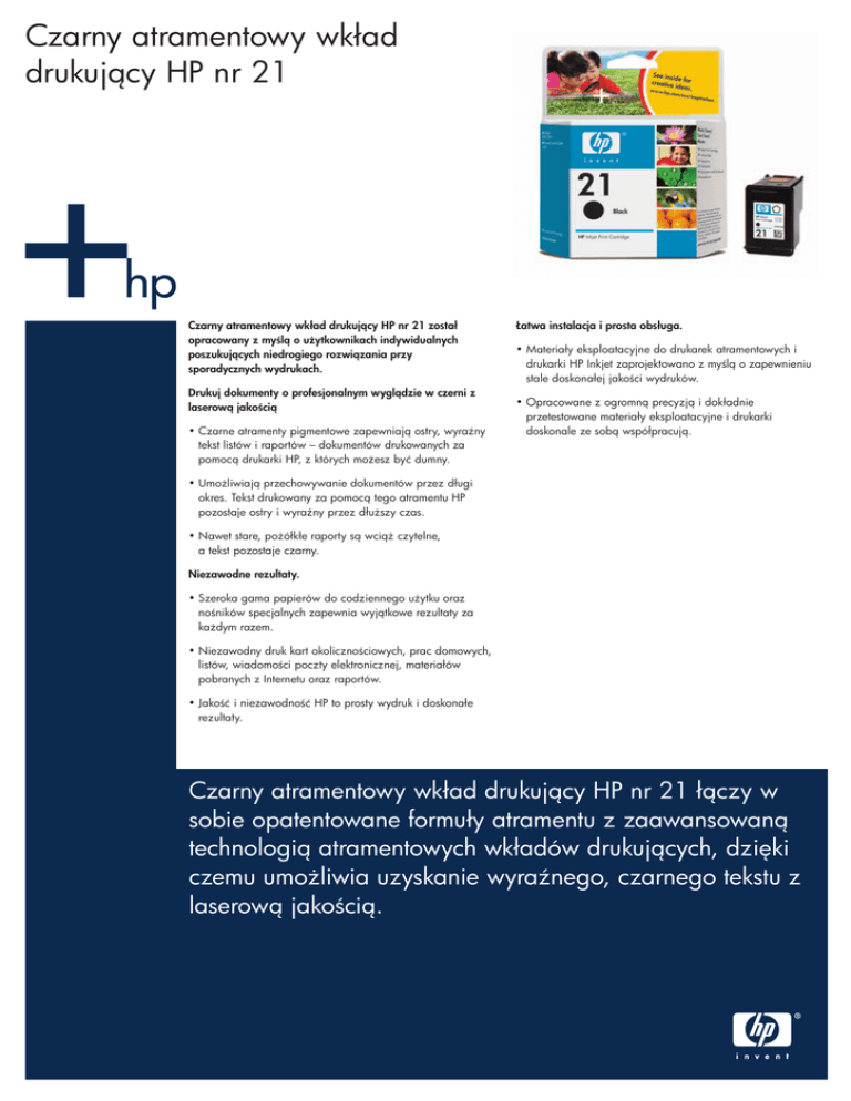 Czarny atramentowy wkład drukujcy HP nr 21 Czarny atramentowy wkład drukujcy HP nr 21 został opracowany z myl o uytkownikach indywidualnych poszukujcych niedrogiego rozwizania przy sporadycznych wydrukach. Drukuj dokumenty o profesjonalnym wygldzie w czerni z laserow jakoci • Czarne atramenty pigmentowe zapewniaj ostry, wyrany tekst listów i raportów – dokumentów drukowanych za pomoc drukarki HP, z których moesz być dumny. Łatwa instalacja i prosta obsługa. • Materiały eksploatacyjne do drukarek atramentowych i drukarki HP Inkjet zaprojektowano z myl o zapewnieniu stale doskonałej jakoci wydruków. • Opracowane z ogromn precyzj i dokładnie przetestowane materiały eksploatacyjne i drukarki doskonale ze sob współpracuj. • Umoliwiaj przechowywanie dokumentów przez długi okres. Tekst drukowany za pomoc tego atramentu HP pozostaje ostry i wyrany przez dłuszy czas. • Nawet stare, poółkłe raporty s wci czytelne, a tekst pozostaje czarny. Niezawodne rezultaty. • Szeroka gama papierów do codziennego uytku oraz noników specjalnych zapewnia wyjtkowe rezultaty za kadym razem. • Niezawodny druk kart okolicznociowych, prac domowych, listów, wiadomoci poczty elektronicznej, materiałów pobranych z Internetu oraz raportów. • Jakoć i niezawodnoć HP to prosty wydruk i doskonałe rezultaty. Czarny atramentowy wkład drukujcy HP nr 21 łczy w sobie opatentowane formuły atramentu z zaawansowan technologi atramentowych wkładów drukujcych, dziki czemu umoliwia uzyskanie wyranego, czarnego tekstu z laserow jakoci. Czarny atramentowy wkład drukujcy HP nr 21 Specyfikacja produktu Numer produktu C9351AE Opis Czarny atramentowy wkład drukujcy HP nr 21 Numer wyboru 21 Wymiary (dł. x szer. x głb.) 141 x 131 x 37 mm Masa 60g Informacje na temat wydajnoci znajduj si na stronie www.hp.com/pageyield © 2005 Hewlett-Packard Development Company, L.P. Specyfikacje zawarte w tym dokumencie mog bez uprzedzenia ulec zmianie. Wszystkie gwarancje udzielane w odniesieniu do produktów i usług HP okrelone zostały w owiadczeniach gwarancyjnych załczanych do kadego produktu i usługi. aden zapis niniejszego dokumentu nie moe być uwaany za dodatkow gwarancj. HP nie ponosi odpowiedzialnoci za błdy techniczne lub drukarskie w niniejszym dokumencie. Wicej informacji na temat materiałów eksploatacyjnych HP mona uzyskać pod adresem www.hp.pl 5983-2801PLE, 08/2005