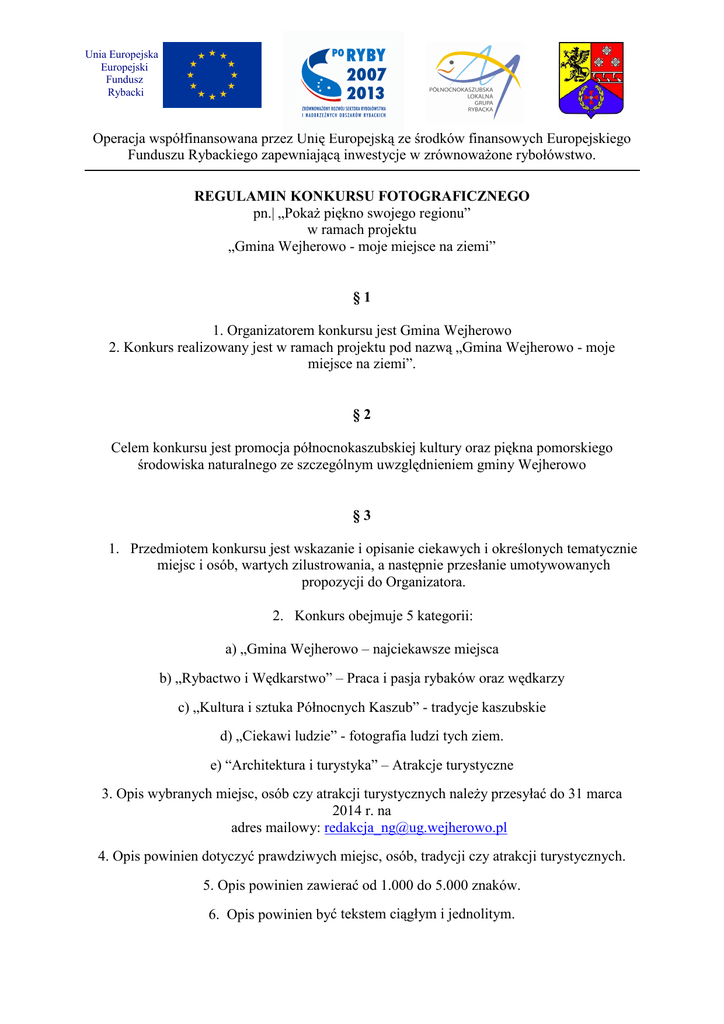 Unia Europejska Europejski Fundusz Rybacki Operacja współfinansowana przez Unię Europejską ze środków finansowych Europejskiego Funduszu Rybackiego zapewniającą inwestycje w zrównoważone rybołówstwo. REGULAMIN KONKURSU FOTOGRAFICZNEGO pn.| „Pokaż piękno swojego regionu” w ramach projektu „Gmina Wejherowo - moje miejsce na ziemi” §1 1. Organizatorem konkursu jest Gmina Wejherowo 2. Konkurs realizowany jest w ramach projektu pod nazwą „Gmina Wejherowo - moje miejsce na ziemi”. §2 Celem konkursu jest promocja północnokaszubskiej kultury oraz piękna pomorskiego środowiska naturalnego ze szczególnym uwzględnieniem gminy Wejherowo §3 1. Przedmiotem konkursu jest wskazanie i opisanie ciekawych i określonych tematycznie miejsc i osób, wartych zilustrowania, a następnie przesłanie umotywowanych propozycji do Organizatora. 2. Konkurs obejmuje 5 kategorii: a) „Gmina Wejherowo – najciekawsze miejsca b) „Rybactwo i Wędkarstwo” – Praca i pasja rybaków oraz wędkarzy c) „Kultura i sztuka Północnych Kaszub” - tradycje kaszubskie d) „Ciekawi ludzie” - fotografia ludzi tych ziem. e) “Architektura i turystyka” – Atrakcje turystyczne 3. Opis wybranych miejsc, osób czy atrakcji turystycznych należy przesyłać do 31 marca 2014 r. na adres mailowy: [email protected] 4. Opis powinien dotyczyć prawdziwych miejsc, osób, tradycji czy atrakcji turystycznych. 5. Opis powinien zawierać od 1.000 do 5.000 znaków. 6. Opis powinien być tekstem ciągłym i jednolitym. Unia Europejska Europejski Fundusz Rybacki Operacja współfinansowana przez Unię Europejską ze środków finansowych Europejskiego Funduszu Rybackiego zapewniającą inwestycje w zrównoważone rybołówstwo. 7. W ocenie nadesłanych prac brane pod uwagę będą: a) oryginalność wskazanego miejsca, osoby, tradycji i atrakcji turystycznej, b) poprawność i oryginalność opisu, tj. język i styl. §4 1. Konkurs jest skierowany do dzieci, młodzieży i dorosłych z terenu Gminy Wejherowo. 2. Od biorących udział w konkursie dzieci wymagana jest zgoda i podpis rodziców albo opiekunów. §5 1. Udział w konkursie jest dobrowolny. 2. Autorem może być jedna osoba, bądź grupa osób, np. klasa 3. Autor może wystartować w każdej z 5 kategorii, zatem maksymalnie można przesłać 5 opisów. 4. Opis powinien być przesłany jako załącznik do wiadomości elektronicznej. W treści maila należy napisać: Imię, Nazwisko, wiek uczestnika, Kategorię Konkursu oraz nr kontaktowy, a także wskazać miejsce, osobę, atrakcję, której fotograf wykona następnie zdjęcie. 5. Jeżeli komisja konkursowa uzna, że zdjęcie ze względów formalnych nie może zostać wykonane – praca zostanie odrzucona. 6. Wykonane w ramach konkursu zdjęcia opublikowane zostaną w wydanym przez gminę Wejherowo albumie fotograficznym. §6 1. Prace, które nie będą spełniały kryteriów przedstawionych w Regulaminie, nie zostaną zakwalifikowane do konkursu. 2. Do oceny złożonych prac zostanie powołane profesjonalne Jury. Jury przyzna najlepszym pracom nagrody i wyróżnienia. Jedna osoba może zdobyć maksymalnie 5 nagród w ramach całego konkursu. §7 1. Konkurs zostaje ogłoszony z dniem ukazania się regulaminu na stronie internetowej Gminy Wejherowo 2. Prace konkursowe należy składać na adres mailowy do 31.03.2014 r. do godziny 12.00. 3. Prace dostarczone po terminie nie będą brały udziału w konkursie. Unia Europejska Europejski Fundusz Rybacki Operacja współfinansowana przez Unię Europejską ze środków finansowych Europejskiego Funduszu Rybackiego zapewniającą inwestycje w zrównoważone rybołówstwo. 4. Rozstrzygnięcie konkursu i rozdanie nagród nastąpi po wydaniu albumu fotograficznego. 5. Osoba do kontaktu w sprawie konkursu: Olga Niemc, tel. 600 157 248 §8 We wszystkich sprawach nie uregulowanych Regulaminem decyduje Jury i ostateczna interpretacja Regulaminu należy do Jury.