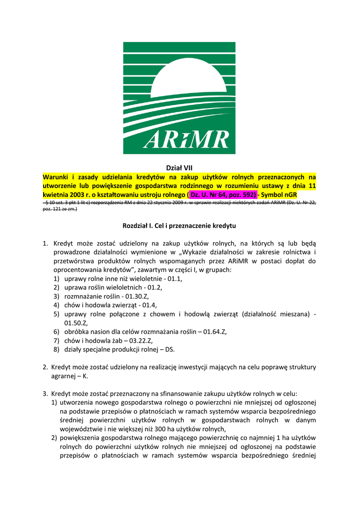 ączni1 do zarządzenia Nr.../2010 Prezesa ARiMR z dnia.......... Dział VII Warunki i zasady udzielania kredytów na zakup użytków rolnych przeznaczonych na utworzenie lub powiększenie gospodarstwa rodzinnego w rozumieniu ustawy z dnia 11 kwietnia 2003 r. o kształtowaniu ustroju rolnego ( Dz. U. Nr 64, poz. 592) - Symbol nGR - § 10 ust. 3 pkt 1 lit c) rozporządzenia RM z dnia 22 stycznia 2009 r. w sprawie realizacji niektórych zadań ARiMR (Dz. U. Nr 22, poz. 121 ze zm.) Rozdział I. Cel i przeznaczenie kredytu 1. Kredyt może zostać udzielony na zakup użytków rolnych, na których są lub będą prowadzone działalności wymienione w „Wykazie działalności w zakresie rolnictwa i przetwórstwa produktów rolnych wspomaganych przez ARiMR w postaci dopłat do oprocentowania kredytów”, zawartym w części I, w grupach: 1) uprawy rolne inne niż wieloletnie - 01.1, 2) uprawa roślin wieloletnich - 01.2, 3) rozmnażanie roślin - 01.30.Z, 4) chów i hodowla zwierząt - 01.4, 5) uprawy rolne połączone z chowem i hodowlą zwierząt (działalność mieszana) 01.50.Z, 6) obróbka nasion dla celów rozmnażania roślin – 01.64.Z, 7) chów i hodowla żab – 03.22.Z, 8) działy specjalne produkcji rolnej – DS. 2. Kredyt może zostać udzielony na realizację inwestycji mających na celu poprawę struktury agrarnej – K. 3. Kredyt może zostać przeznaczony na sfinansowanie zakupu użytków rolnych w celu: 1) utworzenia nowego gospodarstwa rolnego o powierzchni nie mniejszej od ogłoszonej na podstawie przepisów o płatnościach w ramach systemów wsparcia bezpośredniego średniej powierzchni użytków rolnych w gospodarstwach rolnych w danym województwie i nie większej niż 300 ha użytków rolnych, 2) powiększenia gospodarstwa rolnego mającego powierzchnię co najmniej 1 ha użytków rolnych do powierzchni użytków rolnych nie mniejszej od ogłoszonej na podstawie przepisów o płatnościach w ramach systemów wsparcia bezpośredniego średniej powierzchni użytków rolnych w gospodarstwach rolnych w danym województwie i nie większej niż 300 ha użytków rolnych. 4. Przy ustalaniu powierzchni użytków rolnych będących przedmiotem współwłasności uwzględnia się powierzchnię nieruchomości rolnych odpowiadających udziałowi we współwłasności takich nieruchomości, a w przypadku współwłasności łącznej uwzględnia się łączną powierzchnię nieruchomości rolnych stanowiących przedmiot współwłasności. 3. Zasadę, o której mowa w ust. 4, stosuje się odpowiednio do ustalania powierzchni użytków rolnych będących przedmiotem współposiadania samoistnego oraz współposiadania na podstawie użytkowania wieczystego lub na podstawie umowy dzierżawy. 6. Za gospodarstwo rodzinne uważa się gospodarstwo rolne: 1) prowadzone przez rolnika indywidualnego oraz 2) w którym łączna powierzchnia użytków rolnych jest nie większa niż 300 ha. 7. Kredyt może zostać przeznaczony na zakup użytków rolnych, w tym również w celu urządzenia istniejącego gospodarstwa rolnego, które będą stanowiły współwłasność kilku osób, pod warunkiem, że każda z tych osób będzie spełniać warunki określone w niniejszym dziale, z zastrzeżeniem rozdziału II ust. 3. Rozdział II. Podmioty mogące ubiegać się o kredyt 1. O kredyt mogą ubiegać się rolnicy indywidualni posiadający pełną zdolność do czynności prawnych, podejmujący lub prowadzący działalność określoną w rozdziale I ust. 1, z wyłączeniem emerytów i rencistów mających ustalone prawo do renty z tytułu niezdolności do pracy. 2. Za rolnika indywidualnego uważa się osobę fizyczną będącą właścicielem, użytkownikiem wieczystym, samoistnym posiadaczem lub dzierżawcą nieruchomości rolnych, których łączna powierzchnia użytków rolnych nie przekracza 300 ha, posiadającą kwalifikacje rolnicze oraz co najmniej od 5 lat zamieszkałą w gminie, na obszarze której jest położona jedna z nieruchomości rolnych wchodzących w skład gospodarstwa rolnego i prowadzącą przez ten okres osobiście to gospodarstwo. 3. W przypadku, gdy o kredyt ubiegają się małżonkowie, pomiędzy którymi istnieje wspólność majątkowa, przynajmniej jedno z nich musi spełniać warunek posiadania kwalifikacji rolniczych, o którym mowa w ust. 2. 4. Uważa się, że osoba fizyczna: 1) osobiście prowadzi gospodarstwo rolne, jeżeli: a) pracuje w tym gospodarstwie, b) podejmuje wszelkie decyzje dotyczące prowadzenia działalności rolniczej w tym gospodarstwie; 2) posiada kwalifikacje rolnicze, jeżeli uzyskała: a) wykształcenie rolnicze zasadnicze zawodowe, średnie lub wyższe lub b) tytuł kwalifikacyjny lub tytuł zawodowy, lub tytuł zawodowy mistrza w zawodzie przydatnym do prowadzenia działalności rolniczej i posiada co najmniej 3-letni staż pracy w rolnictwie, lub c) wykształcenie wyższe inne niż rolnicze i posiada co najmniej 3-letni staż pracy w rolnictwie albo wykształcenie wyższe inne niż rolnicze i ukończone studia podyplomowe w zakresie związanym z rolnictwem, albo wykształcenie średnie inne niż rolnicze i posiada co najmniej 3-letni staż pracy w rolnictwie, lub d) wykształcenie podstawowe, gimnazjalne lub zasadnicze zawodowe inne niż rolnicze i posiada co najmniej 5-letni staż pracy w rolnictwie. 5. Za staż pracy, o którym mowa w ust. 4 pkt. 2) lit. b-d, uznaje się okres, w którym osoba fizyczna: 1) podlegała ubezpieczeniu społecznemu rolników lub 2) prowadziła działalność rolniczą w gospodarstwie rolnym o obszarze nie mniejszym niż 1 ha stanowiącym jej własność, przedmiot użytkowania wieczystego, przedmiot samoistnego posiadania lub dzierżawy, lub 3) była zatrudniona w gospodarstwie rolnym na podstawie umowy o pracę lub spółdzielczej umowy o pracę, wykonując pracę związaną z prowadzeniem działalności rolniczej, lub 4) wykonywała pracę związaną z prowadzeniem działalności rolniczej w charakterze członka