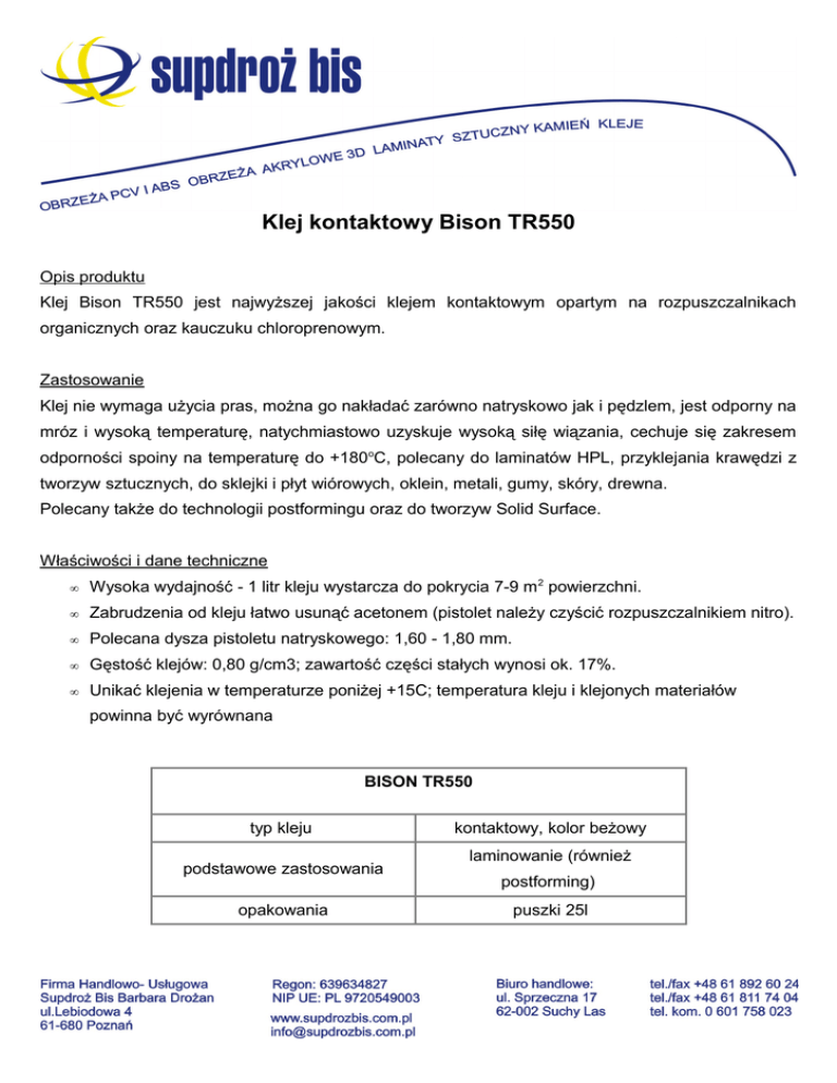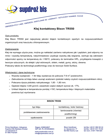 Klej kontaktowy Bison TR550 Opis produktu Klej Bison TR550 jest najwyższej jakości klejem kontaktowym opartym na rozpuszczalnikach organicznych oraz kauczuku chloroprenowym. Zastosowanie Klej nie wymaga użycia pras, można go nakładać zarówno natryskowo jak i pędzlem, jest odporny na mróz i wysoką temperaturę, natychmiastowo uzyskuje wysoką siłę wiązania, cechuje się zakresem odporności spoiny na temperaturę do +180oC, polecany do laminatów HPL, przyklejania krawędzi z tworzyw sztucznych, do sklejki i płyt wiórowych, oklein, metali, gumy, skóry, drewna. Polecany także do technologii postformingu oraz do tworzyw Solid Surface. Właściwości i dane techniczne • Wysoka wydajność - 1 litr kleju wystarcza do pokrycia 7-9 m 2 powierzchni. • Zabrudzenia od kleju łatwo usunąć acetonem (pistolet należy czyścić rozpuszczalnikiem nitro). • Polecana dysza pistoletu natryskowego: 1,60 - 1,80 mm. • Gęstość klejów: 0,80 g/cm3; zawartość części stałych wynosi ok. 17%. • Unikać klejenia w temperaturze poniżej +15C; temperatura kleju i klejonych materiałów powinna być wyrównana BISON TR550 typ kleju podstawowe zastosowania opakowania kontaktowy, kolor beżowy laminowanie (również postforming) puszki 25l Instrukcja stosowania Klej kontaktowy Bison TR550 (Atest PZH HK/B/2817/01/2001) Produkt przeznaczony do klejenia laminatów, tworzyw Solid Surface, płyt drewnopochodnych (MDF, sklejka, płyta wiórowa), oklein, arkuszy metali (aluminium, stal nierdzewna), materiałów izolacyjnych, pianki, do siebie i siebie wzajemnie. Aplikacja Klej nakładać na obie klejone powierzchnie, w dobrze wentylowanym pomieszczeniu, o temperaturze powyżej +15oC. Powierzchnie powinny być czyste i suche, pozbawione tłuszczu oraz pyłów. Temperatura kleju oraz klejonych elementów powinna być wyrównana. Możliwa jest aplikacja kleju pędzlem, jednak najwydajniejszym sposobem jest natrysk pistoletem (zalecana dysza 1,8 mm). Odległość pistoletu od natryskiwanej powierzchni powinna wynosić ok. 30 cm. Nałożyć cienką warstwę kleju, aby uzyskać około 80% pokrycie. Na krawędzie płyt nanieść dodatkową warstwę kleju, aby pokrycie wyniosło 100%. Przy nakładaniu pędzlem nanosić klej równomiernie na całą klejoną powierzchnię. Unikać nierównomiernego i zbyt obfitego nakładania. Przed złożeniem obu klejonych powierzchni pozwolić przeschnąć przez 5 – 20 minut. Czas otwarty kleju: do 40 minut w zależności od warunków temperatury i wilgotności otoczenia. Kiedy klej nie ciągnie się po dotknięciu a spoina jest jedynie lekko klejąca należy połączyć dokładnie obie klejone powierzchnie. Ewentualne przesuwanie klejonych powierzchni po ich złożeniu jest praktycznie niemożliwe. Docisk Po złożeniu klejonych powierzchni nie jest konieczne stosowanie pras. Łączone powierzchnie wystarczy docisnąć mocno ręcznym wałkiem od środka w kierunku krawędzi klejonego elementu. Sklejone i dociśnięte elementy są praktycznie zaraz gotowe do dalszej obróbki. Charakterystyka Klej kontaktowy Bison TR550 Baza chemiczna: kauczuk polichloroprenowy Kolor: beżowy (TR550) Zapach: zapach rozpuszczalnika Gęstość: 0,80 g/cm3 Zawartość części stałych: około 17% Lepkość: 0.2 Pa.s. w temperaturze +20oC Odporność na temperatury: -15oC do +120oC; w krótkim czasie do +180oC Sposób nanoszenia: pistolet (zalecane), pędzel Wydajność: ok. 7 – 9 m2 powierzchni z 1 litra Czas odparowania: 5 -10 minut Czas otwarty: do 40 minut Okres składowania: 18 miesięcy w dobrze zamkniętych pojemnikach i chłodnych pomieszczeniach Wrażliwość na mróz: ograniczona – w przypadku wystawienia na działanie mrozu należy temperaturę kleju stopniowo doprowadzić do +20 oC Opakowania handlowe: 25 l OSTRZEŻENIE R 11 wyrób łatwopalny; R36/38 drażniący dla oczu i skóry; R51/53 toksyczny dla organizmów wodnych, może wywołać długotrwały efekt zanieczyszczenia środowiska; S16 wyrób należy stosować i przechowywać z dala od miejsc grożących iskrzeniem, nie palić papierosów; S23 nie wdychać par; S24/25 chronić skórę i oczy; S26 w przypadku kontaktu z oczami przemyć natychmiast bieżącą wodą i zapewnić konsultację medyczną; S46 w przypadku spożycia zapewnić natychmiastową pomoc medyczną pokazać kartę bezpieczeństwa lub etykietę; S 51 używać w dostatecznie wentylowanych pomieszczeniach.