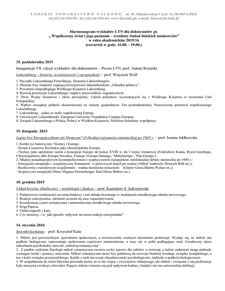 Ł Ó D Z K I E T O W A R Z Y S T W O N A U K O W E , ul. M. Skłodowskiej-Curie 11, 90-505 ŁÓDŹ tel.(42) 66-554-59; fax (42) 66-554-64; www.ltn.lodz.pl; e-mail: [email protected] Harmonogram wykładów ŁTN dla doktorantów pt. „ Współczesny świat i jego poznanie – rezultaty badań łódzkich naukowców” w roku akademickim 2015/16 (czwartek w godz. 16.00. - 19.00.) 15. października 2015 Inauguracja VII. edycji wykładów dla doktorantów – Prezes ŁTN, prof. Antoni Różalski Luksemburg – historia, teraźniejszość i europejskość – prof. Wojciech Wolf 1. Początki Luksemburga Fortyfikacje. Dynastia Luksemburgów. 2. Złożone losy władców rządzących księstwem luksemburskim. „Gibraltar pólnocy”. 3. Powstanie niepodległego Wielkiego Księstwa Luksemburg. 4. Rozwój przemysłu Luksemburga i napływ pracowników zagranicznych. 5. Dwie Wojny Światowe i okres powojenny. Udział polityków wywodzących się z Wielkiego Księstwa w tworzeniu Unii Europejskiej. 6. Wpływ rozsądnej polityki ekonomicznej na zmiany gospodarcze. Era postindustrialna. Nowoczesny przemysł współczesnego Luksemburga. 7. Luksemburg – jedna ze stolic współczesnej Europy. 8. Uniwersytet Luksemburski. European University Foundation Campus Europae. 9. Związki Luksemburga z Polską. Polacy w Wielkim Księstwie. Możliwe dziedziny współpracy. 19. listopada 2015 Lepiej być Europejczykiem niż Niemcem? O (braku) tożsamości niemieckiej po 1945 r. – prof. Joanna Jabłkowska 1. Krótki rys historyczny: Niemcy i Europa: - Święte Cesarstwo Rzymskie jako chrześcijańska Europa; - Niemcy jako spóźniony naród a koncepcje Europy od końca XVIII w. do I wojny światowej (Federalizm Kanta, Rzym Goethego, Chrześcijaństwo albo Europa Novalisa, Francja i Europa Heinego, ‘Mitteleuropa’, ‘Pan-Europa’). 2. Między ponadnarodowym kosmopolityzmem i sceptycyzmem europejskim: intelektualne debaty niemieckie po 1945 r.: - Entuzjazm europejski i ‚socjalistyczny humanizm’ w pierwszych latach po wojnie (Alfred Andersch, Heinrich Böll etc.); - Rozliczenia z narodowym socjalizmem – trudna niemiecka tożsamość (Günter Grass,Martin Walser etc.); - Sceptycyzm europejski (Hans Magnus Enzensberger, Karl Heinz Bohrer etc.). 10. grudnia 2015 Układ brzeżny (limbiczny) – morfologia i funkcje – prof. Kazimierz S. Jędrzejewski 1. Podstawowe wiadomości na temat budowy i roli układu brzeżnego w strukturach ośrodkowego układu nerwowego. 2. Reakcje emocjonalne, zdolność uczenia się oraz zapamiętywania. 3. Koordynacja części somatycznej i autonomicznej ośrodkowego układu nerwowego. 4. Krąg Papeza. 5. Układ nagrody i kary. 6. Czy możemy, i w jaki sposób, wpływać na nasze reakcje emocjonalne? 14. stycznia 2016 Instynkt kochania – prof. Krzysztof Kula 1. Miłość jest powszechnym zjawiskiem społecznym, a równocześnie ważnym elementem prokreacji. Wydaje się, że miłość ma podłoże biologiczne, reprezentuje zachowania częściowo autonomiczne, a więc nie w pełni podlegające woli. Gwałtowny okres zakochania psycholodzy nazwali „miłością romantyczną”. 2. Z punktu widzenia fizjologii miłość romantyczna zawiera cechy typowe dla zalotów u zwierząt, a ludzie zadurzeni mogą niekiedy wymagać troski i pomocy otoczenia. Miłość romantyczna może być podstawą do rozwoju bardziej trwałego związku kompletnego, a ten z kolei związku przyjacielskiego. Każdy z nich ma swoje charakterystyki psychologiczne, niekiedy o podłożu biologicznym. 3. W uzupełnieniu do teorii Darwina powstała teoria, że to nie wojny i zwycięstwo silniejszego, ale miłość i związane z nią preferencje były maszyną ewolucji człowieka. Pojęcie miłości zmienia się pod wpływem kultury i badań i nie ma uniwersalnej definicji. 18. lutego 2016 Sposoby napędzania (źródła napędu) pojazdów XXI wieku – prof. Andrzej Szosland 1. Podstawowe informacje o sposobach napędu pojazdów – dlaczego samochód jeździ. 2. Dotychczasowe wykorzystanie różnych źródeł energii. 3. Stosowane współcześnie rozwiązania układów napędowych. 4. Pozory mylą – samochód elektryczny. 5. Wizja przyszłości – samochód XXI wieku. 17. marca 2016 Republika Czeska – oczami Konsula Honorowego – prof. Krzysztof Skotnicki 1. Powstanie Republiki Czeskiej – przyczyny rozpadu Czechosłowacji. 2. System rządów w Republice Czeskiej – naczelne zasady ustroju i system organów państwa . 3. Zadania konsulów honorowych. 4. Najważniejsze wydarzenia zorganizowane w Łodzi i Polsce prze Konsula Honorowego Republiki Czeskiej w Łodzi. 7. kwietnia 2016 GRAFEN – nadzieja na przełom technologiczny czy realna perspektywa?– prof. Piotr Kula 1. Efektywne użytkowe zastosowania wyrobów wytwarzanych z udziałem grafenu jako materiału bazowego są uwarunkowane opracowaniem metod wytwarzania w skali przemysłowej wielkopowierzchniowego grafenu o strukturze i właściwościach zbliżonych do teoretycznych. W Politechnice Łódzkiej opracowano oryginalną metodę wytwarzania wielkopowierzchniowych płatów grafenu poprzez ich kontrolowany wzrost z ciekłej fazy metalicznej. Tak wytwarzany grafen jest bliski doskonałości strukturalnej tzn. jest jednowarstwowy i quasimonokrystaliczny, co skutkuje jego bardzo wysoką kohezją potwierdzoną w statycznych i cyklicznych próbach wytrzymałości na rozciąganie. Tak wytwarzany materiał 2D autorzy nazwali „High Strenth Metallurgical Graphene” – HSMG. 2. Właściwości mechaniczne i fizyczne predysponują grafen metalurgiczny o wysokiej wytrzymałości do zastosowania jako fazy zbrojącej i równocześnie funkcjonalnie czynnej w laminatach. Możliwość wielokrotnego transferu HSMG pomiędzy różnymi podłożami stwarza perspektywy kontrolowanego sterowania dystansem między kolejnymi warstwami zbrojącymi w matrycy polimerowej. Odrębnym obszarem potencjalnych aplikacji HSMG jest sensoryka gazów i promieniowania elektromagnetycznego