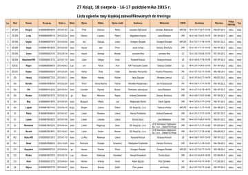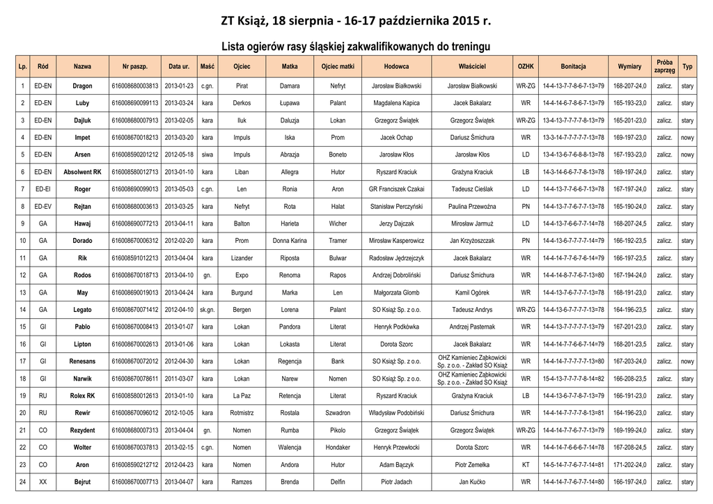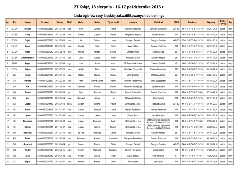 ZT Książ, 18 sierpnia - 16-17 października 2015 r. Lista ogierów rasy śląskiej zakwalifikowanych do treningu Maść Ojciec Matka Ojciec matki Hodowca Właściciel OZHK Bonitacja Wymiary Próba zaprzęg Typ 616008680003813 2013-01-23 c.gn. Pirat Damara Nefryt Jarosław Białkowski Jarosław Białkowski WR-ZG 14-4-13-7-7-8-6-7-13=79 168-207-24,0 zalicz. stary Luby 616008690099113 2013-03-24 kara Derkos Łupawa Palant Magdalena Kapica Jacek Bakalarz WR 14-4-14-6-7-8-6-7-13=79 165-193-23,0 zalicz. stary ED-EN Dajluk 616008680007913 2013-02-05 kara Iluk Daluzja Lokan Grzegorz Świątek Grzegorz Świątek WR-ZG 13-4-13-7-7-7-7-8-13=79 165-201-23,0 zalicz. stary 4 ED-EN Impet 616008670018213 2013-03-20 kara Impuls Iska Prom Jacek Ochap Dariusz Śmichura WR 13-3-14-7-7-7-7-7-13=78 169-197-23,0 zalicz. nowy 5 ED-EN Arsen 616008590201212 2012-05-18 siwa Impuls Abrazja Boneto Jarosław Kłos Jarosław Kłos LD 13-4-13-6-7-6-8-8-13=78 167-193-23,0 zalicz. nowy 6 ED-EN Absolwent RK 616008580012713 2013-01-10 kara Liban Allegra Hutor Ryszard Kraciuk Grażyna Kraciuk LB 14-3-14-6-6-7-7-8-13=78 169-197-24,0 zalicz. stary 7 ED-EI Roger 616008690099013 2013-05-03 c.gn. Len Ronia Aron GR Franciszek Czakai Tadeusz Cieślak LD 14-4-13-7-7-6-6-7-13=78 167-197-24,0 zalicz. stary 8 ED-EV Rejtan 616008680003613 2013-03-25 kara Nefryt Rota Halat Stanisław Perczyński Paulina Przewoźna PN 14-4-13-7-7-6-7-7-13=78 165-190-24,0 zalicz. stary 9 GA Hawaj 616008690077213 2013-04-11 kara Balton Harieta Wicher Jerzy Dajczak Mirosław Jarmuż LD 14-4-13-7-6-6-7-7-14=78 168-207-24,5 zalicz. stary 10 GA Dorado 616008670006312 2012-02-20 kara Prom Donna Karina Tramer Mirosław Kasperowicz Jan Krzyżoszczak PN 14-4-13-6-7-7-7-7-14=79 166-192-23,5 zalicz. stary 11 GA Rik 616008591012213 2013-04-04 kara Lizander Riposta Bulwar Radosław Jędrzejczyk Jacek Bakalarz WR 14-4-14-7-7-6-7-6-14=79 166-197-23,5 zalicz. stary 12 GA Rodos 616008670018713 2013-04-10 gn. Expo Renoma Rapos Andrzej Dobroliński Dariusz Śmichura WR 14-4-14-8-7-7-6-7-13=80 167-194-24,0 zalicz. stary 13 GA May 616008690019013 2013-04-24 kara Burgund Marka Len Małgorzata Glomb Kamil Ogórek WR 14-4-13-7-6-7-7-7-13=78 168-191-23,0 zalicz. stary 14 GA Legato 616008670071412 2012-04-10 sk.gn. Bergen Lorena Palant SO Książ Sp. z o.o. Tadeusz Andrys WR-ZG 14-4-13-6-7-7-7-7-13=78 164-196-23,5 zalicz. stary 15 GI Pablo 616008670008413 2013-01-07 kara Lokan Pandora Literat Henryk Podkówka Andrzej Pasternak WR 14-4-13-7-7-7-7-7-13=79 167-201-23,0 zalicz. stary 16 GI Lipton 616008670002613 2013-01-06 kara Lokan Lokasta Literat Dorota Szorc Jacek Bakalarz WR 14-4-14-7-7-6-6-7-14=79 168-201-23,5 zalicz. stary 17 GI Renesans 616008670072012 2012-04-30 kara Lokan Regencja Bank SO Książ Sp. z o.o. WR 14-4-14-7-7-7-7-7-13=80 167-203-24,0 zalicz. nowy 18 GI Narwik 616008670078611 2011-03-07 kara Lokan Narew Nomen SO Książ Sp. z o.o. WR 15-4-13-7-7-7-7-8-14=82 166-208-23,5 zalicz. stary 19 RU Rolex RK 616008580012613 2013-01-10 kara La Paz Retencja Literat Ryszard Kraciuk Grażyna Kraciuk LB 14-4-13-6-7-7-8-7-13=79 166-191-23,0 zalicz. stary 20 RU Rewir 616008670096012 2012-10-05 kara Rotmistrz Rostala Szwadron Władysław Podobiński Dariusz Śmichura WR 14-4-14-7-7-7-7-8-13=81 164-196-23,0 zalicz. stary 21 CO Rezydent 616008680007313 2013-04-04 gn. Nomen Rumba Pikolo Grzegorz Świątek Grzegorz Świątek WR-ZG 14-4-14-7-7-6-7-7-13=79 169-199-24,0 zalicz. stary 22 CO Wolter 616008670037813 2013-02-15 c.gn. Nomen Walencja Hondaker Henryk Przewłocki Dorota Szorc WR 14-4-14-7-6-6-6-7-14=78 167-208-24,5 zalicz. stary 23 CO Aron 616008590212712 2012-04-23 kara Nomen Andora Hutor Adam Bączyk Piotr Zemełka KT 14-5-14-7-7-6-7-7-14=81 171-202-24,0 zalicz. stary 24 XX Bejrut 616008670007713 2013-04-07 kara Ramzes Brenda Delfin Piotr Jadach Jan Kućko WR 14-4-14-7-7-6-7-7-14=80 166-197-24,0 zalicz. stary Lp. Ród Nazwa 1 ED-EN Dragon 2 ED-EN 3 Nr paszp. Data ur. OHZ Kamieniec Ząbkowicki Sp. z o.o. - Zakład SO Książ OHZ Kamieniec Ząbkowicki Sp. z o.o. - Zakład SO Książ Lista ogierów ras szlachetnych zakwalifikowanych do treningu L.p. Nazwa 1 Kurhan 2 3 Epolet Nr paszp. Data ur. 616006580468912 2012-01-14 616007610126211 2011-03-11 Regiment616009610054211 2011-02-10 PP Rasa Maść Ojciec Matka Ojciec matki m c.gn.tar. Dixan m Kora m Heban m Epoka wlkp Flirt wlkp Rocky thür. Careras hol. wlkp kara sp kara Polder wlkp/poch.trk. Graf Stepp han. Hodowca Właściciel OZHK Henryk Henryk Wójtowicz Wójtowicz Marian Marian Kowalski Kowalski Paulina Paulina Przewoźna Przewoźna Stęp Kłus Galop Stęp w zaprzęgu Kłus w Test w Wynik zaprzęgu zaprzęgu kwalifikacji Bonitacja Wymiary LB 13-4-13-7-7-7-8-6-13=78 162-181-19,5 8,0 7,0 6,0 7,0 7,0 zal. zakw. PN 13-4-13-6-7-7-8-7-13=78 164-184-20,0 6,5 7,5 7,0 7,0 7,0 zal. zakw. PN 14-4-13-6-7-7-8-8-14=81 168-191-20,0 7,5 8,0 8,0 8,0 8,0 zal. zakw.